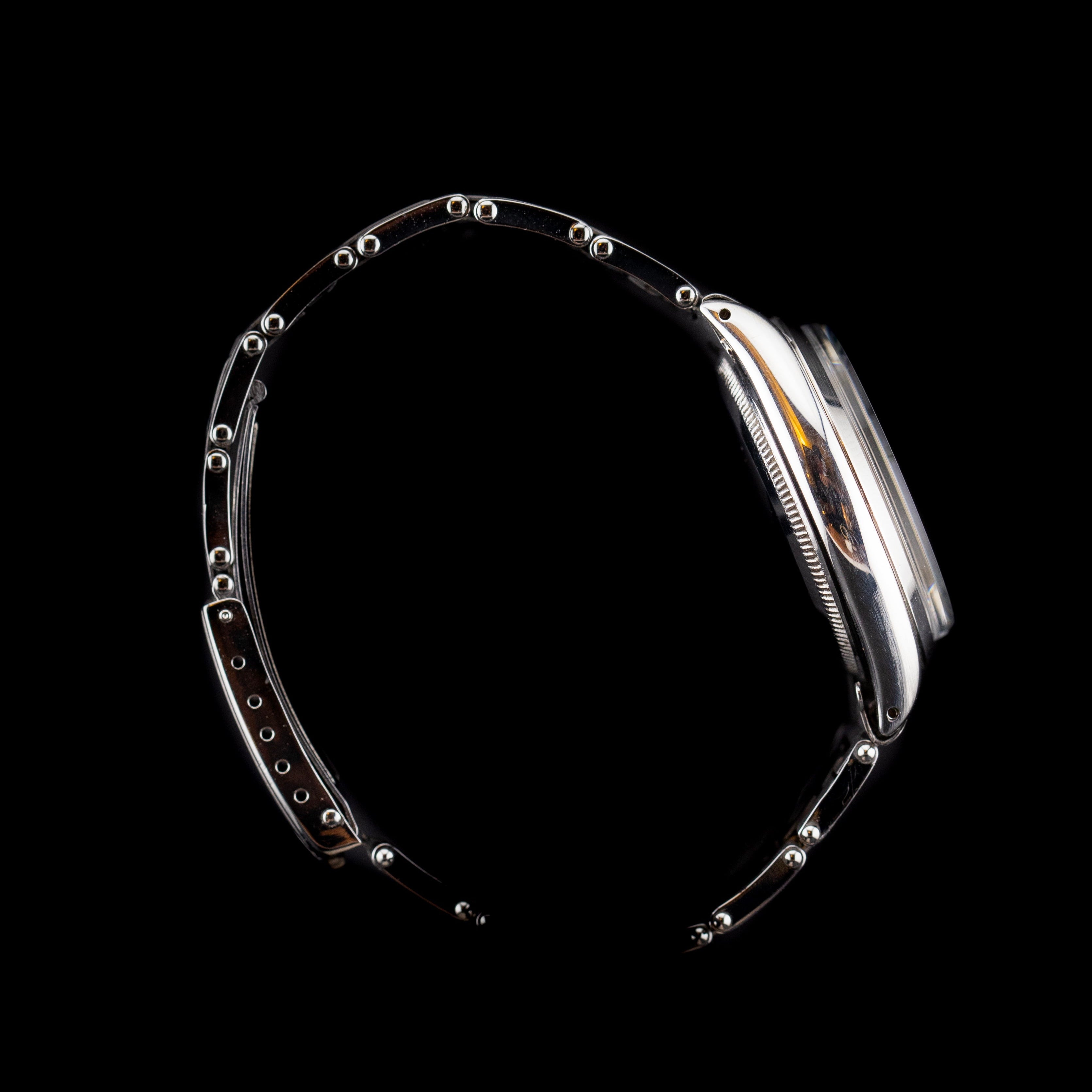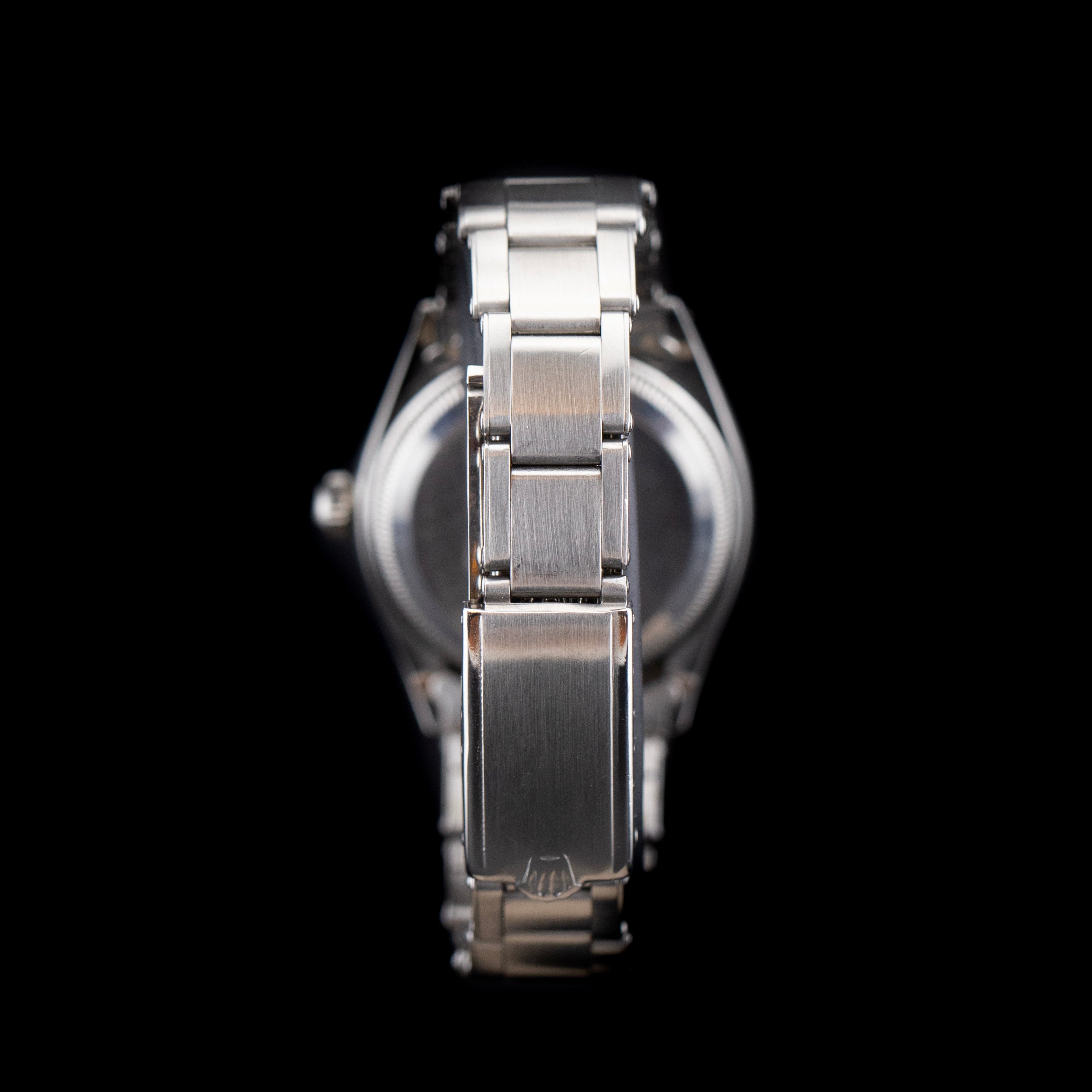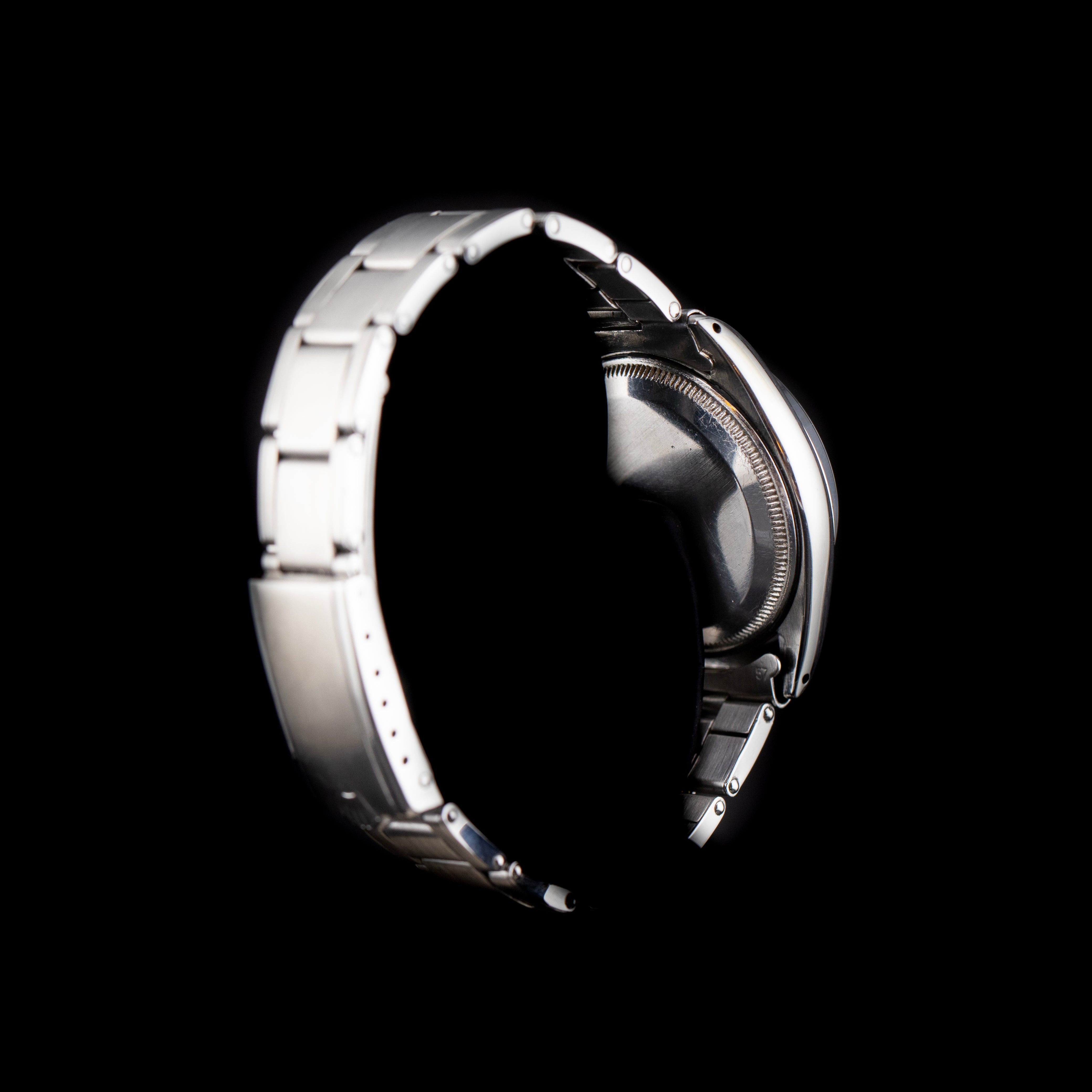 Le boîtier Oyster en acier inoxydable de 34 mm présente toutes les lignes classiques de Rolex : épaulements lisses, corne légèrement étirée, et une lunette lisse sobre et élégante. Le fond de boîte est vissé, assurant à l’époque une étanchéité remarquable, comme le voulait la tradition de la gamme Oyster.