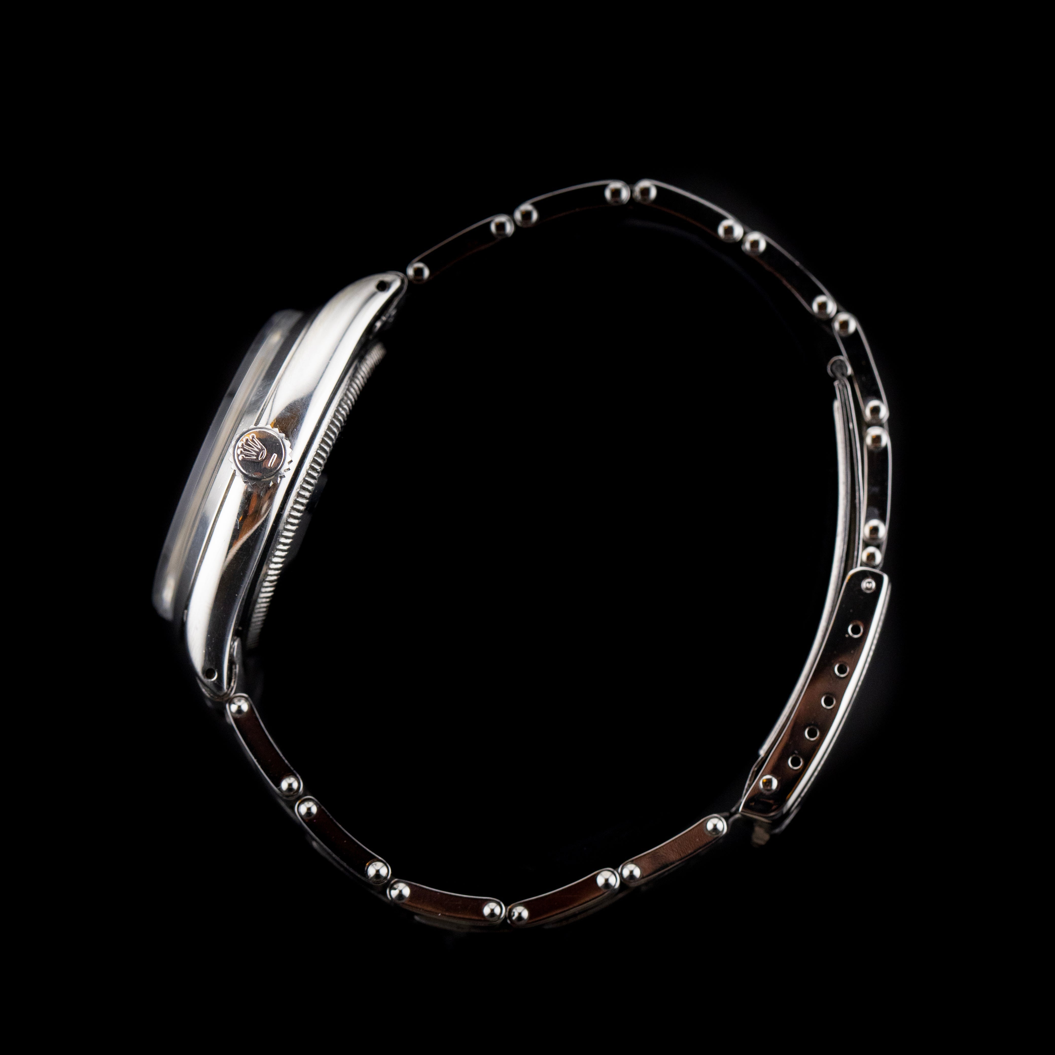 Cette pièce est accompagnée de son bracelet Oyster d’origine, en acier inoxydable, avec maillons pliés typiques des années 60. La boucle signée Rolex complète cette montre avec cohérence et authenticité, renforçant encore sa valeur de collection.