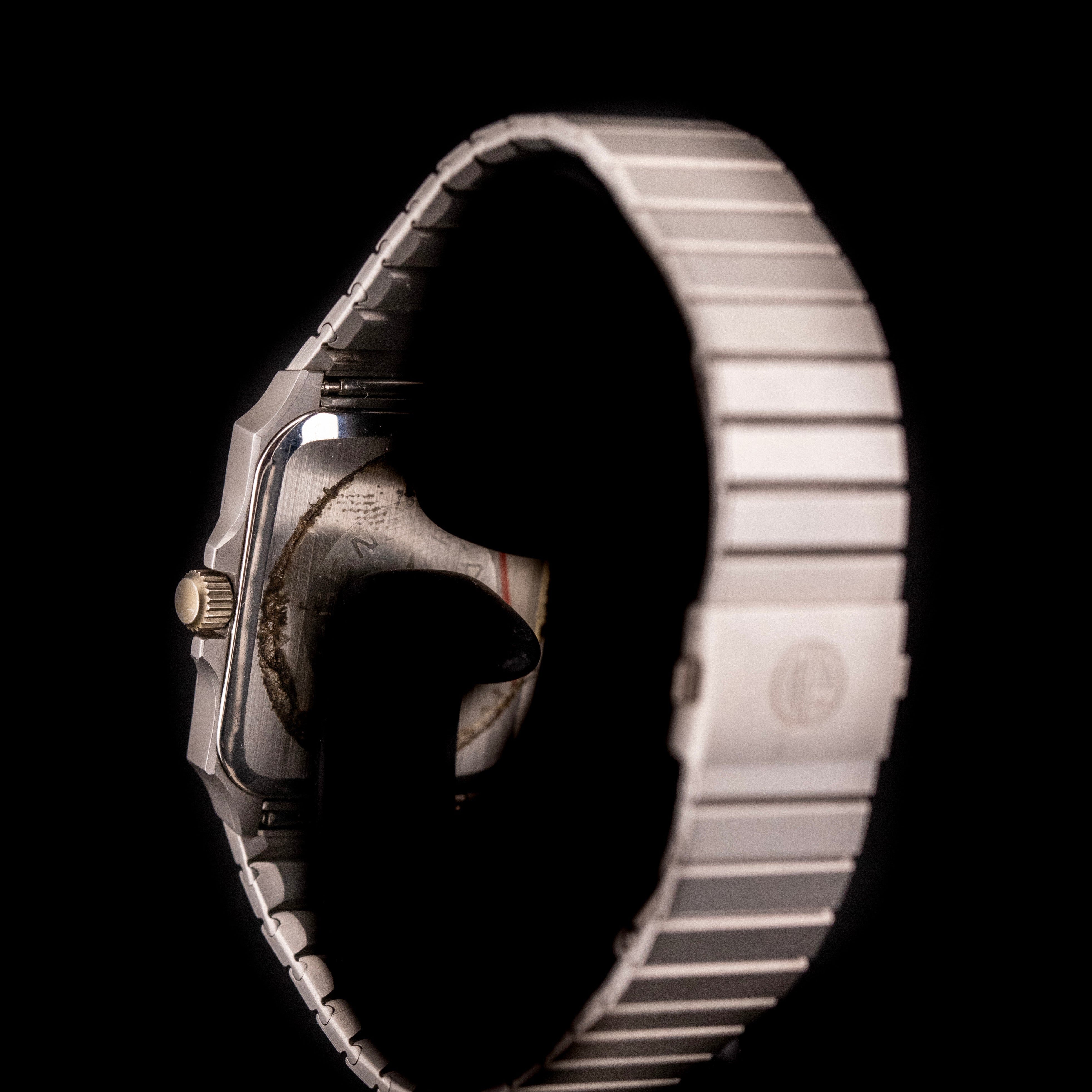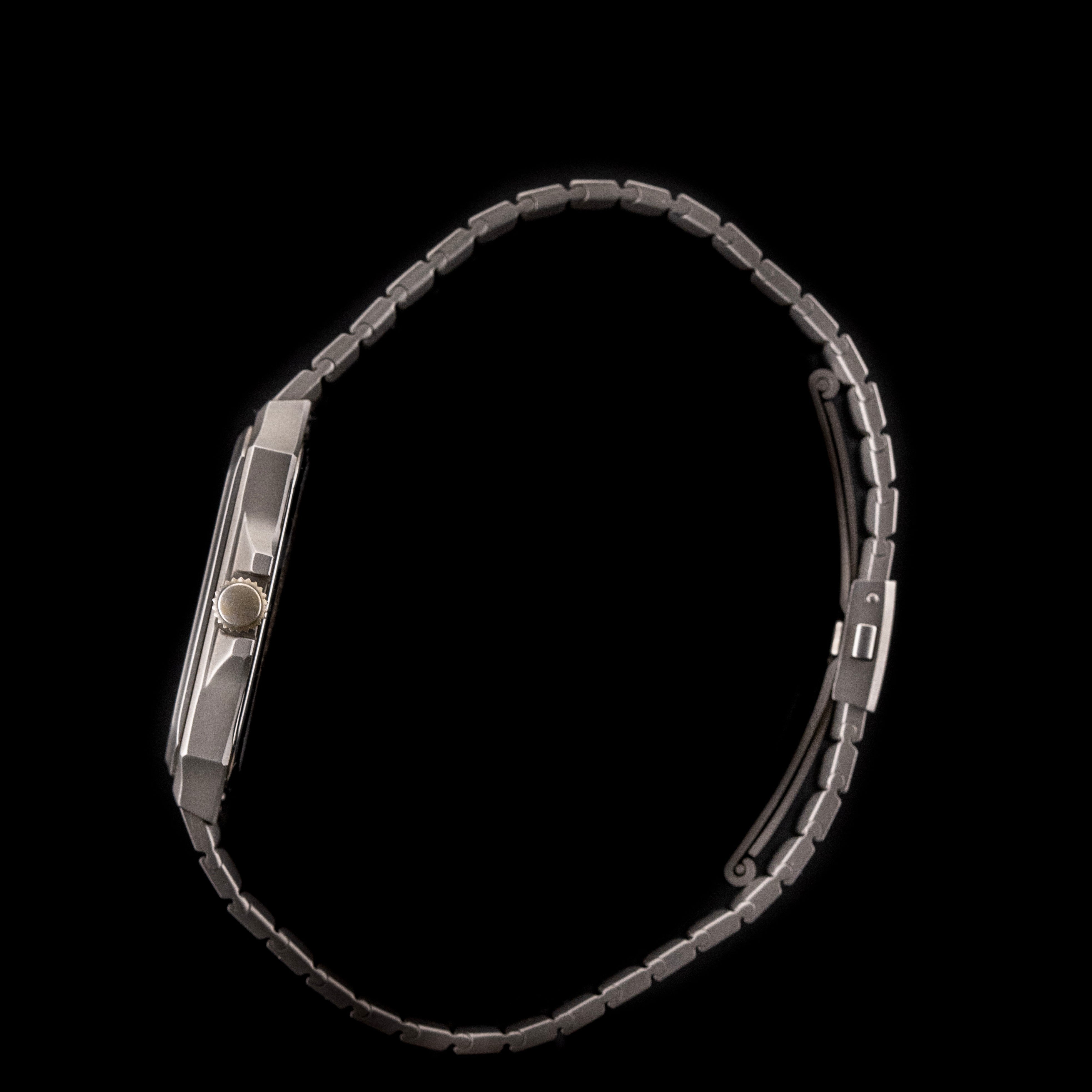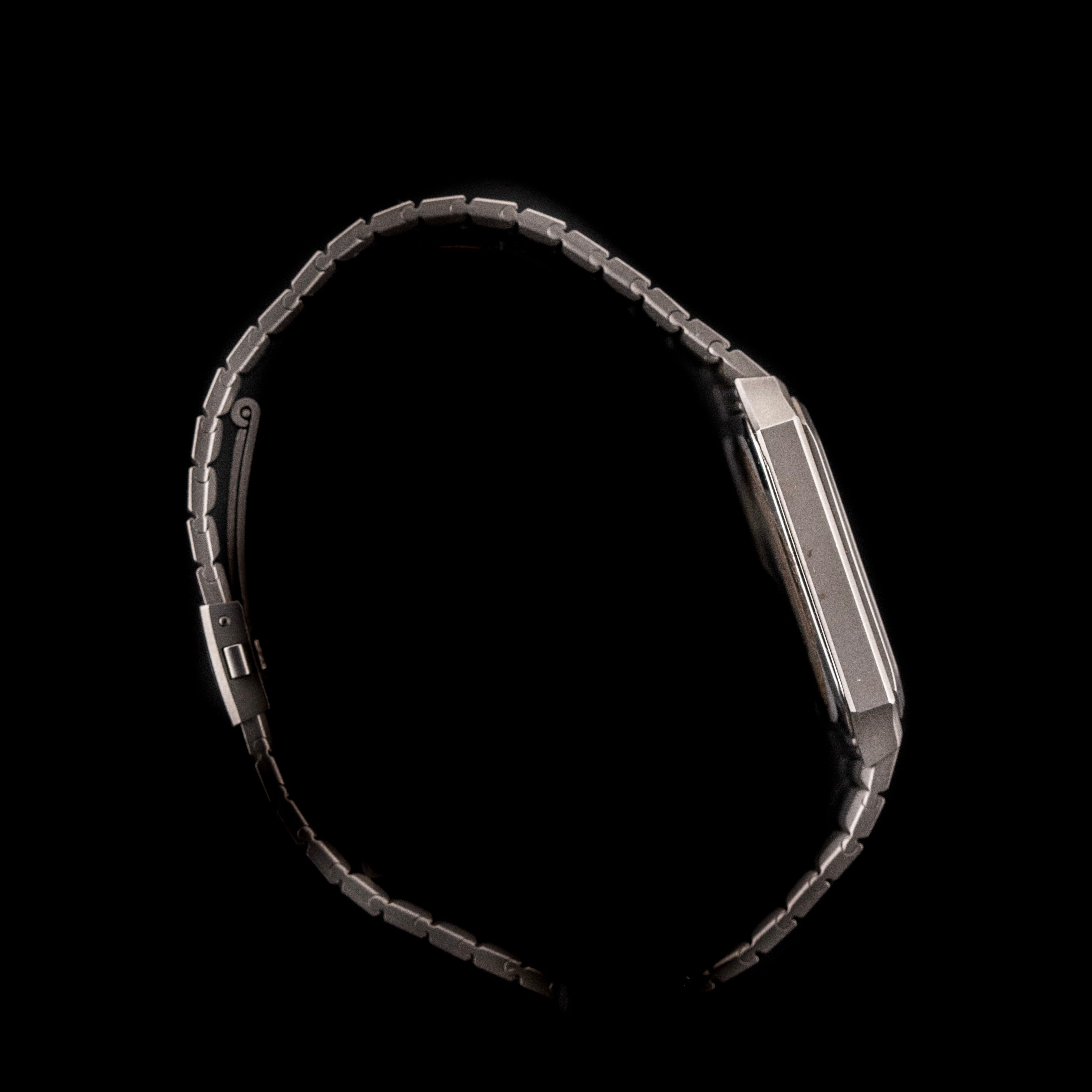 Avec son boîtier rectangulaire en acier gris, au fini brossé mat et aux angles francs, cette Aquastar est un pur produit du design horloger des années 80. Exit les rondeurs traditionnelles : ici, on parle de lignes tendues, d’un cadran sobrement texturé, souvent agrémenté d’index minimalistes et d’un guichet date discret. Ce design épuré mais distinctif était dans l’air du temps — celui d’une génération d’hommes modernes, élégants, actifs, sensibles aux détails mais attachés à une virilité affirmée.