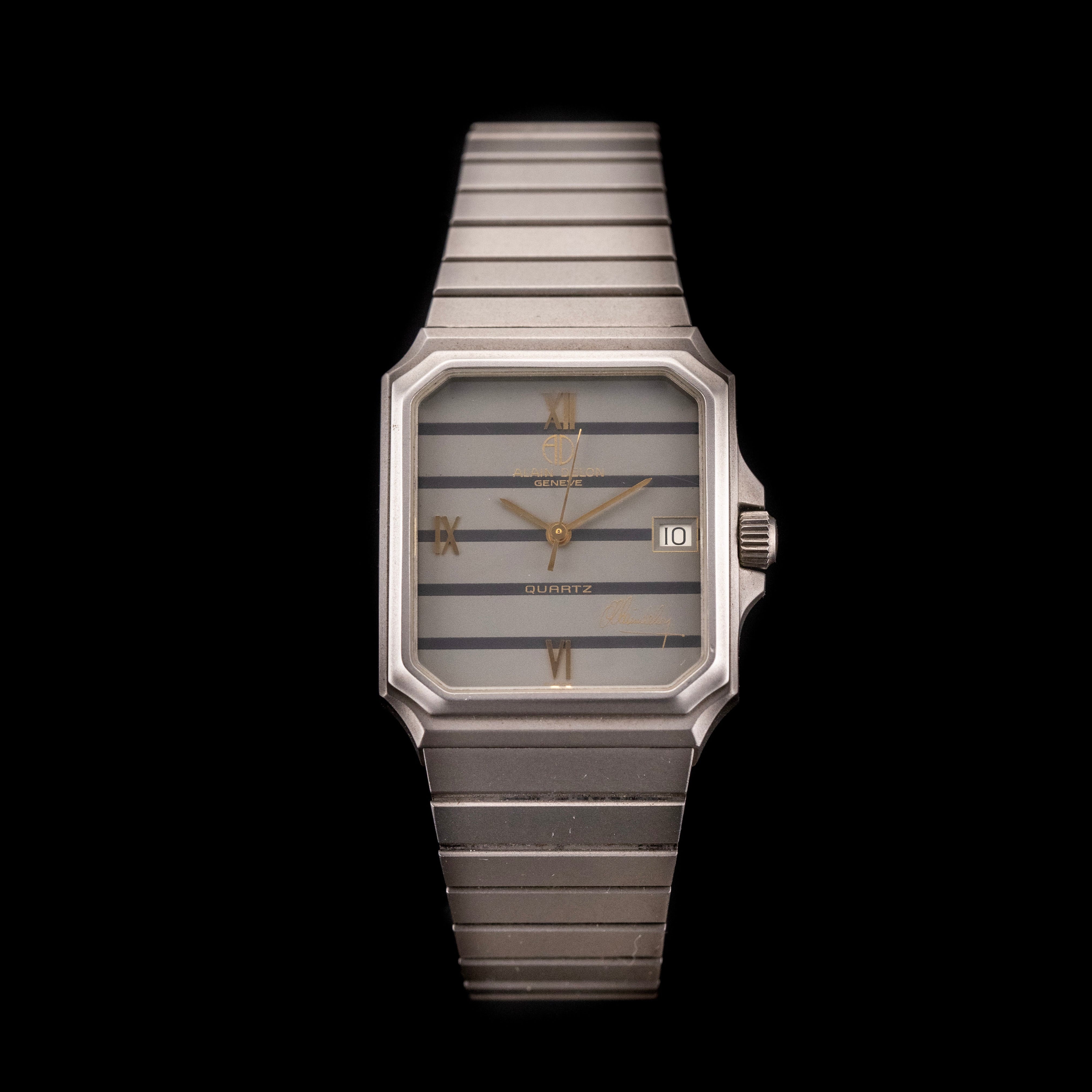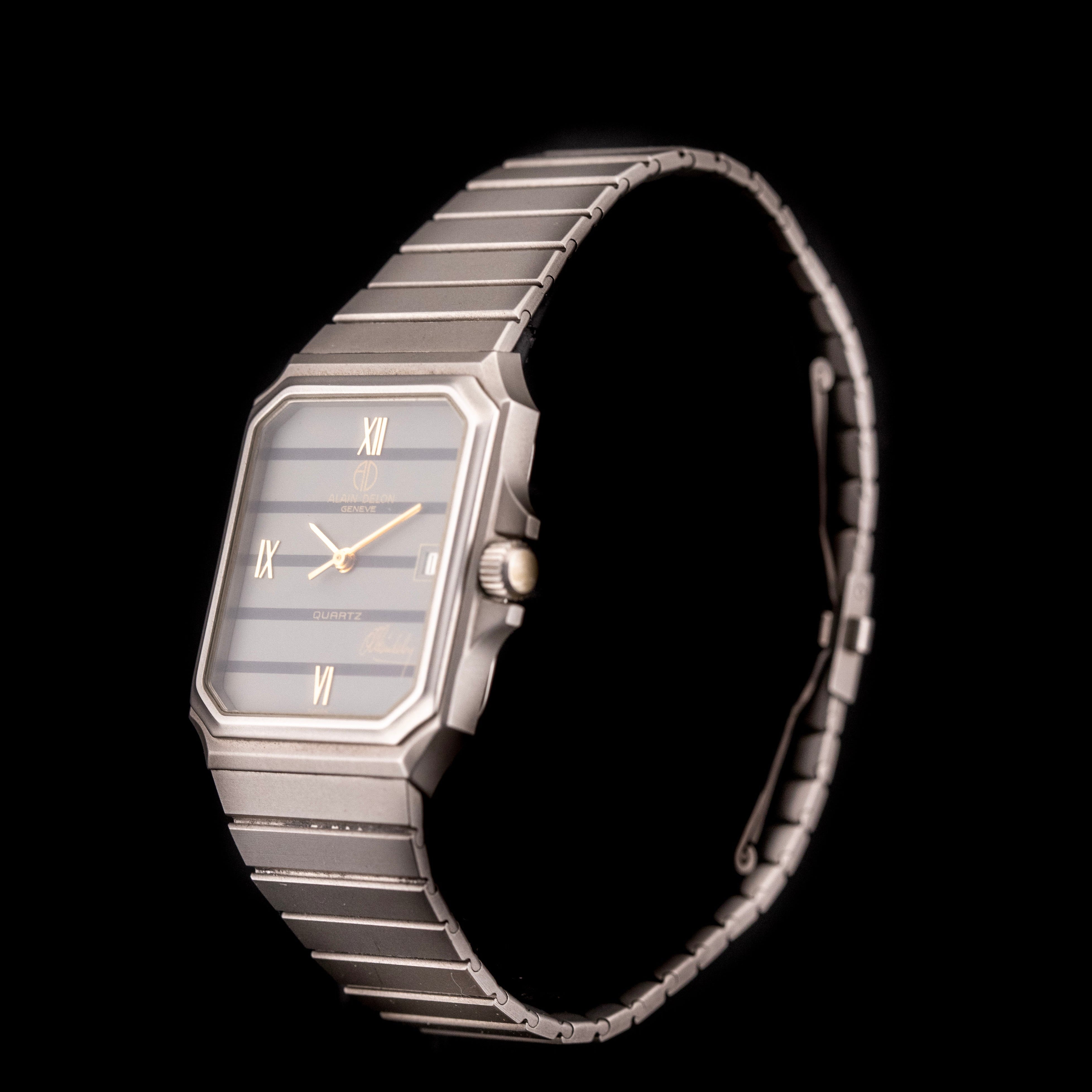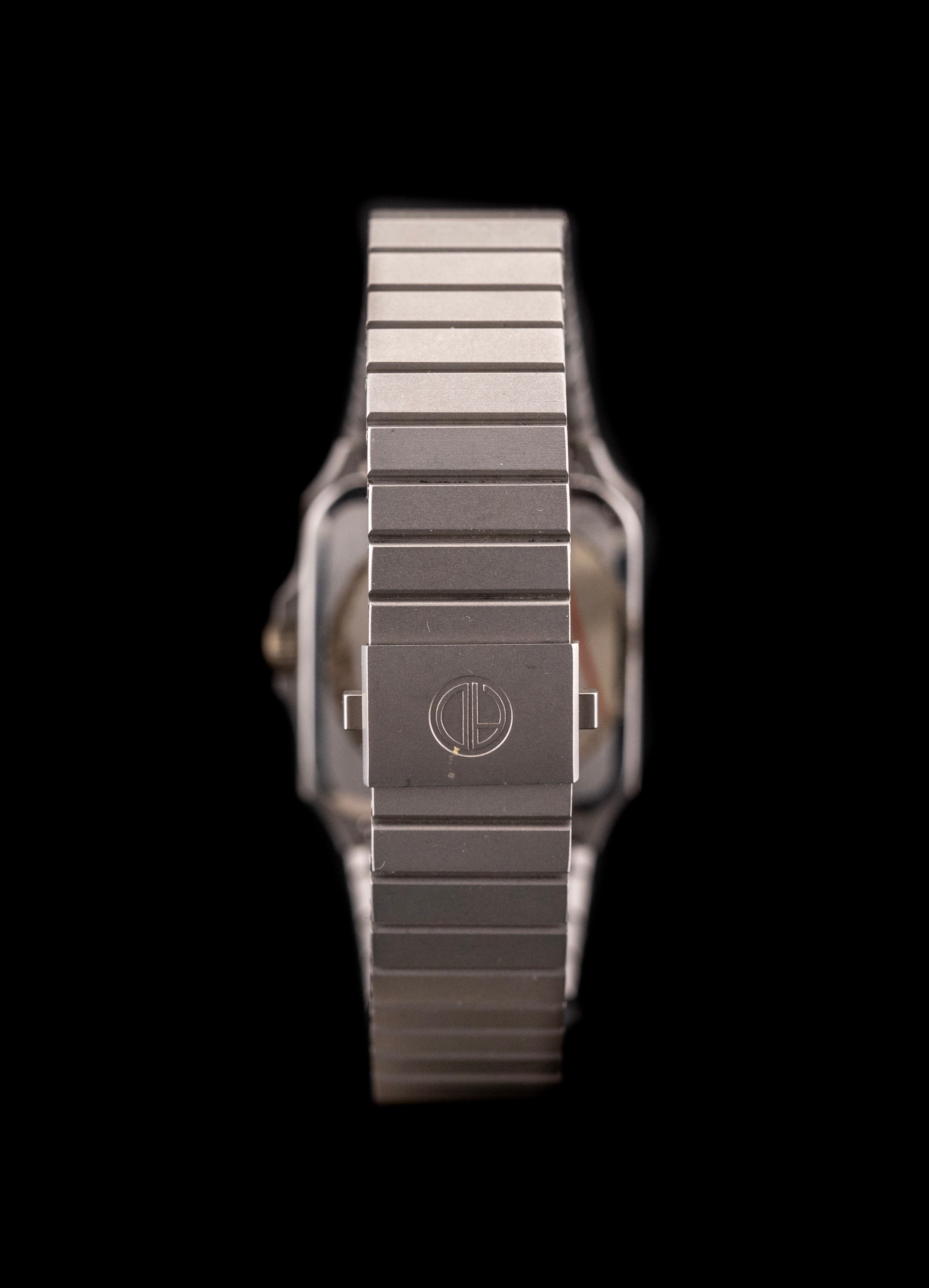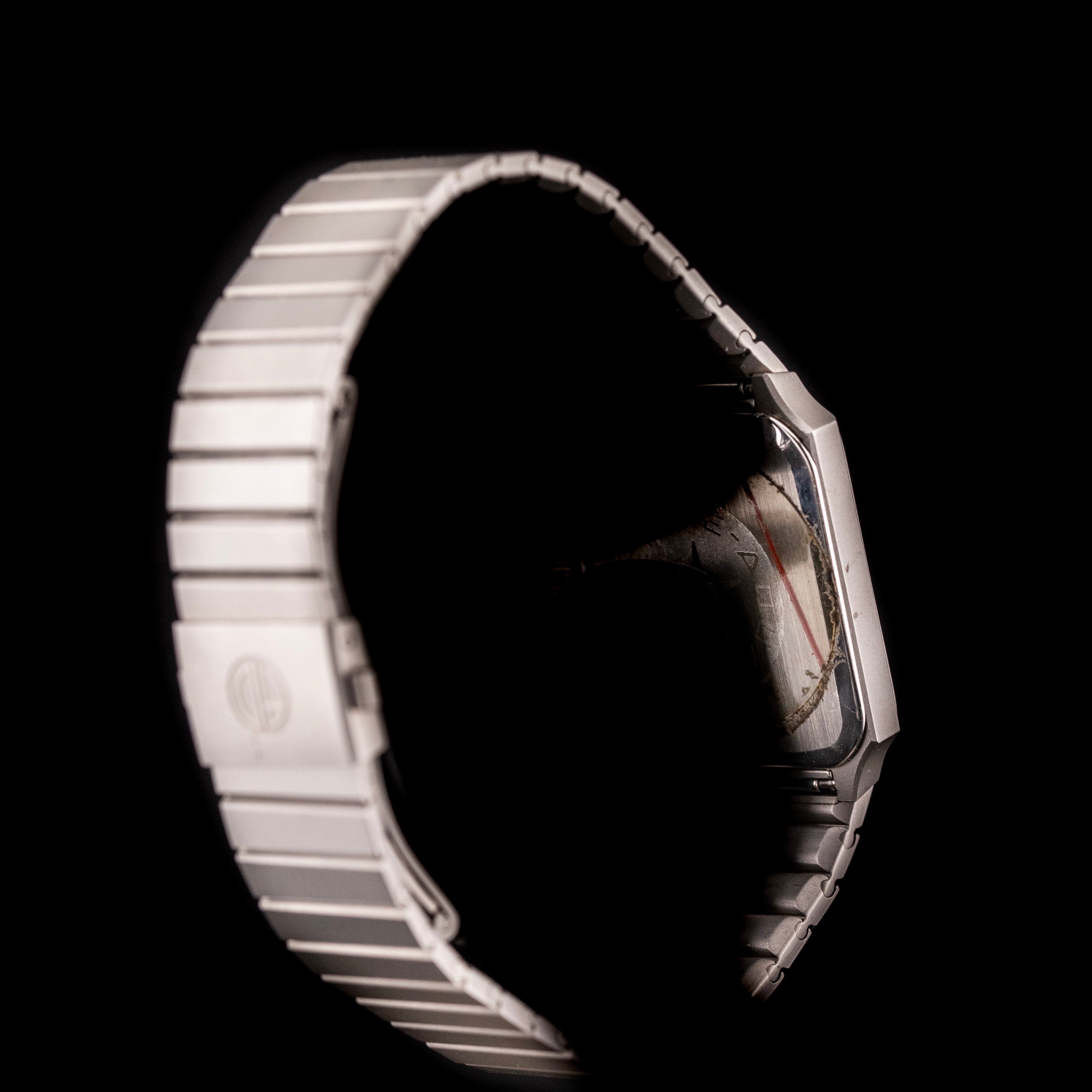 Avec son boîtier rectangulaire en acier gris, au fini brossé mat et aux angles francs, cette Aquastar est un pur produit du design horloger des années 80. Exit les rondeurs traditionnelles : ici, on parle de lignes tendues, d’un cadran sobrement texturé, souvent agrémenté d’index minimalistes et d’un guichet date discret. Ce design épuré mais distinctif était dans l’air du temps — celui d’une génération d’hommes modernes, élégants, actifs, sensibles aux détails mais attachés à une virilité affirmée.