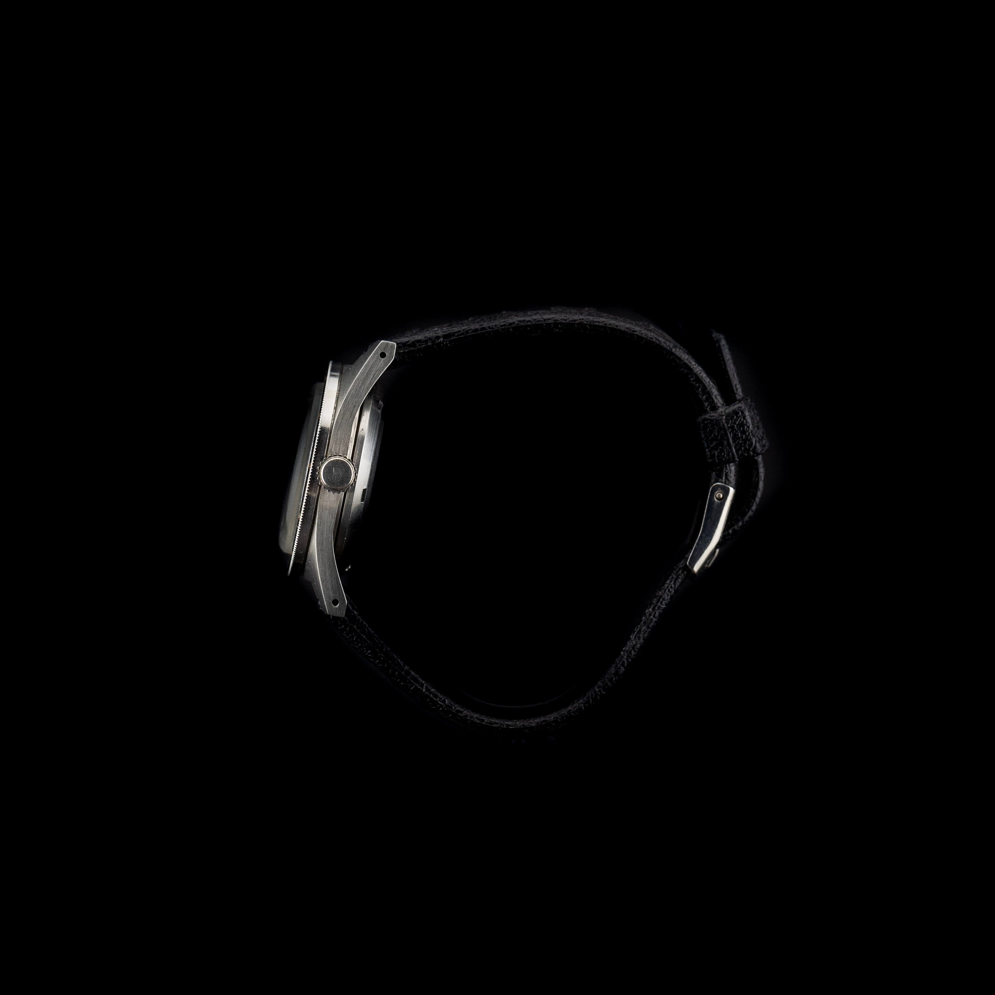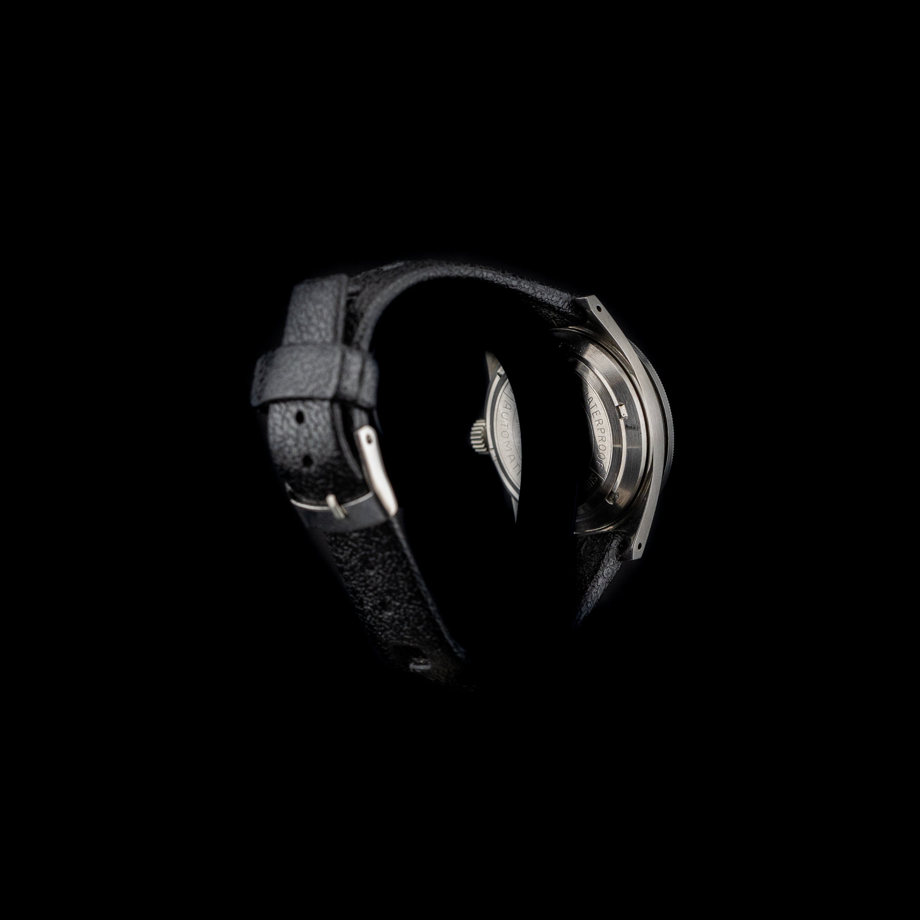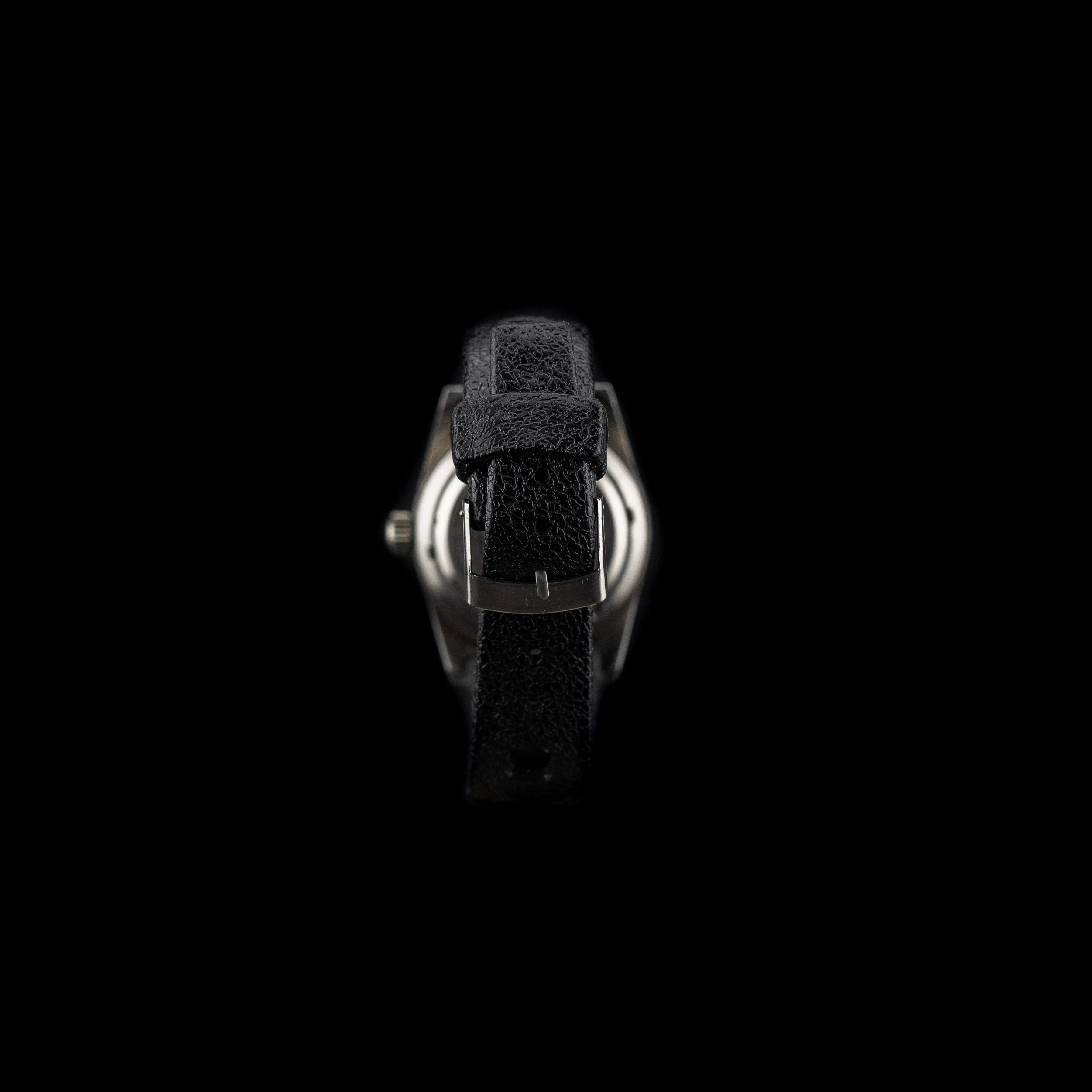 La Blancpain Fifty Fathoms “Boy’s Watch” de 1953 apparaît comme une miniature parfaitement proportionnée de la légendaire plongeuse qui a marqué l’histoire de l’horlogerie militaire. Son boîtier de 34 mm, rare pour une montre de plongée d’époque, lui confère une présence discrète mais résolument technique, sublimée par la patine naturelle du temps. La lunette en bakélite, emblématique des premières Fifty Fathoms, dévoile une profondeur visuelle singulière grâce à sa surface légèrement bombée et à ses repères luminescents vieillis, témoins de nombreux récits silencieux. Le cadran noir mat, sobre et fonctionnel, accueille des index généreusement luminescents, aux teintes ivoire, et des aiguilles simples mais expressives, pensées pour une lisibilité optimale sous l’eau. L’ensemble est complété par un bracelet tropique d’époque, souple et perforé, qui renforce le charme vintage de la pièce tout en rappelant l’univers utilitaire pour lequel elle a été conçue. De son format inhabituel à ses détails iconiques, cette “Boy’s Watch” incarne une esthétique rare, à la fois historique, sportive et profondément attachante.