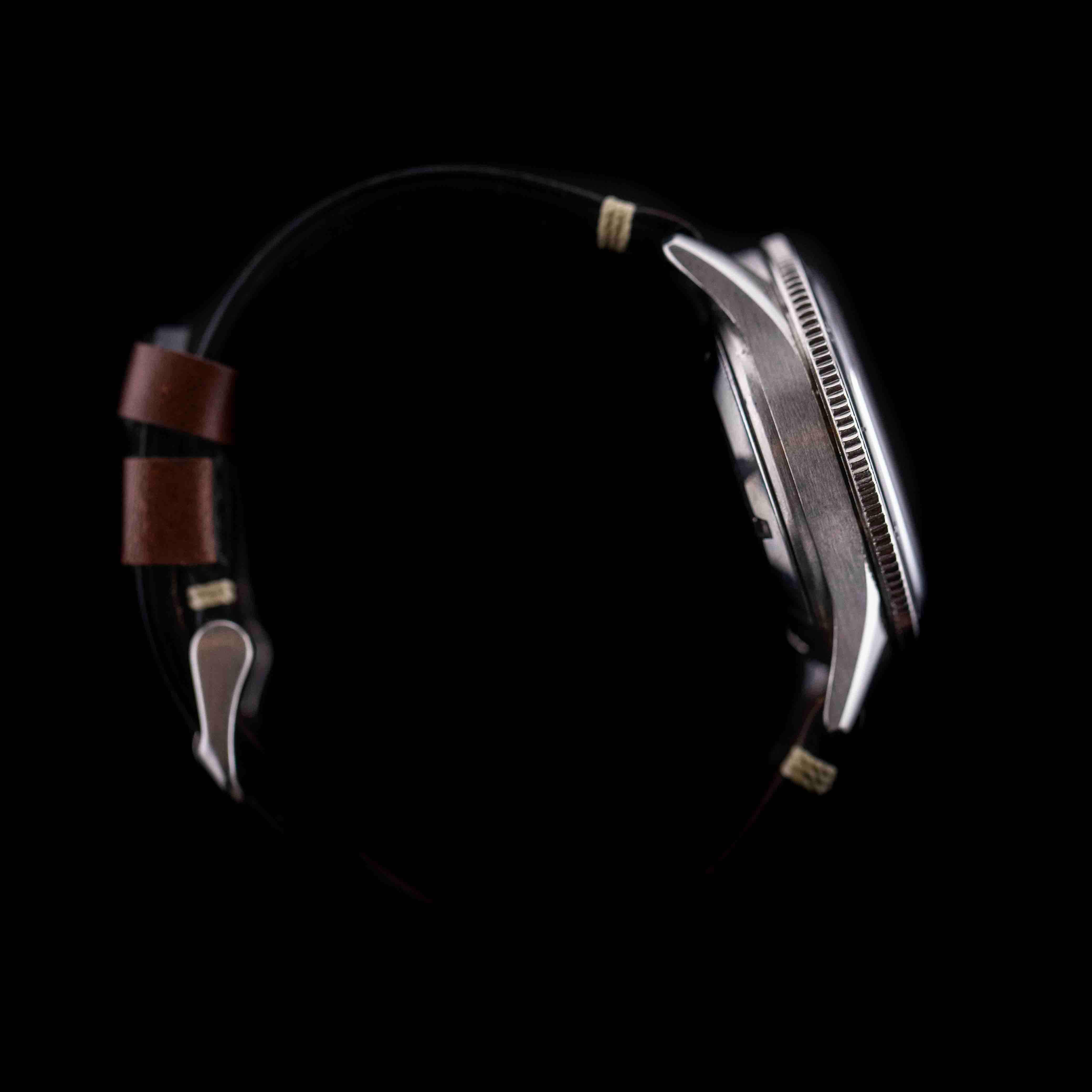 Le boitier massif est serti d'un magnifique cadran noir ("Black dial").La montre est habillée d'un bracelet cuir avec ardillon or d'origine.