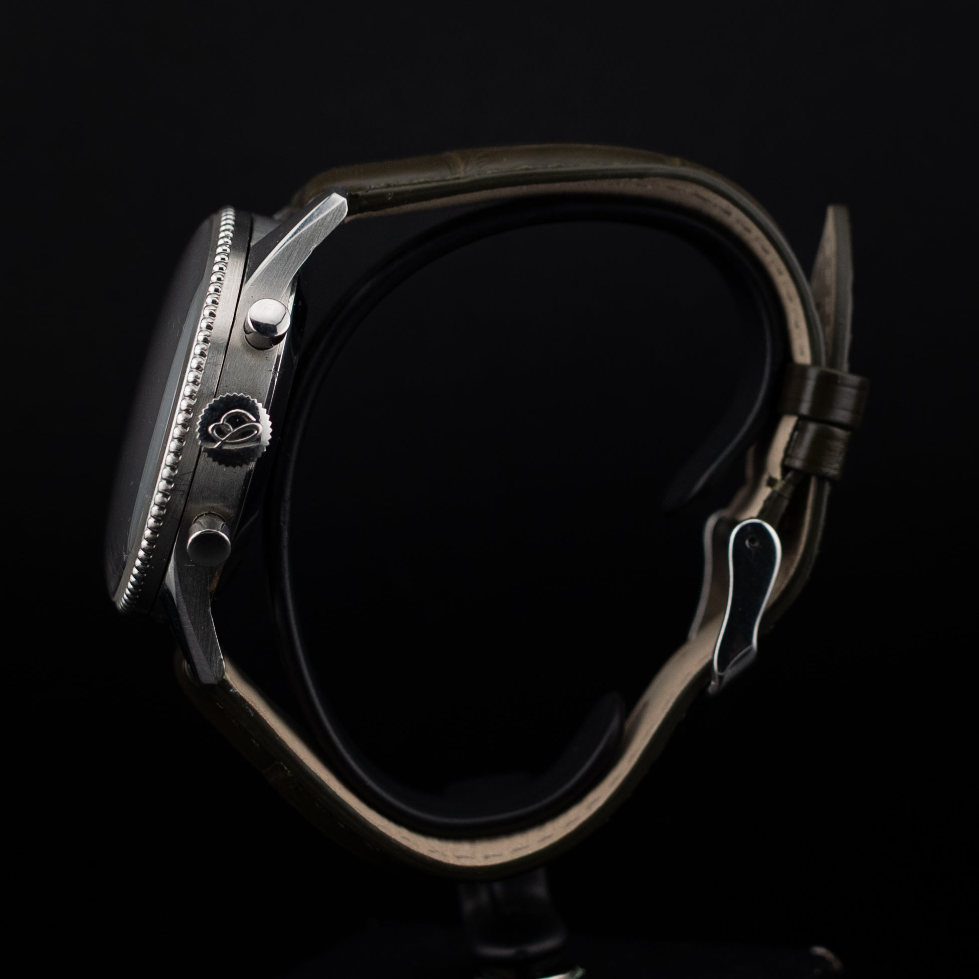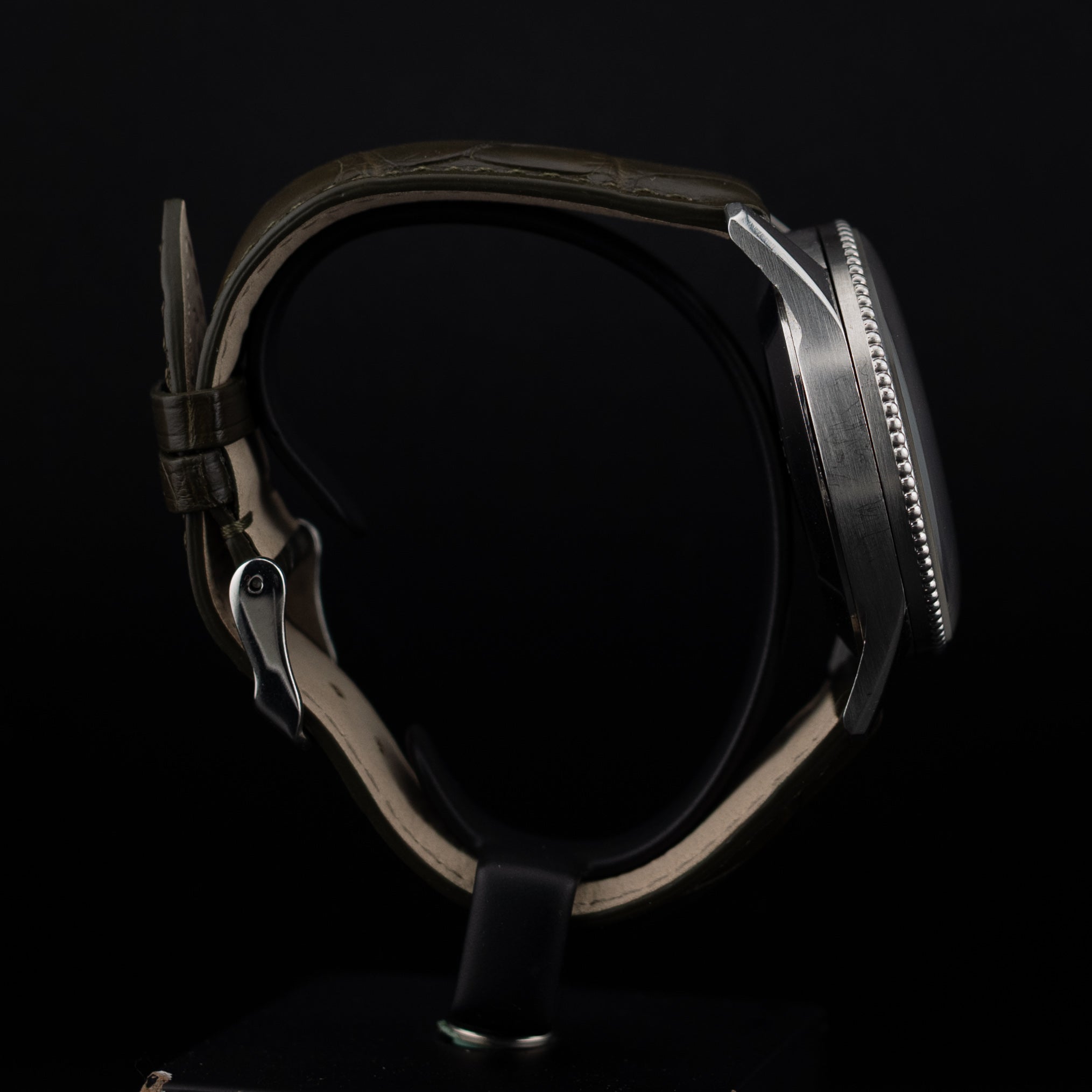 Les chiffres arabes surdimensionnés recouverts de radium améliorent encore la lisibilité et contrastent efficacement avec le cadran noir.