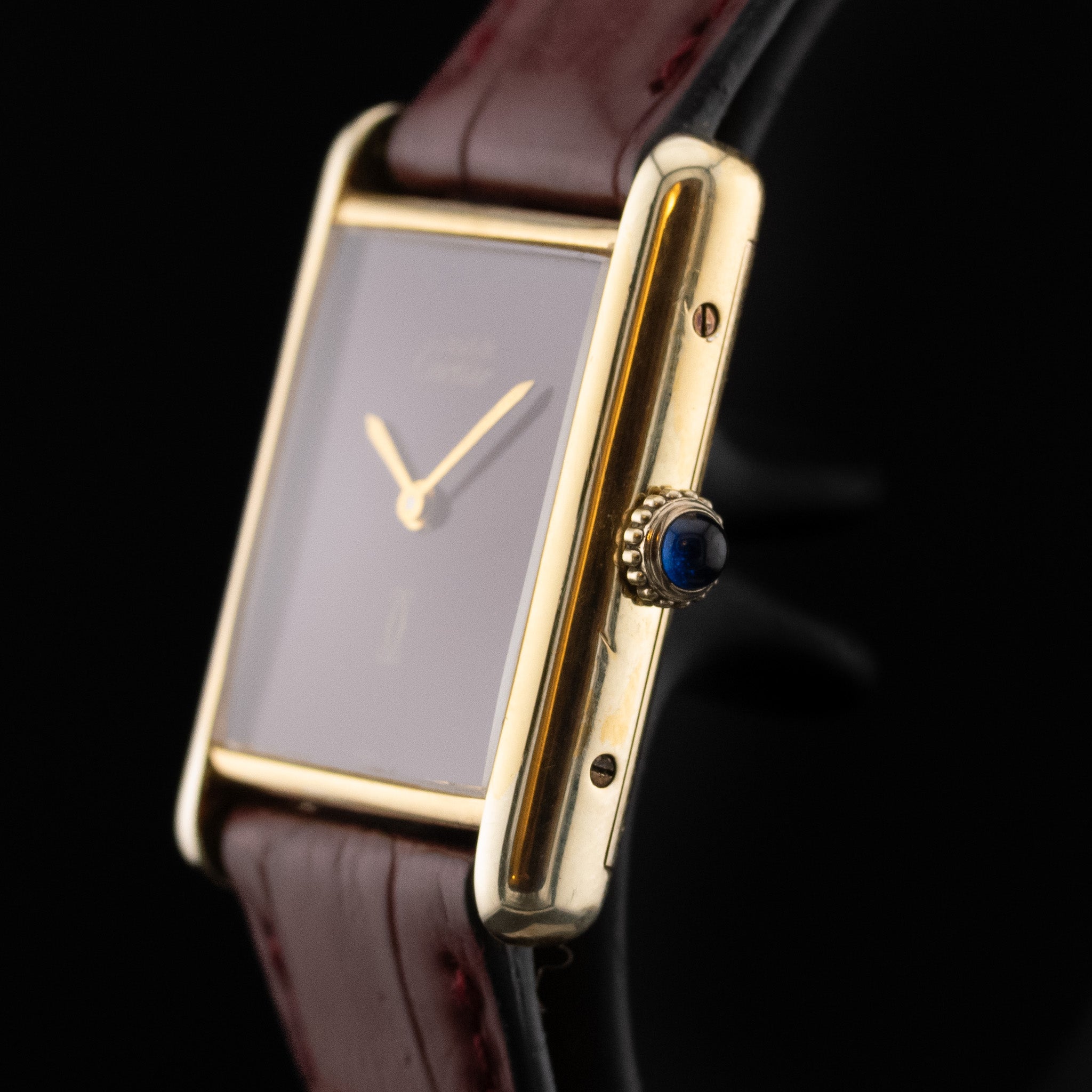 Le boîtier rectangulaire est réalisé en vermeil (plaqué or sur base d’argent massif), offrant une brillance chaleureuse et précieuse au poignet. Les proportions harmonieuses et les lignes nettes soulignent l’esthétique Art déco propre à la Tank, tandis que la couronne est sertie d’un cabochon bleu, détail signature de la Maison.