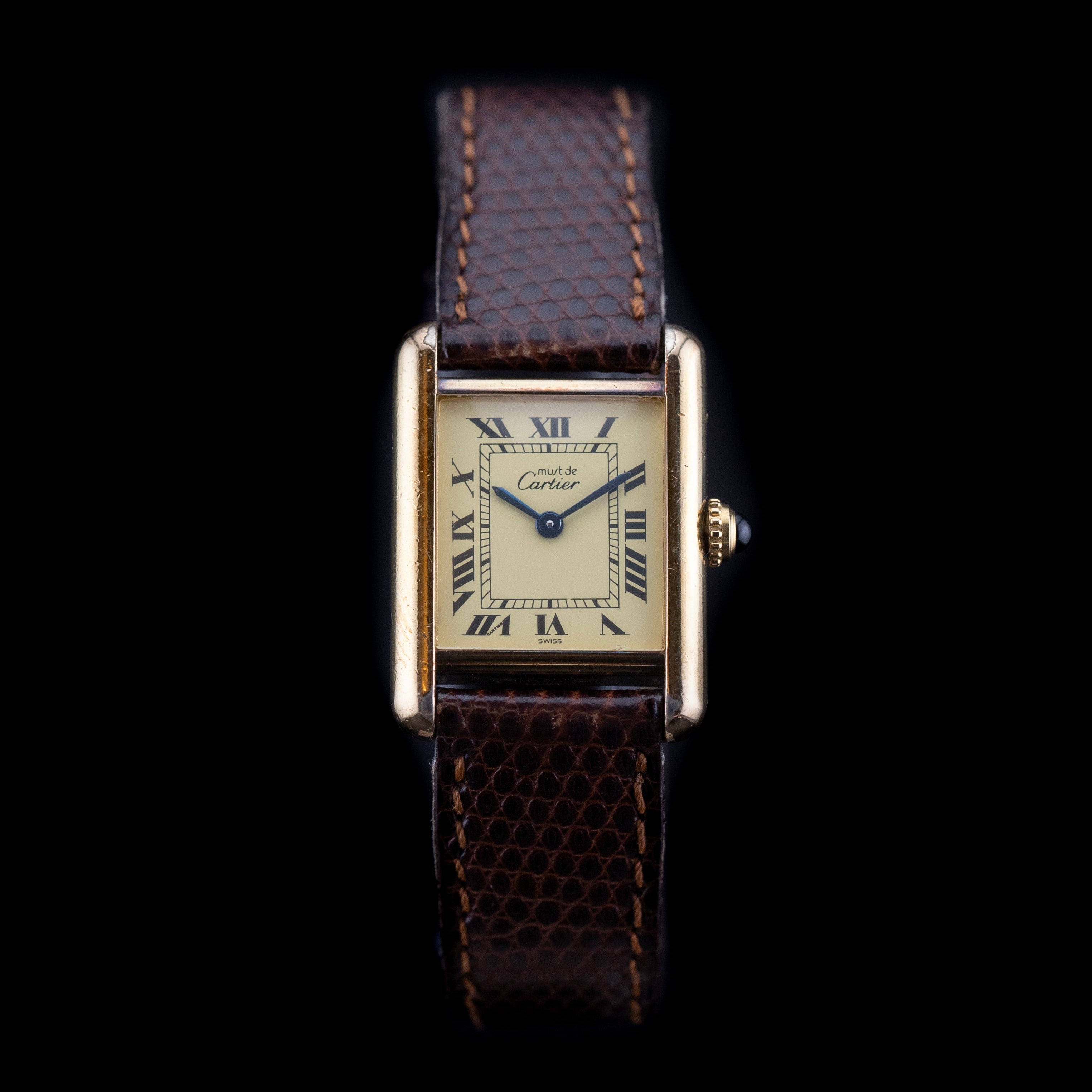 Ce modèle spécifique, réalisé en vermeil — un subtil alliage associant l'argent massif et un placage en or jaune 18 carats — exprime avec finesse le goût de Cartier pour les matériaux nobles et les finitions soignées. Son boîtier rectangulaire, aux proportions équilibrées et à la géométrie emblématique, reflète une époque où le design se faisait sans excès, dans une recherche de pureté des lignes et d’harmonie visuelle. Le temps semble suspendu sur son cadran crème patiné, un cadran d’origine dont la teinte chaleureuse renforce encore le charme vintage de la pièce. Les chiffres romains, imprimés avec la rigueur typique de la maison, tracent un chemin de fer classique où dansent des aiguilles glaives en acier bleui, apportant une touche de profondeur et de contraste.