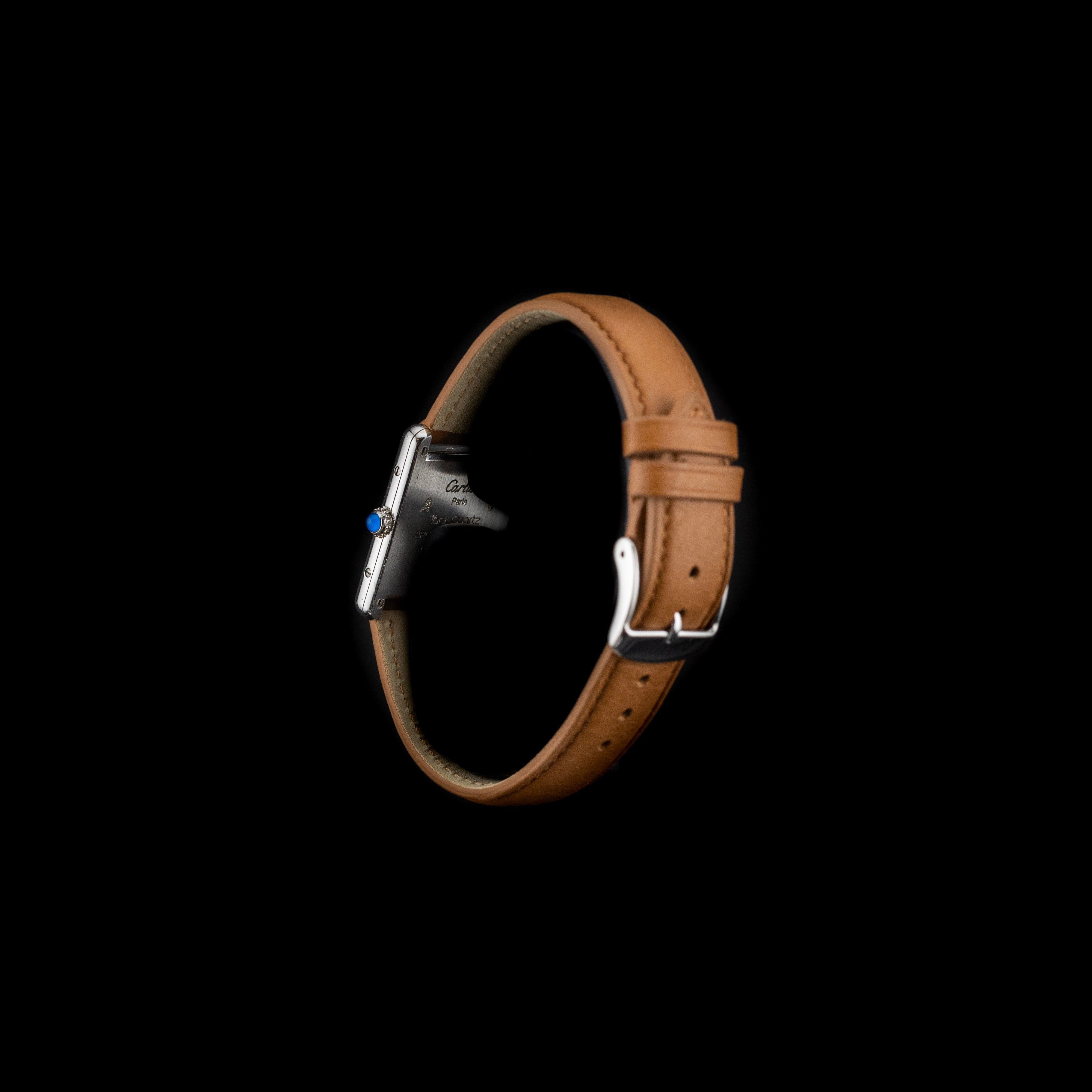 Son boîtier en argent massif présente des proportions harmonieuses et une finition soignée, caractéristiques des productions Cartier de cette période. Le cadran blanc et bleu, signature visuelle forte, offre une lecture claire et élégante de l’heure, sublimée par les chiffres romains emblématiques de la marque et le chemin de fer minutieusement dessiné. L’ensemble est animé par un mouvement quartz, garantissant précision et fiabilité au quotidien.
