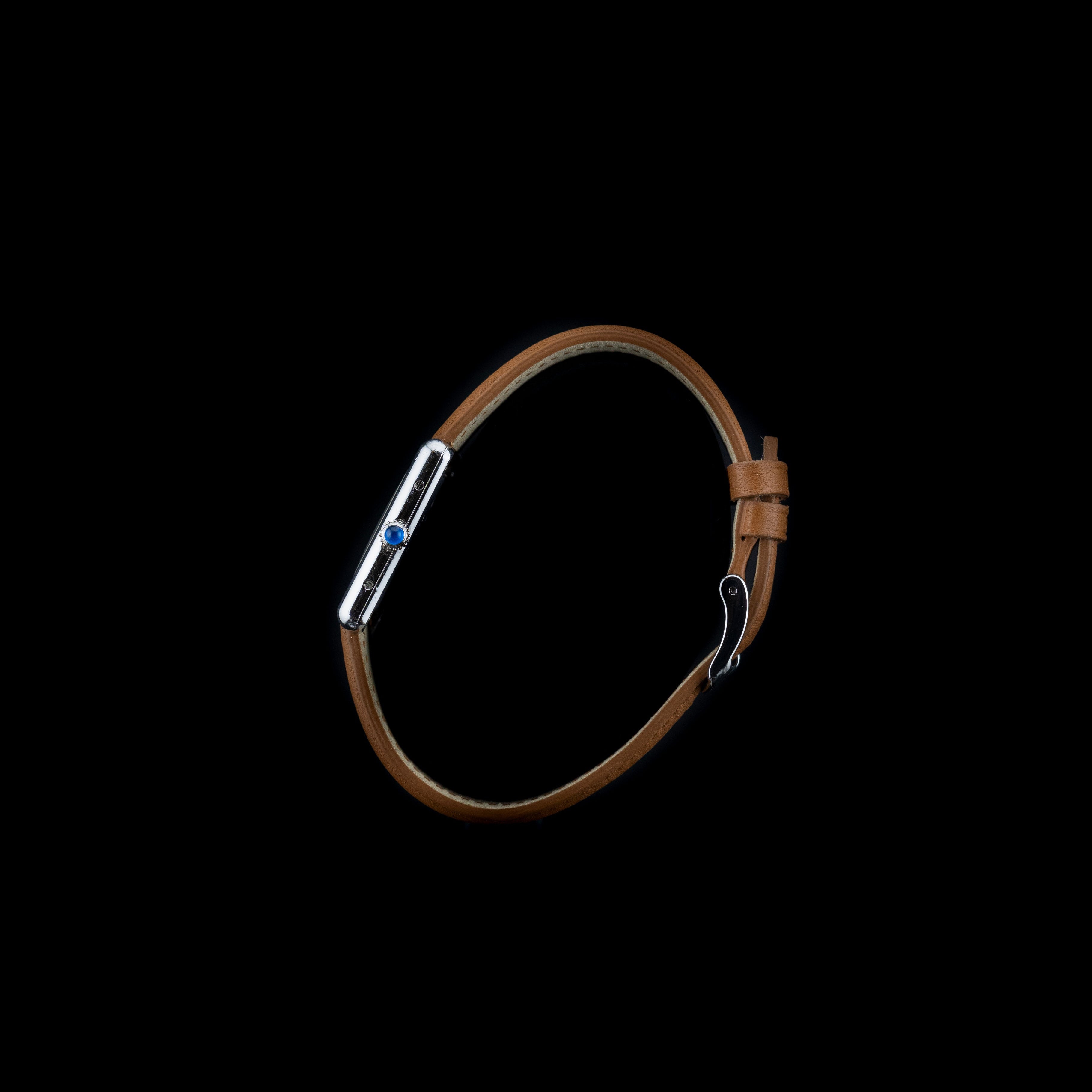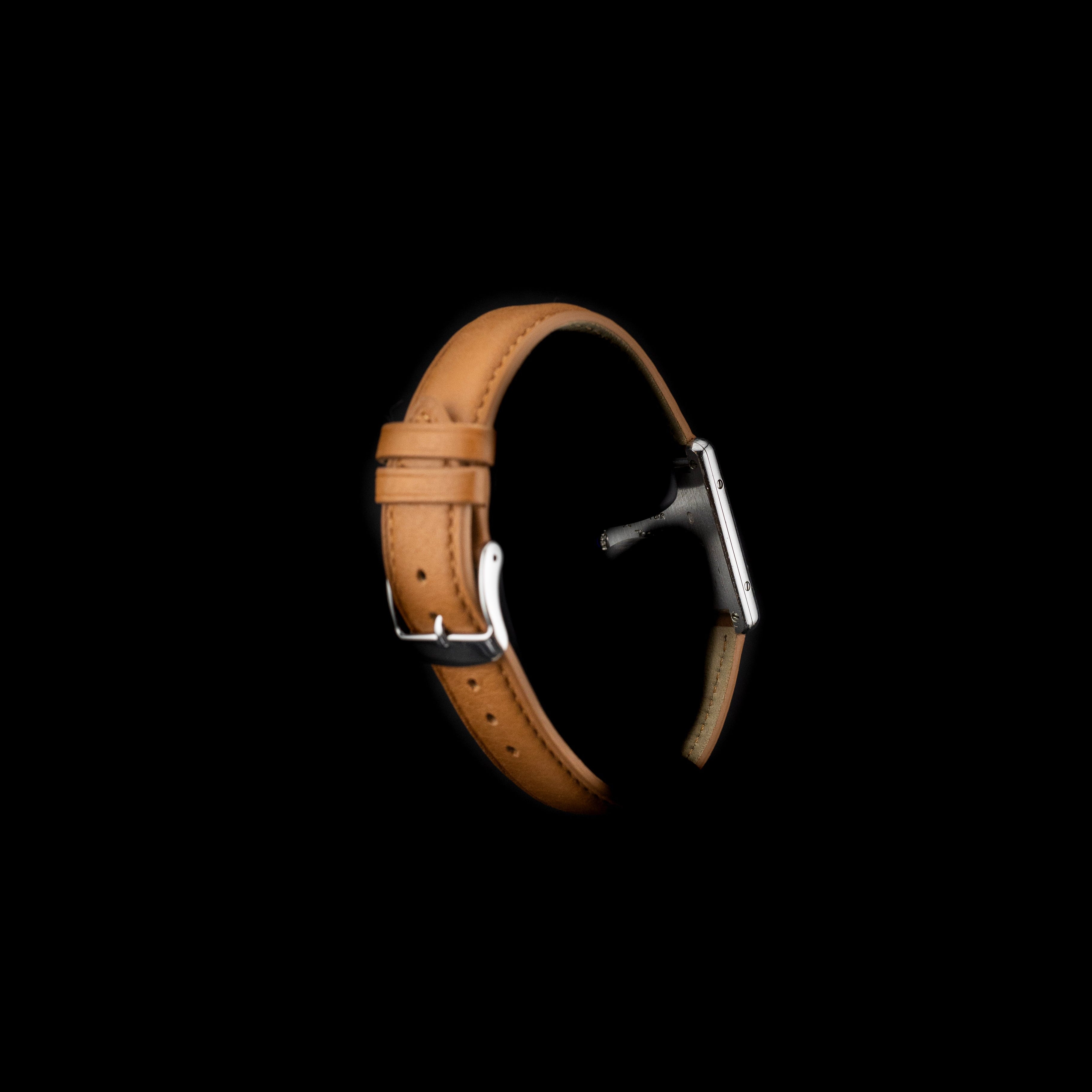 La montre est rehaussée par la célèbre couronne ornée d’un cabochon en saphir, détail iconique de Cartier, qui apporte une touche de luxe discrète et immédiatement reconnaissable. Cette pierre bleue, symbole de la Maison, vient parfaire l’équilibre esthétique de la pièce et souligne son caractère prestigieux.