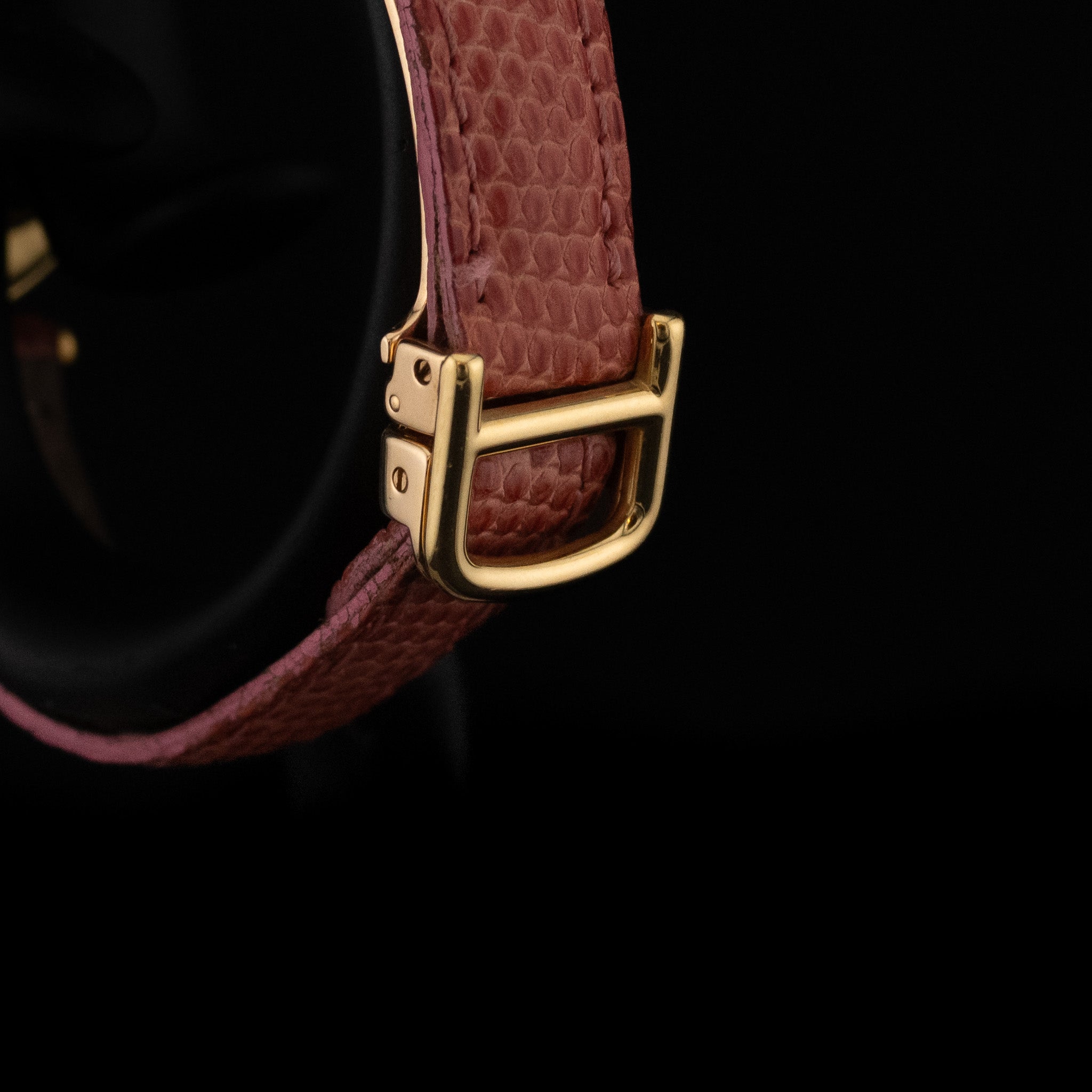 La montre est montée sur un bracelet en cuir rose, délicatement choisi pour souligner la chaleur de l’or rose du boîtier. Il est équipé d’une boucle déployante en or, apportant sécurité, confort et continuité esthétique jusque dans les moindres détails.
