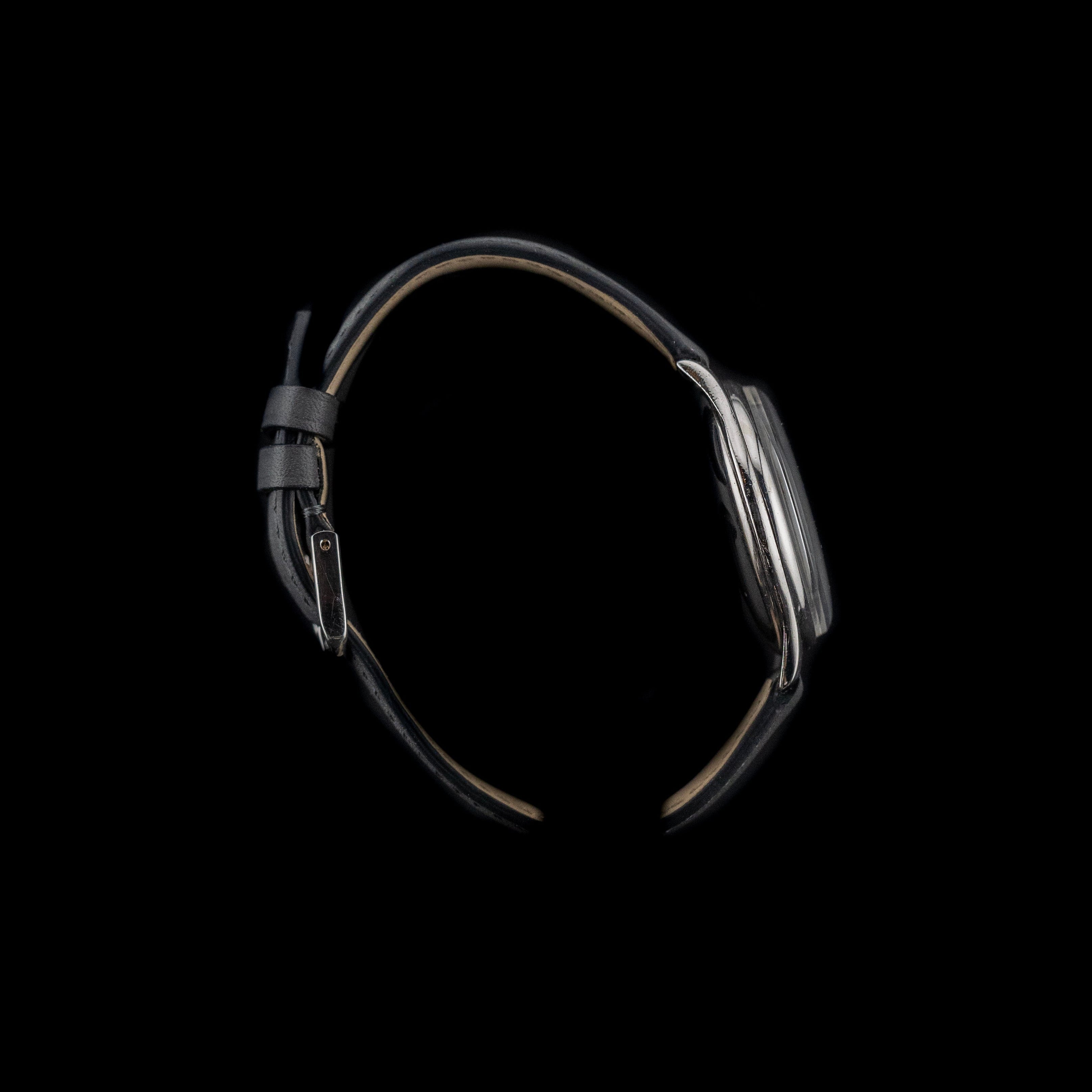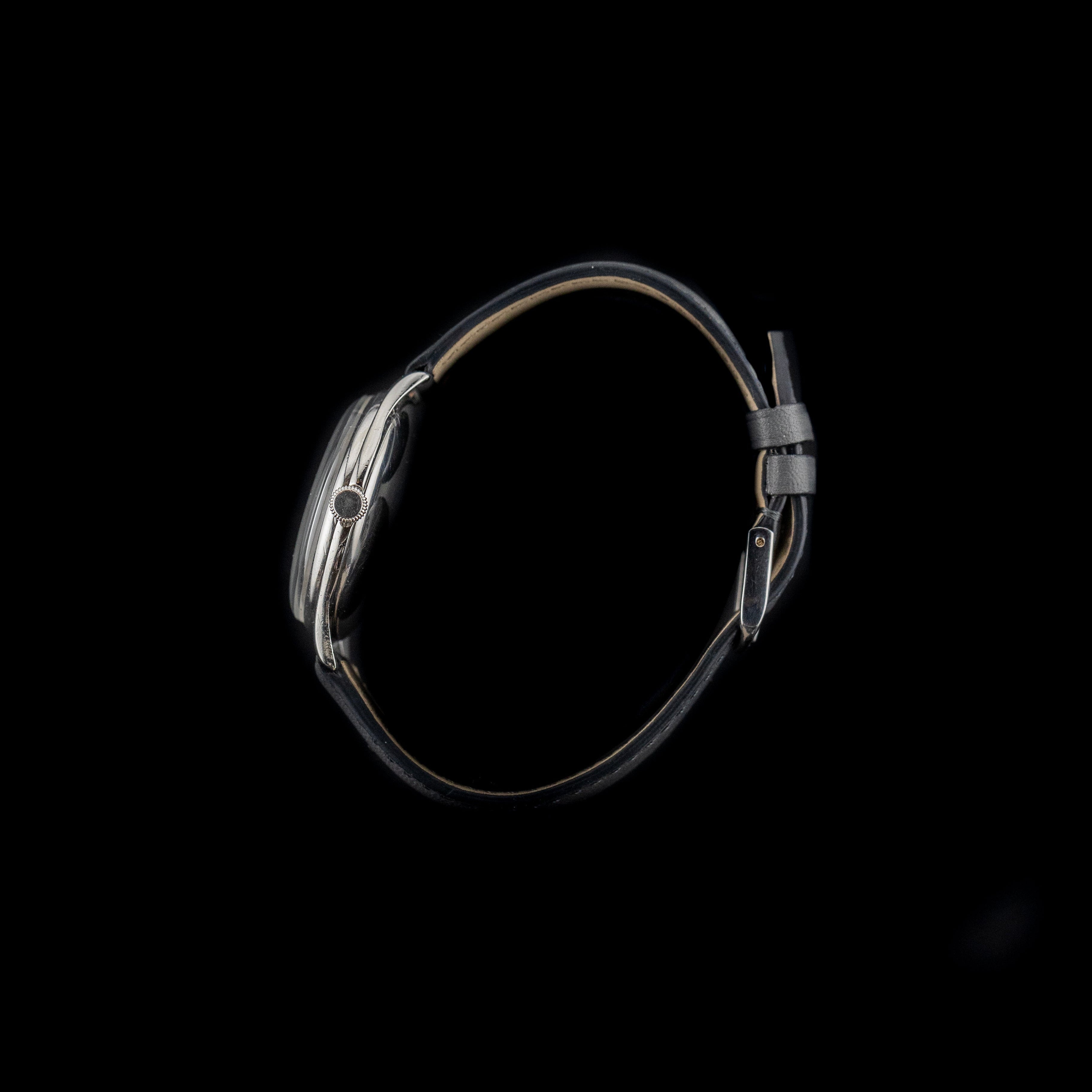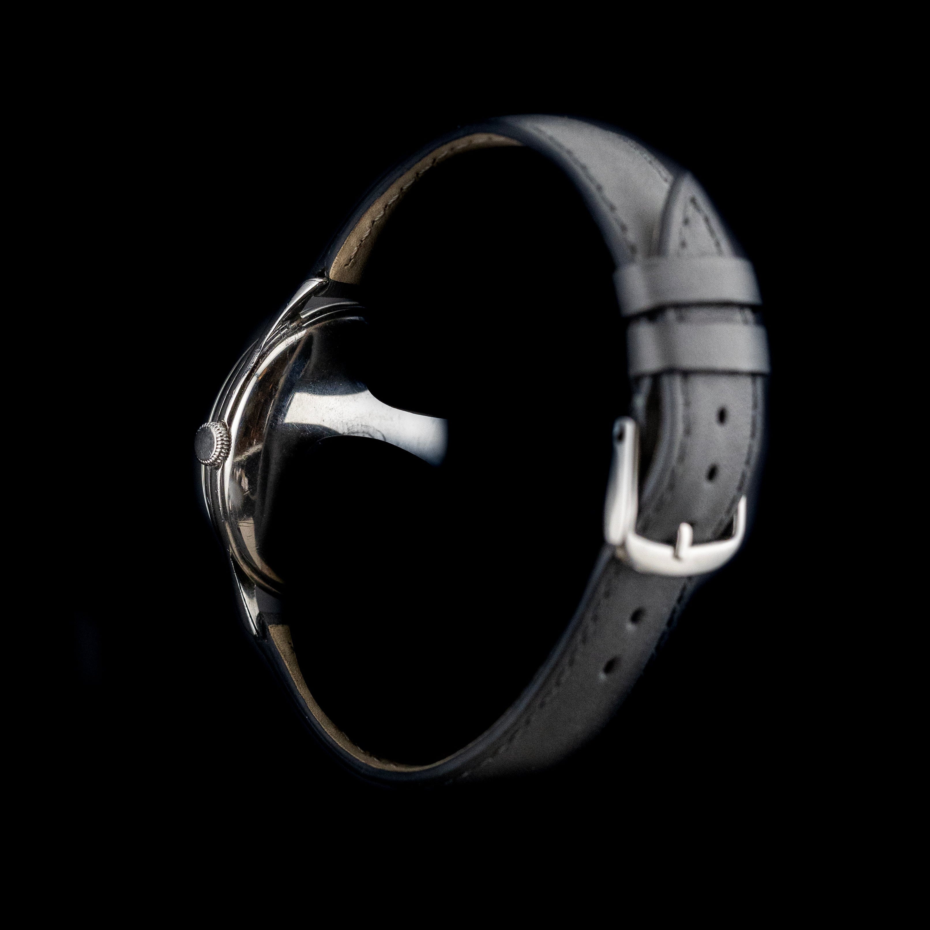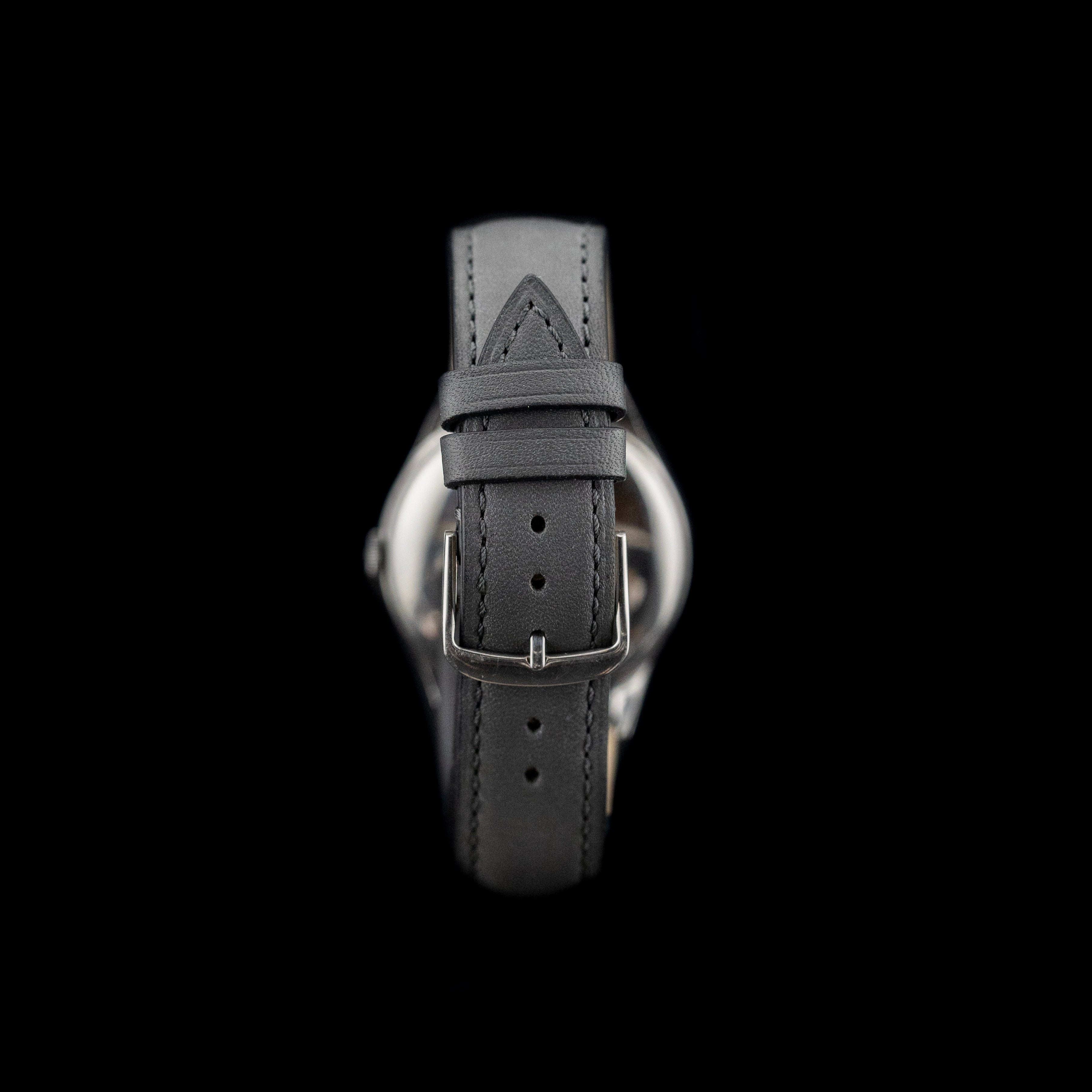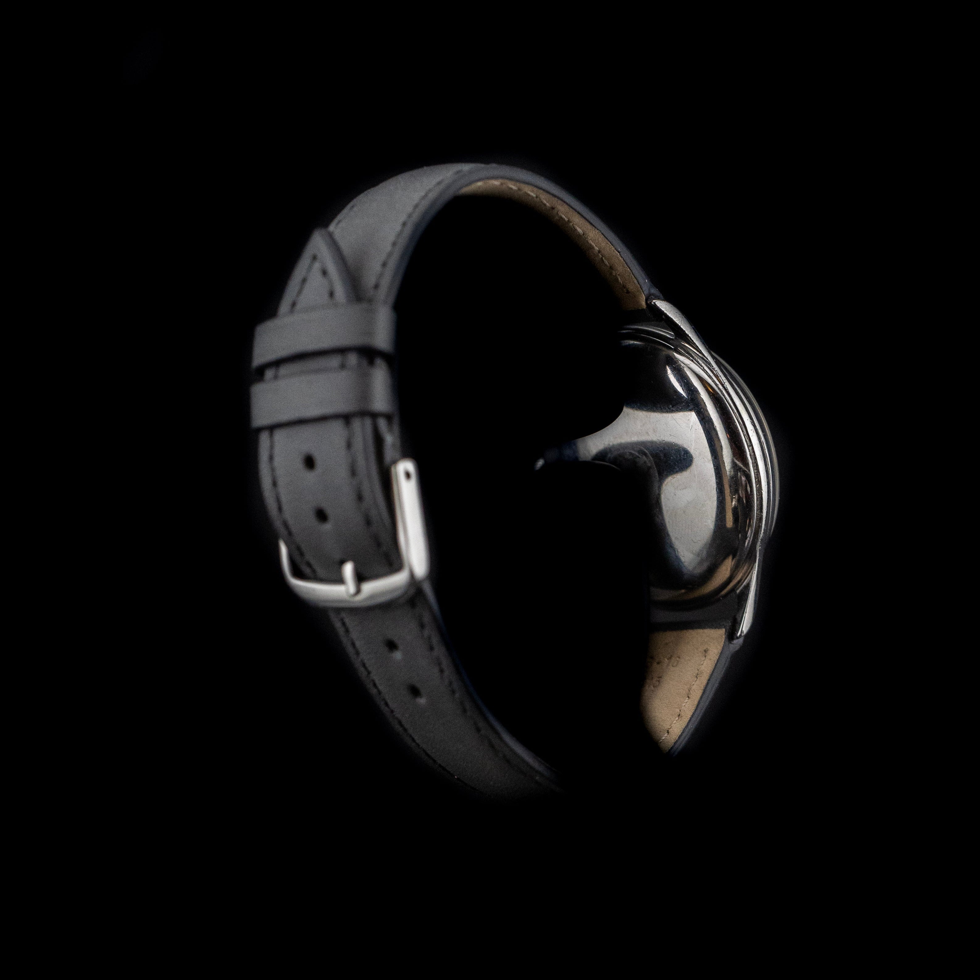 Afin de sublimer son allure rétro, la montre est montée sur un bracelet en cuir gris, choisi pour son élégance moderne et son ton parfaitement accordé au boîtier en acier. Ce contraste doux apporte une dimension contemporaine à une pièce profondément vintage, offrant un équilibre parfait entre tradition et modernité.