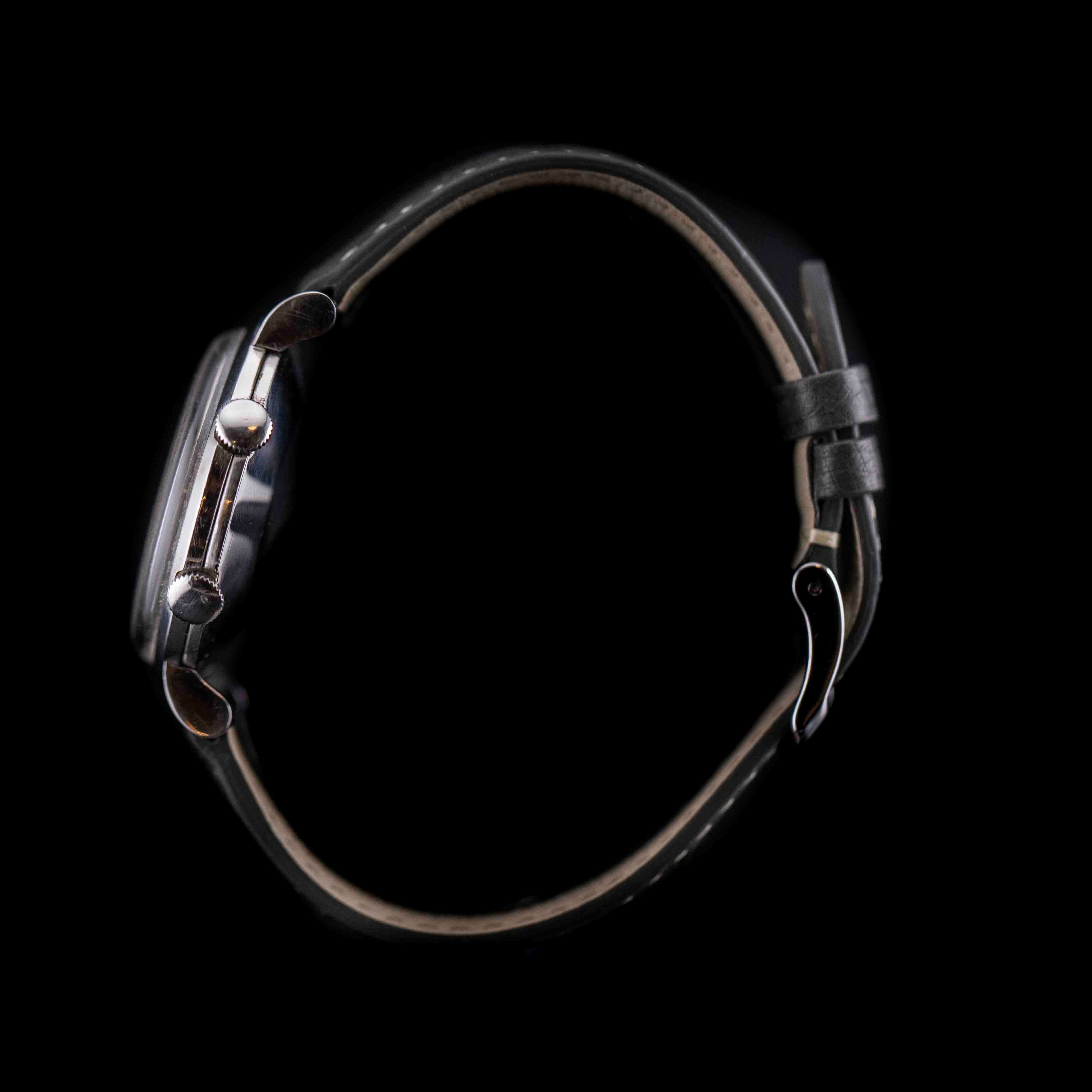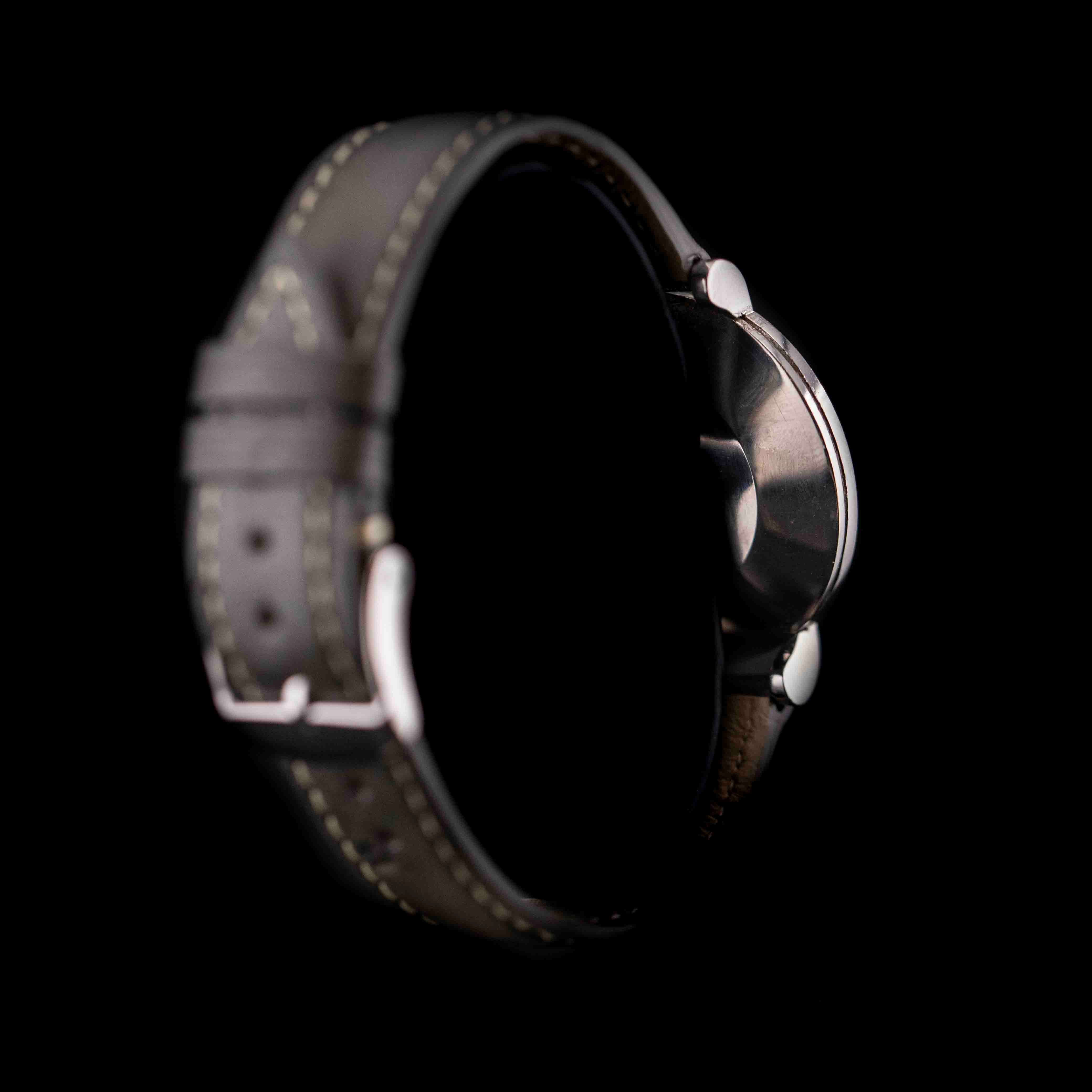 Ce modèle rare est présenté dans un boîtier en acier inoxydable de 35 mm, aux lignes sobres et équilibrées, typiques du style des années 50. Ses deux couronnes signatures permettent un réglage séparé de l’heure et de l’alarme, soulignant son design ingénieux et immédiatement reconnaissable.