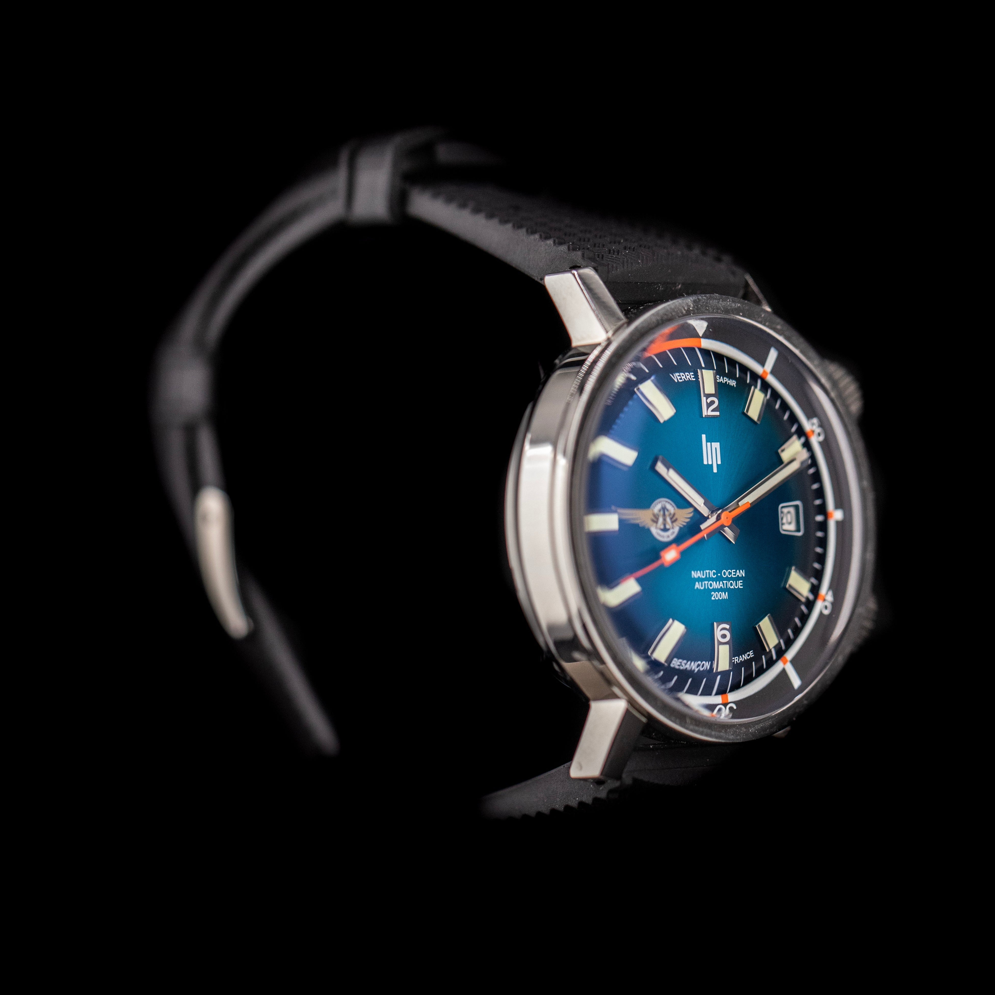 Inspirée par l’univers des montres professionnelles conçues pour affronter les éléments les plus extrêmes, la LIP Nautic Océan combine un design utilitaire parfaitement maîtrisé avec une qualité de fabrication moderne fidèle à l’esprit des modèles historiques de la marque. Son boîtier en acier, robuste et étanche, abrite un mouvement automatique précis et éprouvé, tandis que son cadran noir ultra lisible, ponctué d’index et d’aiguilles luminescents, évoque immédiatement les exigences de lecture rapide en situation opérationnelle.