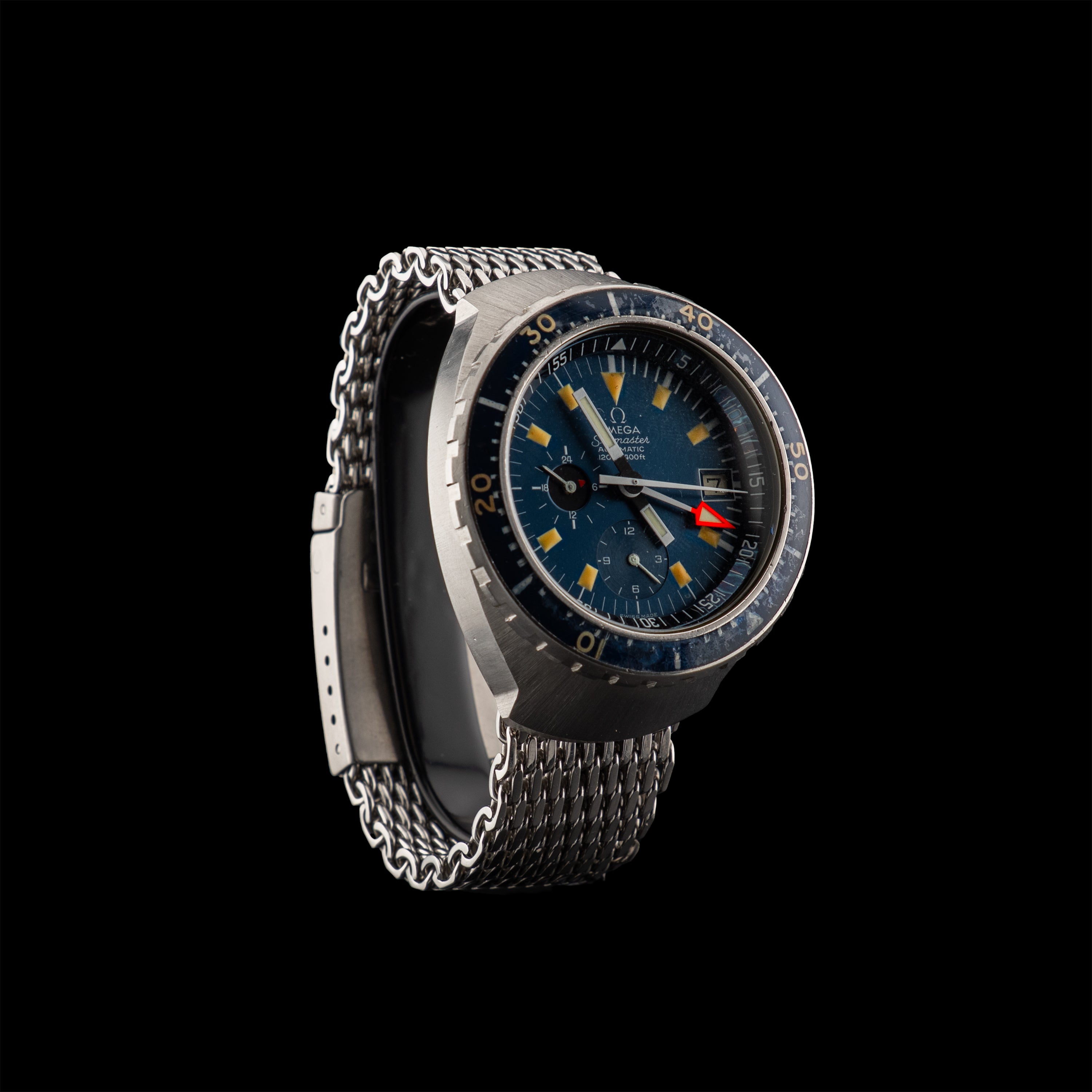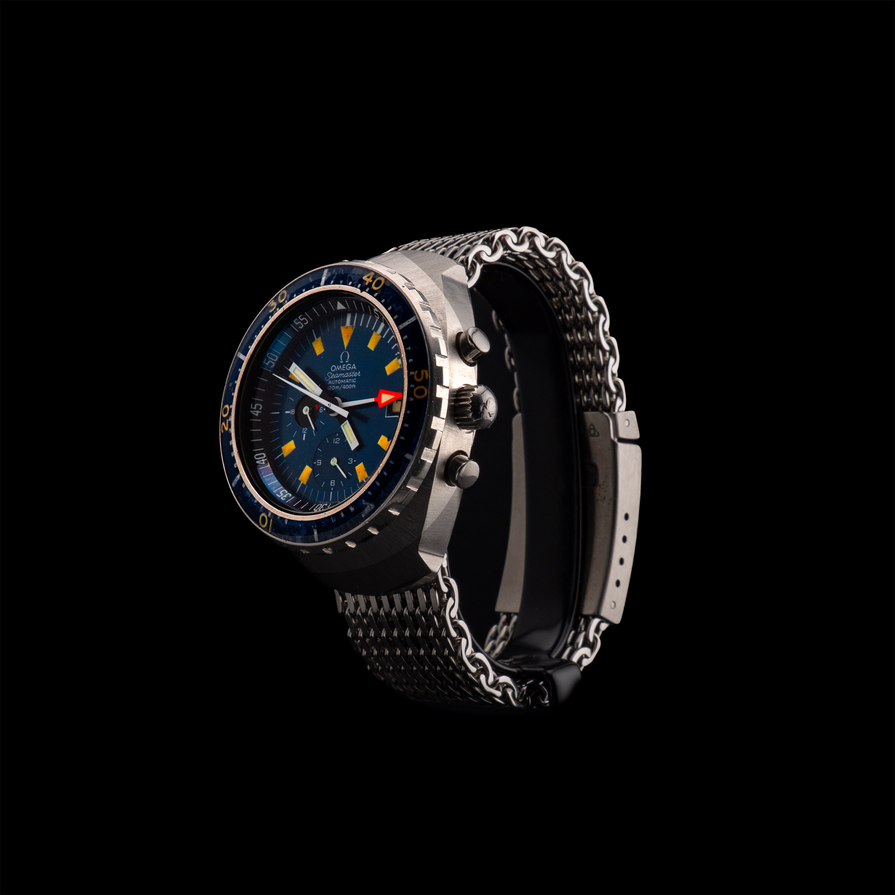 L'Atelier du temps à le plaisir de vous présenter cette belle Omega Chronographe Seamaster « Big Blue » massif, réf. 176.004 ("Blue dial") datant de 1973, la« Big blue » a été le premier chronographe automatique de plongée véritablement étanche et fonctionnel jusqu’à 120 mètres / 400 pieds sous l’eau.