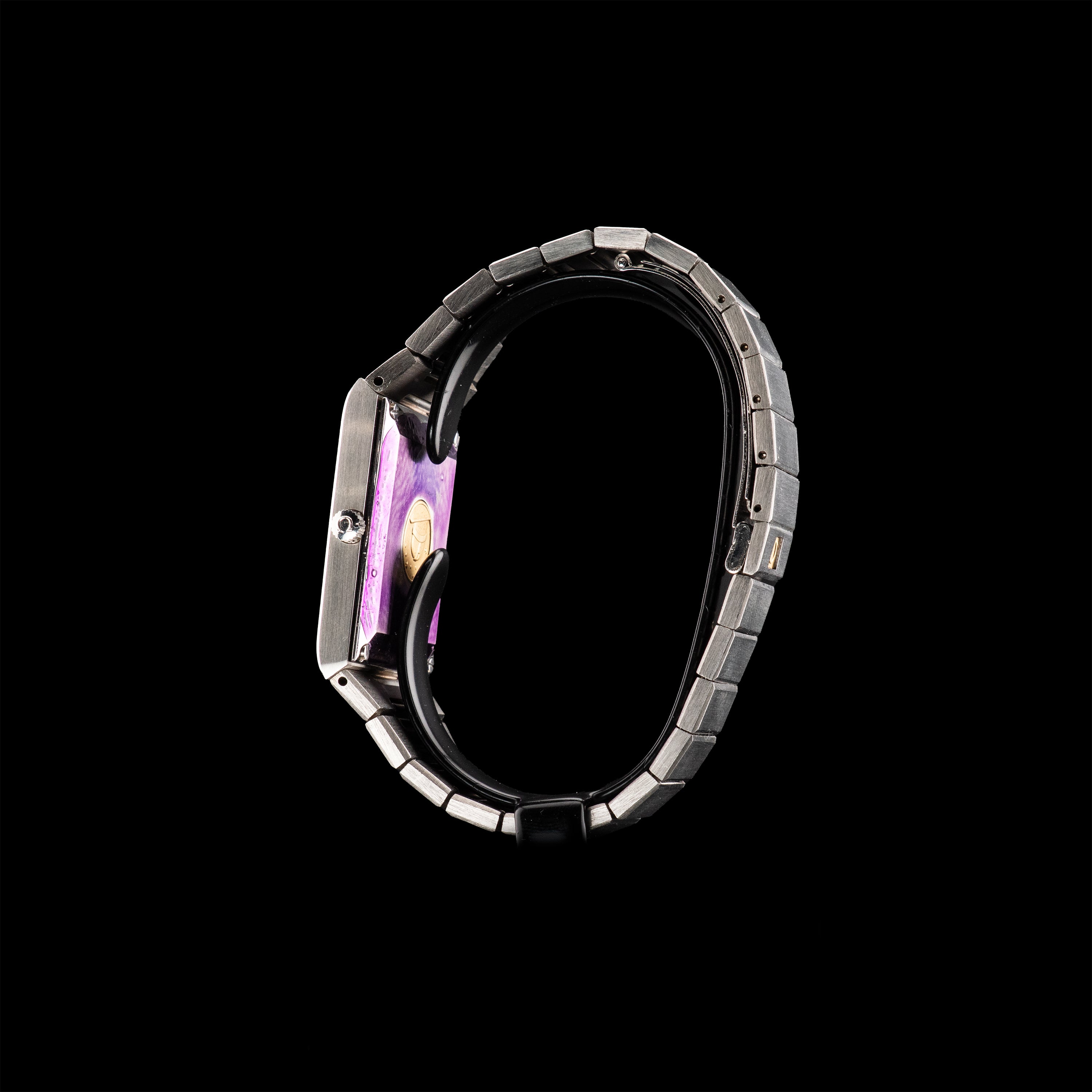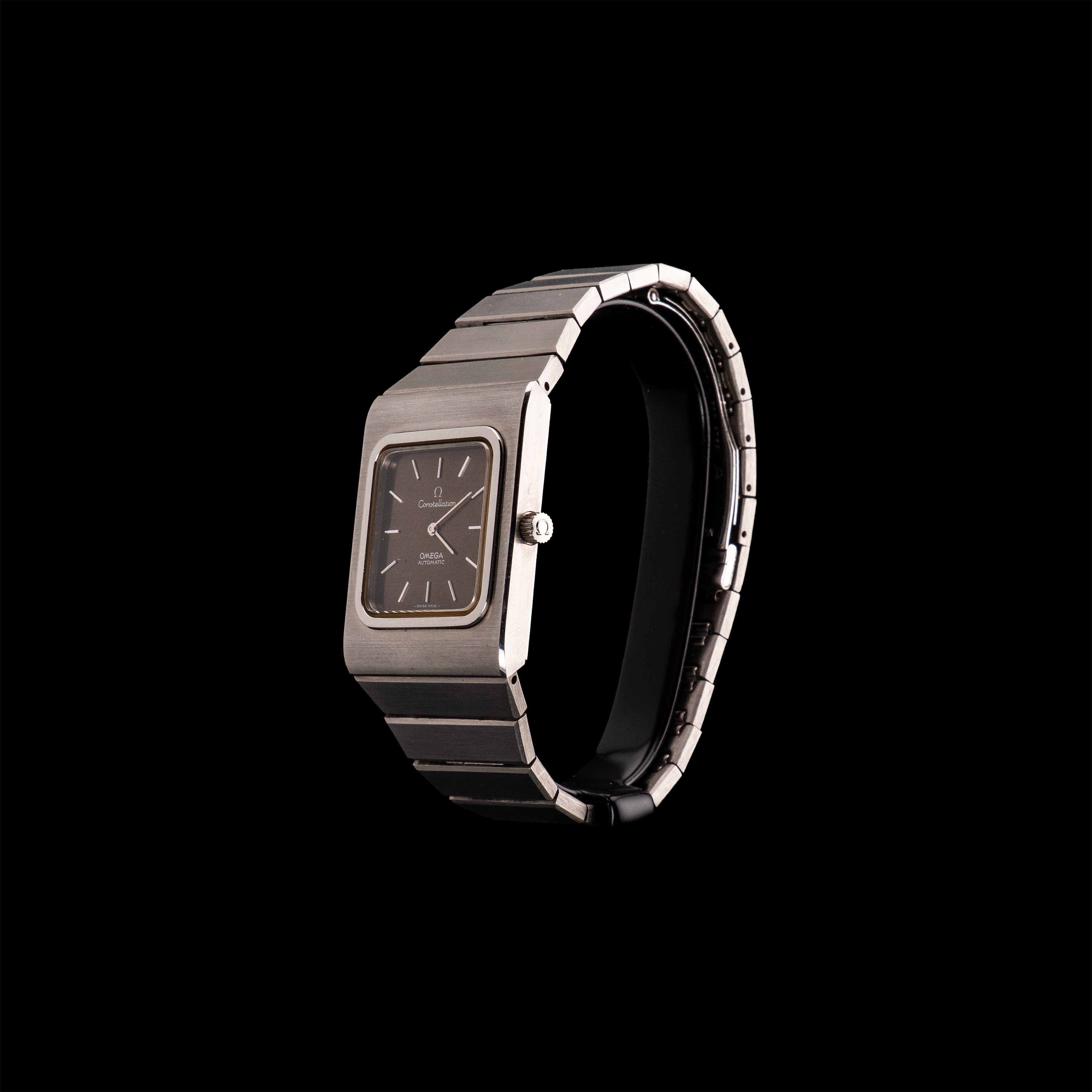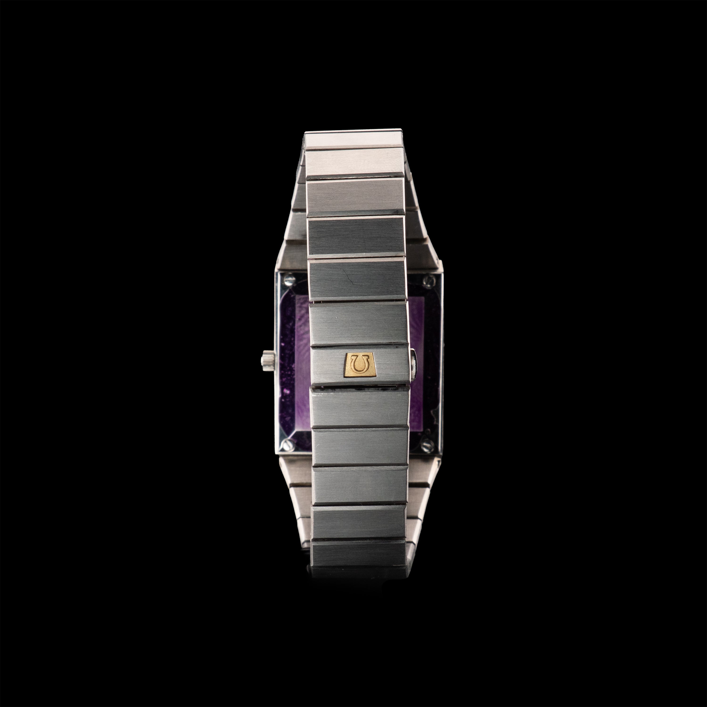 Le boitier rectangle est serti d'un magnifique cadran brossé marron ("Brown/Chocolate dial"), ce cadran arborera des index bâtons donnant une clareté et une modernité typique des 70's . La montre est habillée d'un bracelet d'origine acier estampé Omega.