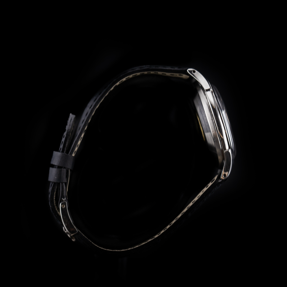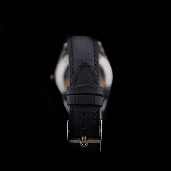 Le boitier massif est serti d'un magnifique cadran noir ("Gold dial"), ce cadran arborera des index dauphinés. La montre est habillée d'un bracelet cuir avec ardillon or d'origine.