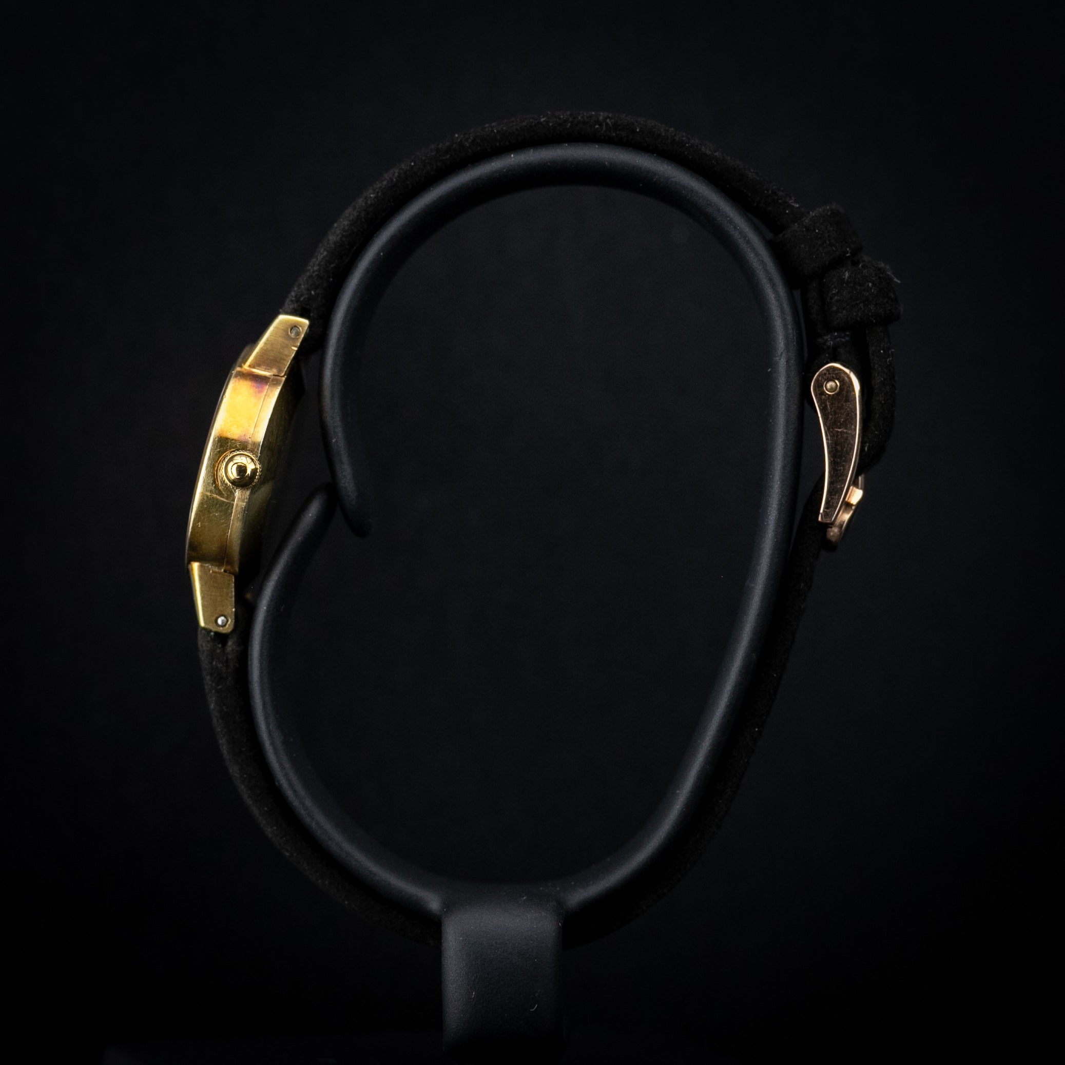 Son boîtier de 28mm de diamètre en or jaune 18K est légèrement ovalisé pour une meilleur ergonomie au poignet, typique du travail présenté par la marque dans les années 70, on notera la présence verre minéral sur ce modèle.