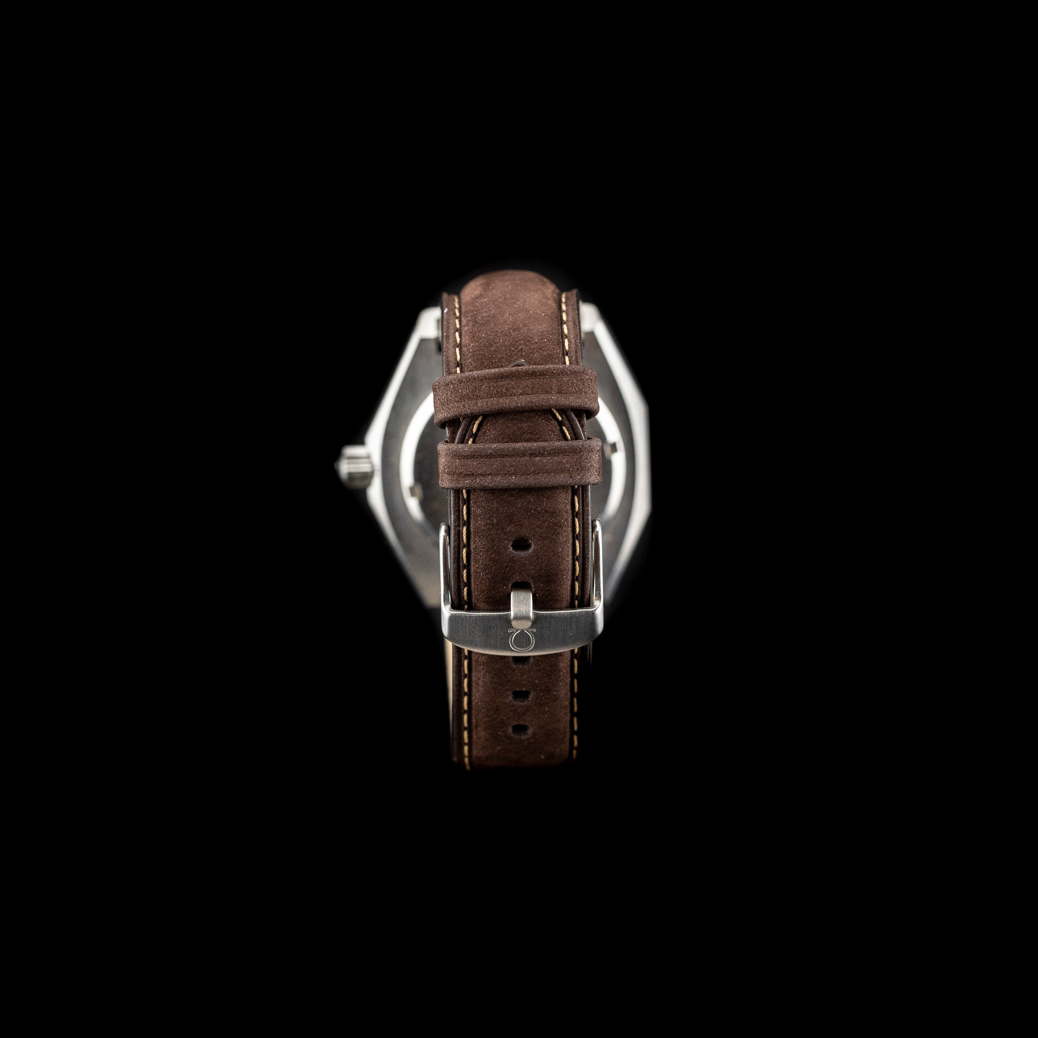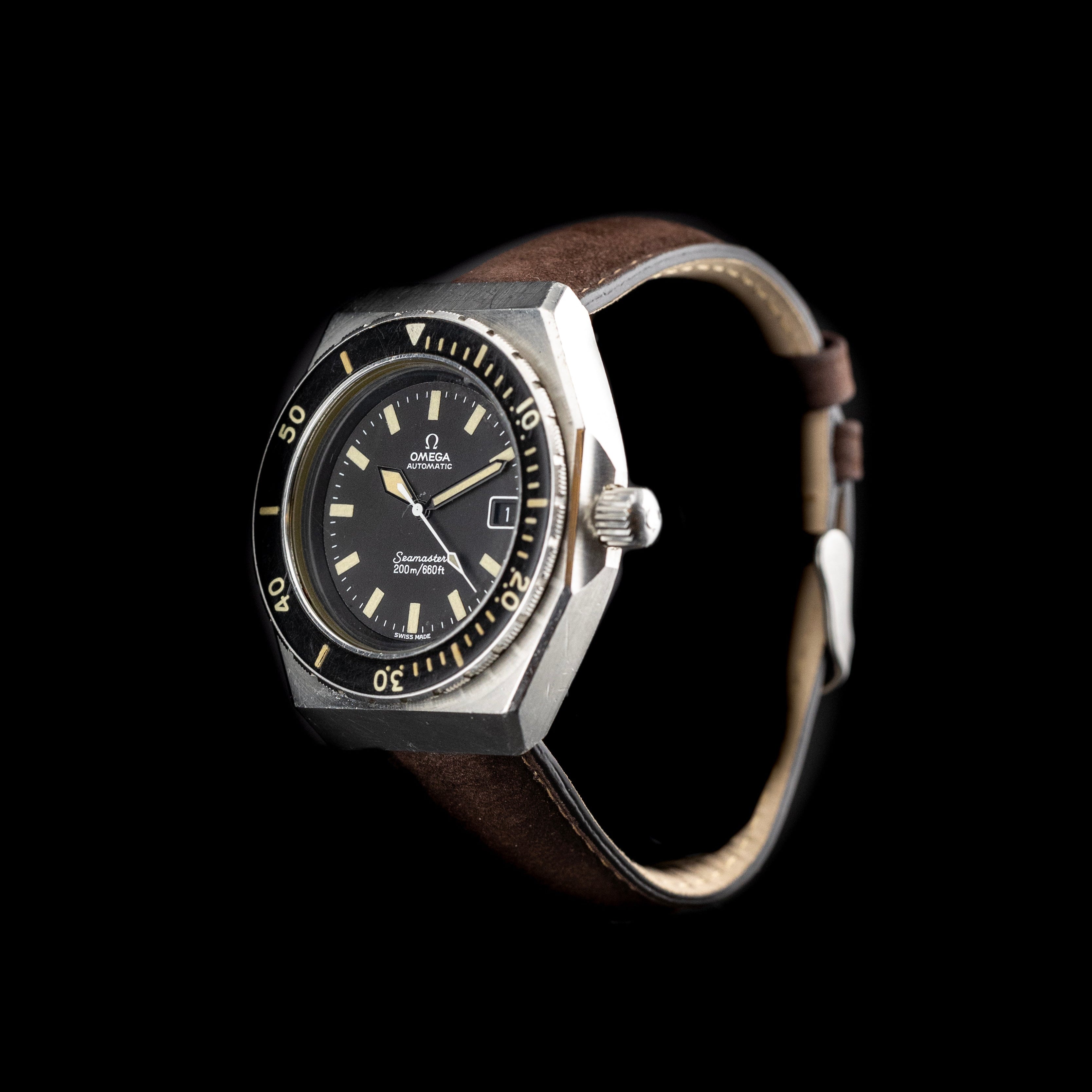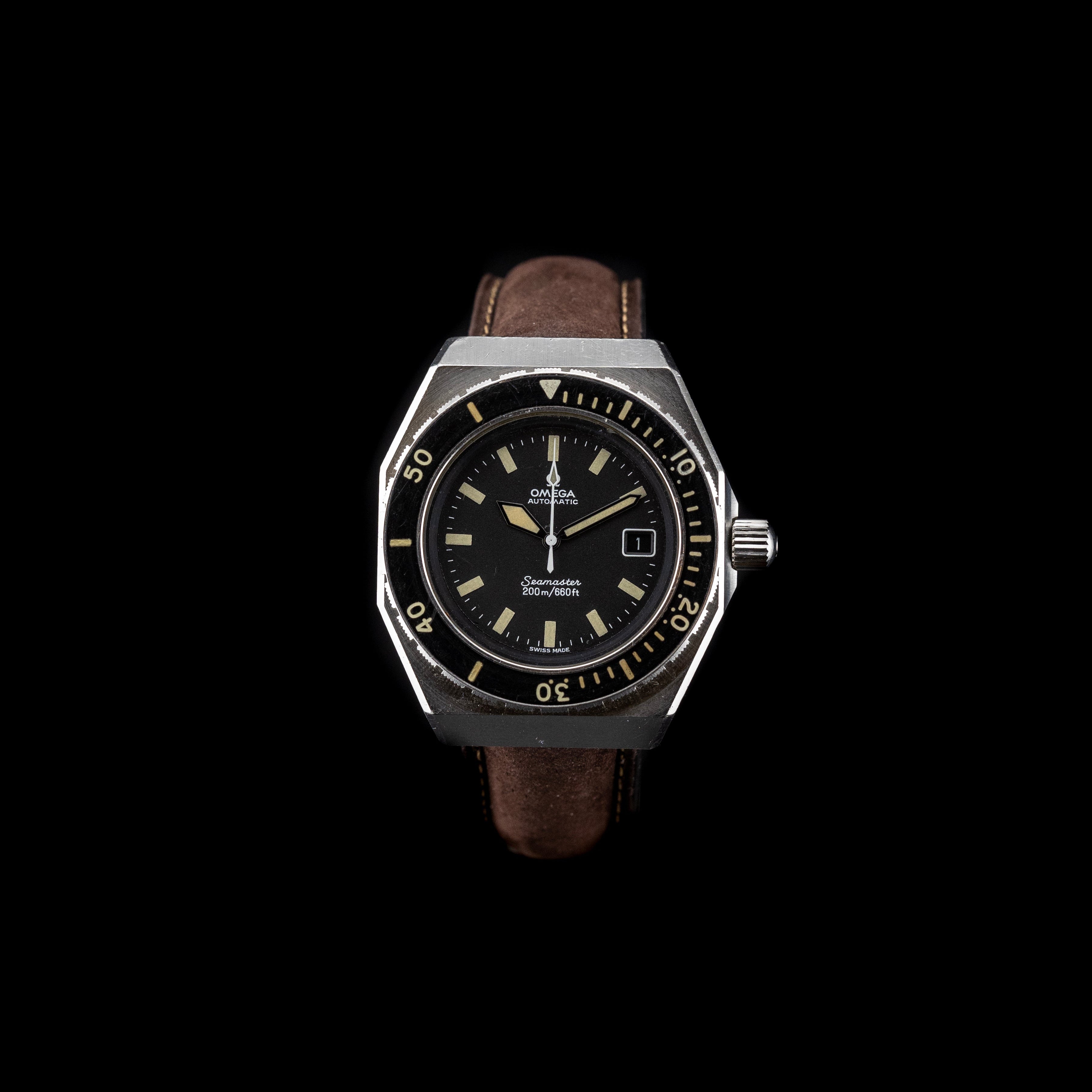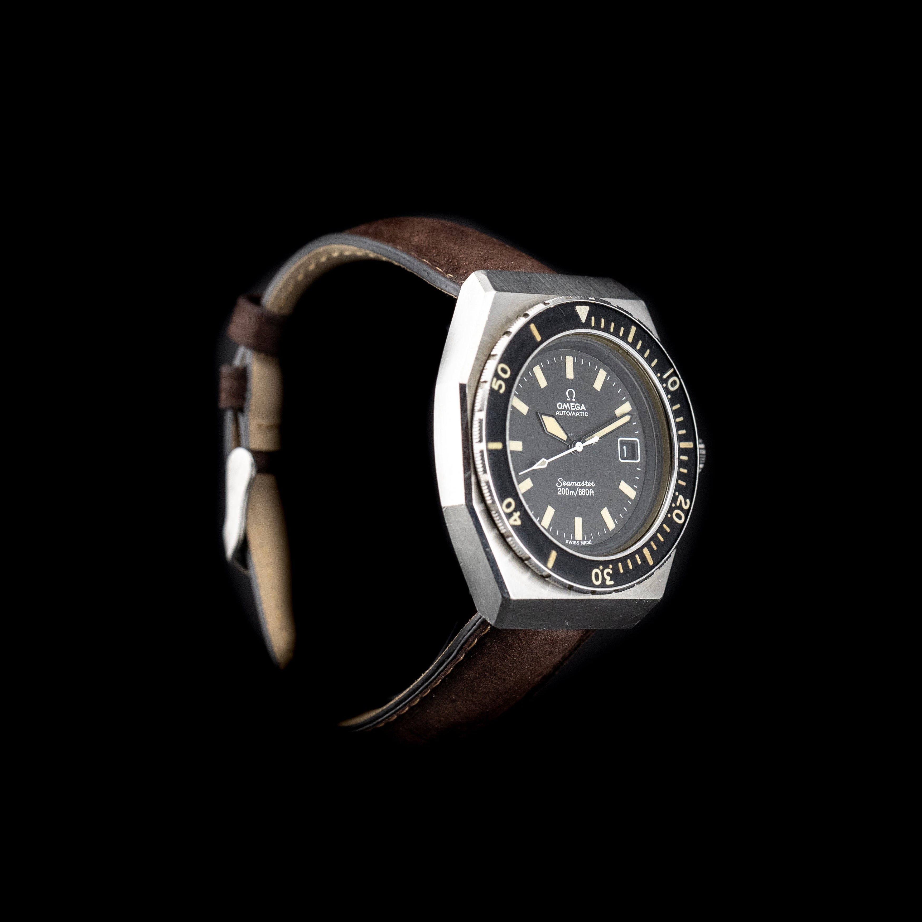 Dans les années 1960 et 1970, Omega a produit certaines des plus belles montres sous-marines. Si le titre « Seamaster Professional » a orné de nombreuses montres de plongée de légende, les surnoms ont toujours fait partie de l’héritage de la marque : la Seamaster 300, la Seamaster 600 « PloProf », pour « PLOngeur PROfessionnel », la Seamaster 1000, surnommée « Grande » en raison de sa forme et de son étanchéité à 1 000 mètres, jusqu’au chronographe Seamaster Automatic 120M « Big Blue ». Si ces modèles sont pour la plupart équipés du boîtier ovale signature Omega de la ligne « pilote », l’un des plus illustres membres de cette lignée arbore un boîtier étonnamment anguleux : la Seamaster 200, surnommée «SHOM» par les collectionneurs. Lancé sous la référence 166.0177, ce modèle entraîné par le calibre Omega 1012 a fait ses débuts au salon Baselworld de 1973. Outre son boîtier fabriqué d’un seul bloc d’acier suédois par Piquerez, il était équipé d’un cadran noir avec index haute visibilité, d’aiguilles glaive et affichait une étanchéité à 200 mètres, rappelée sur le cadran.