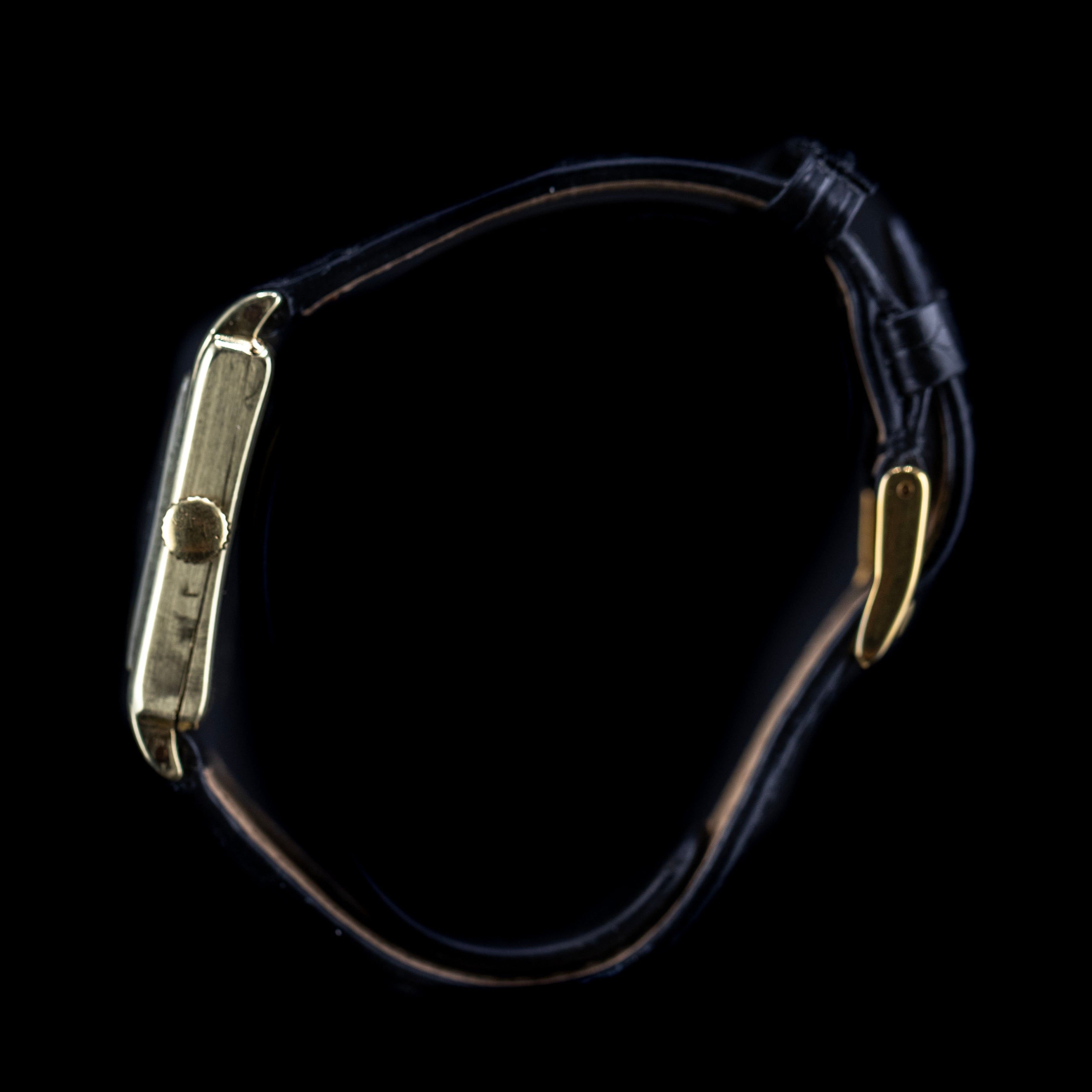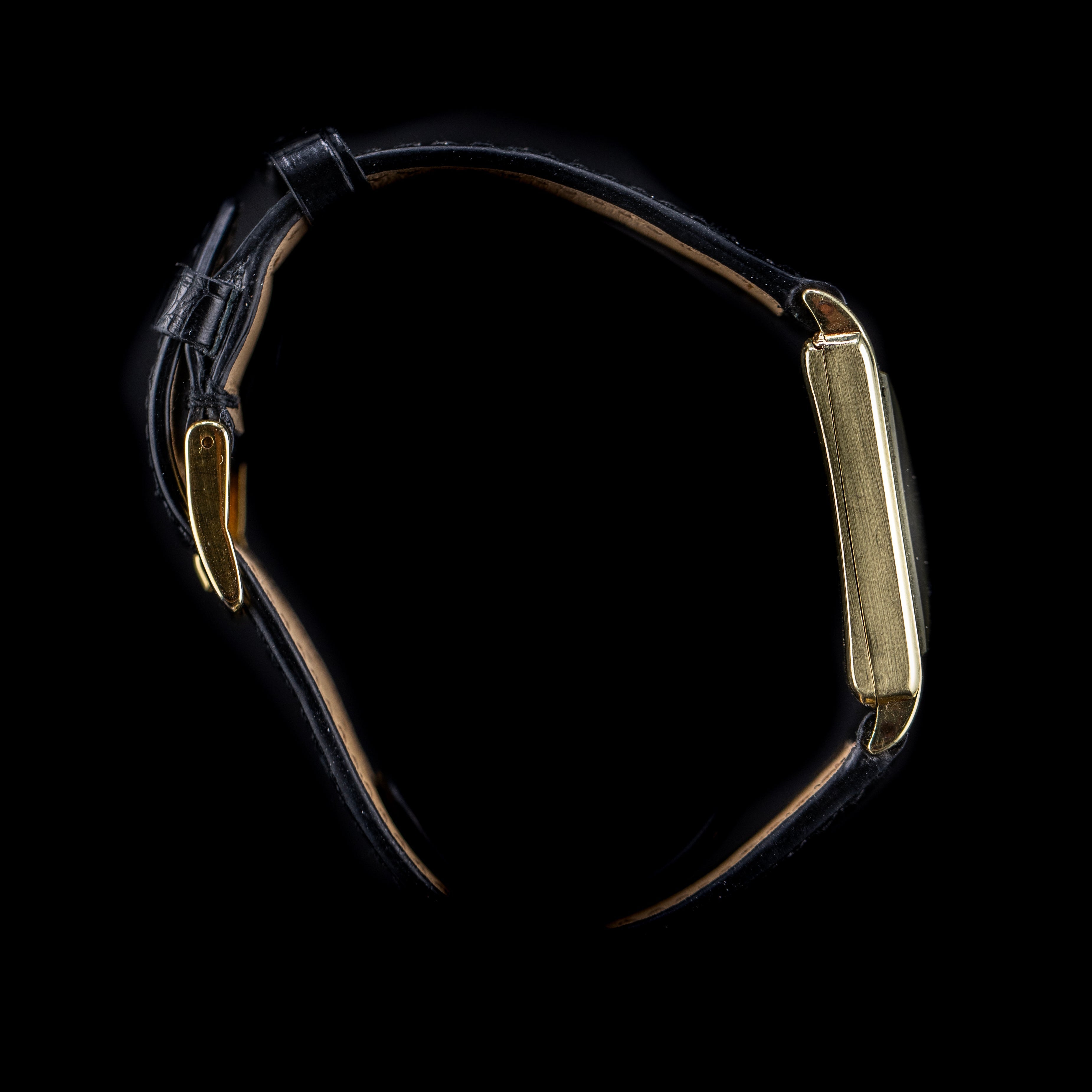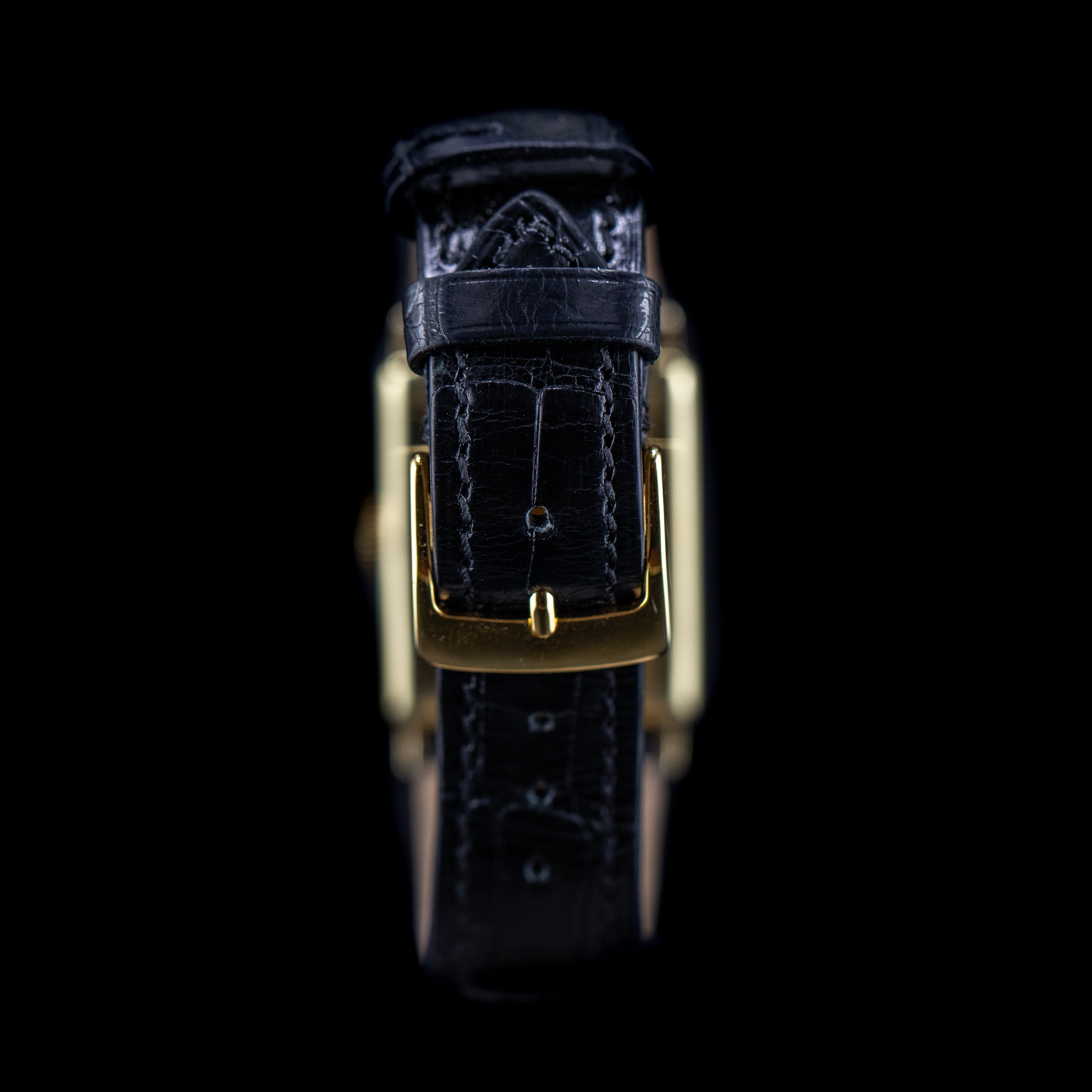 Taillée dans un somptueux or jaune 18 carats, cette Gondolo se distingue par son boîtier rectangulaire aux lignes nettes et équilibrées, typiques de la collection Gondolo, inspirée des codes esthétiques Art déco. Les proportions sont harmonieuses et raffinées, pensées pour épouser naturellement le poignet tout en affirmant une présence discrète mais assurée.