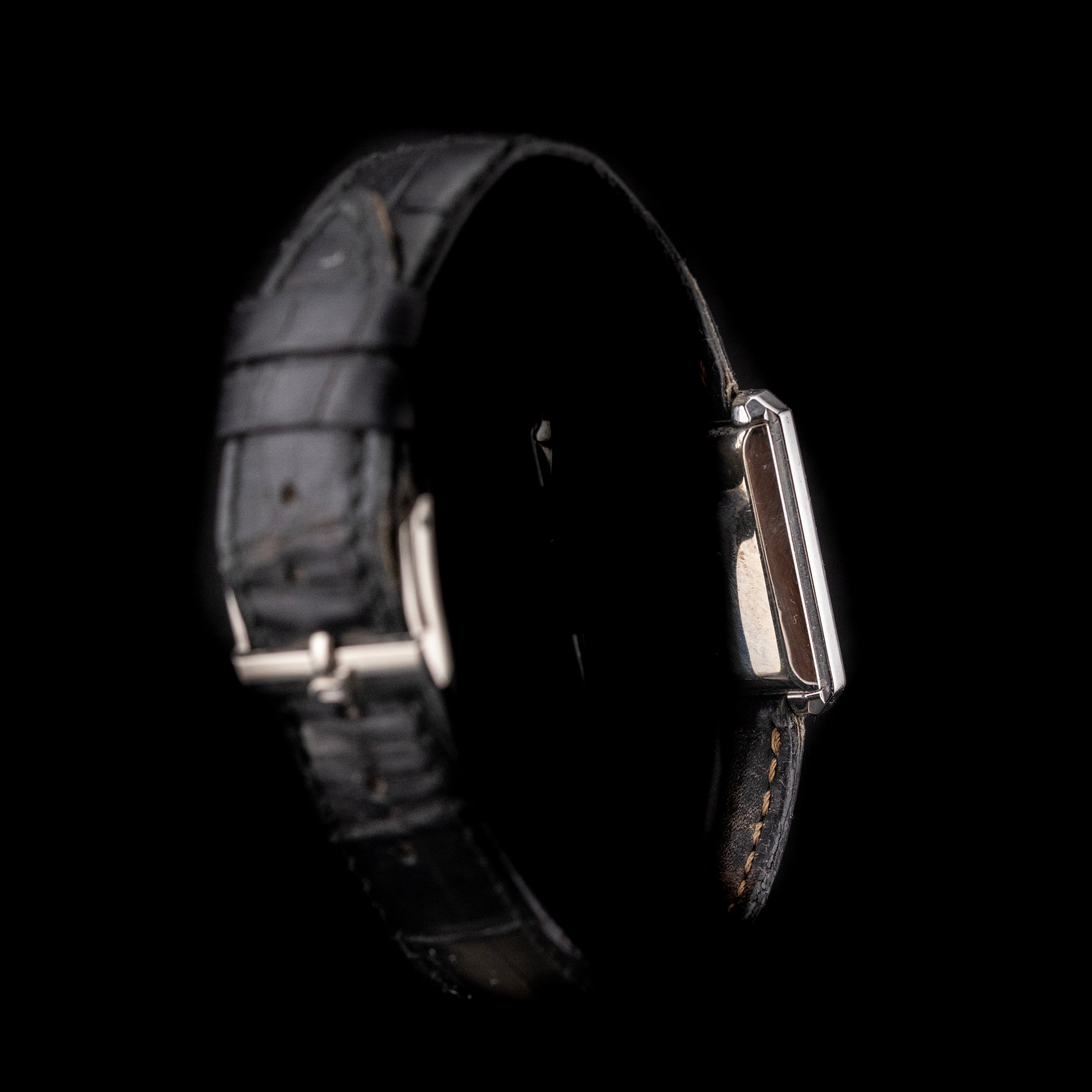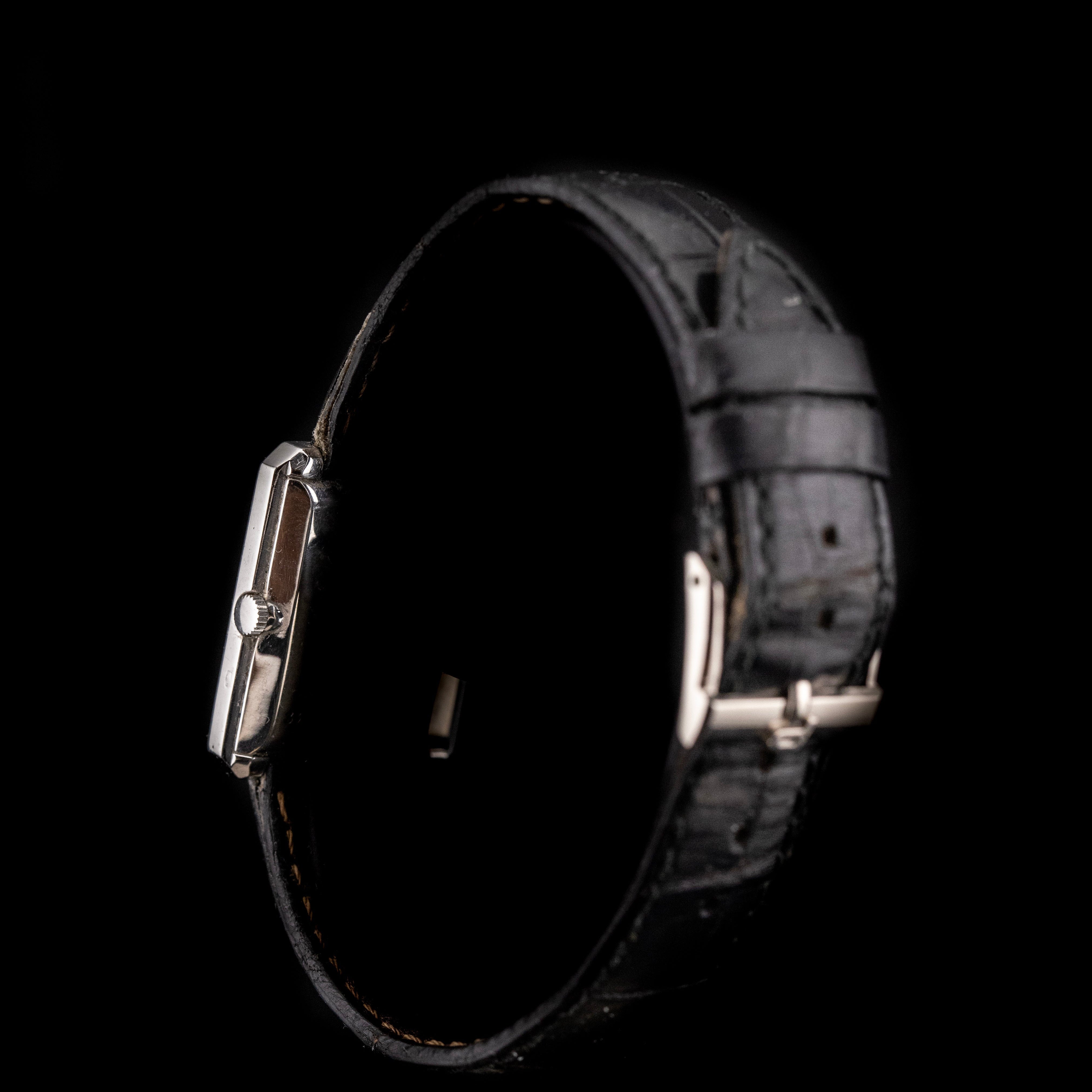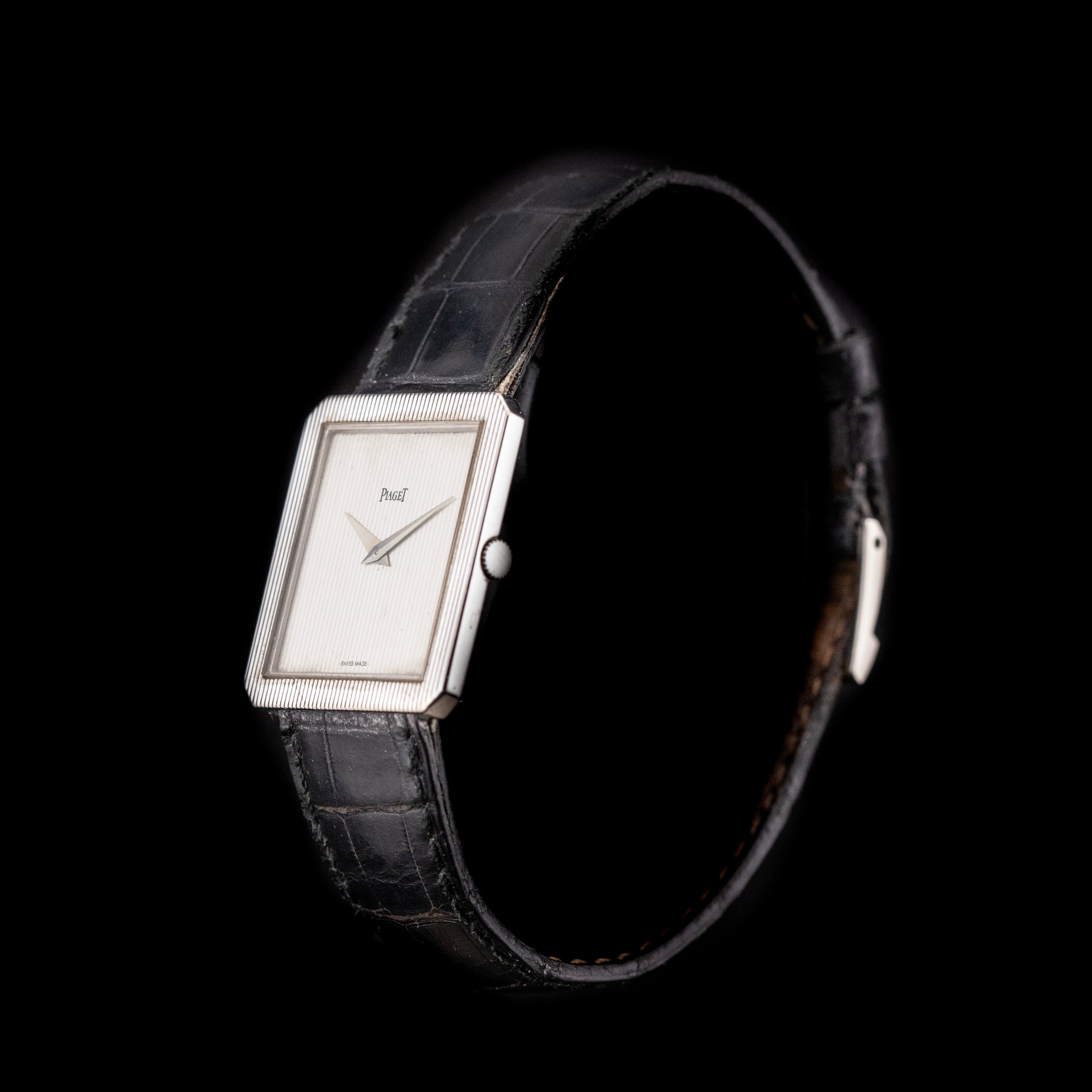 Fabriquée en or blanc 18 carats, la montre présente un boîtier rectangulaire aux lignes nettes, parfois avec une finition martelée ou brossée, typique de l’esthétique de l’époque. Les dimensions sont souvent discrètes, mettant en valeur le caractère chic et épuré du modèle. Le cadran est généralement sobre, avec de fins index ou sans index du tout, et peut arborer la mention « Piaget » discrètement positionnée à midi.
