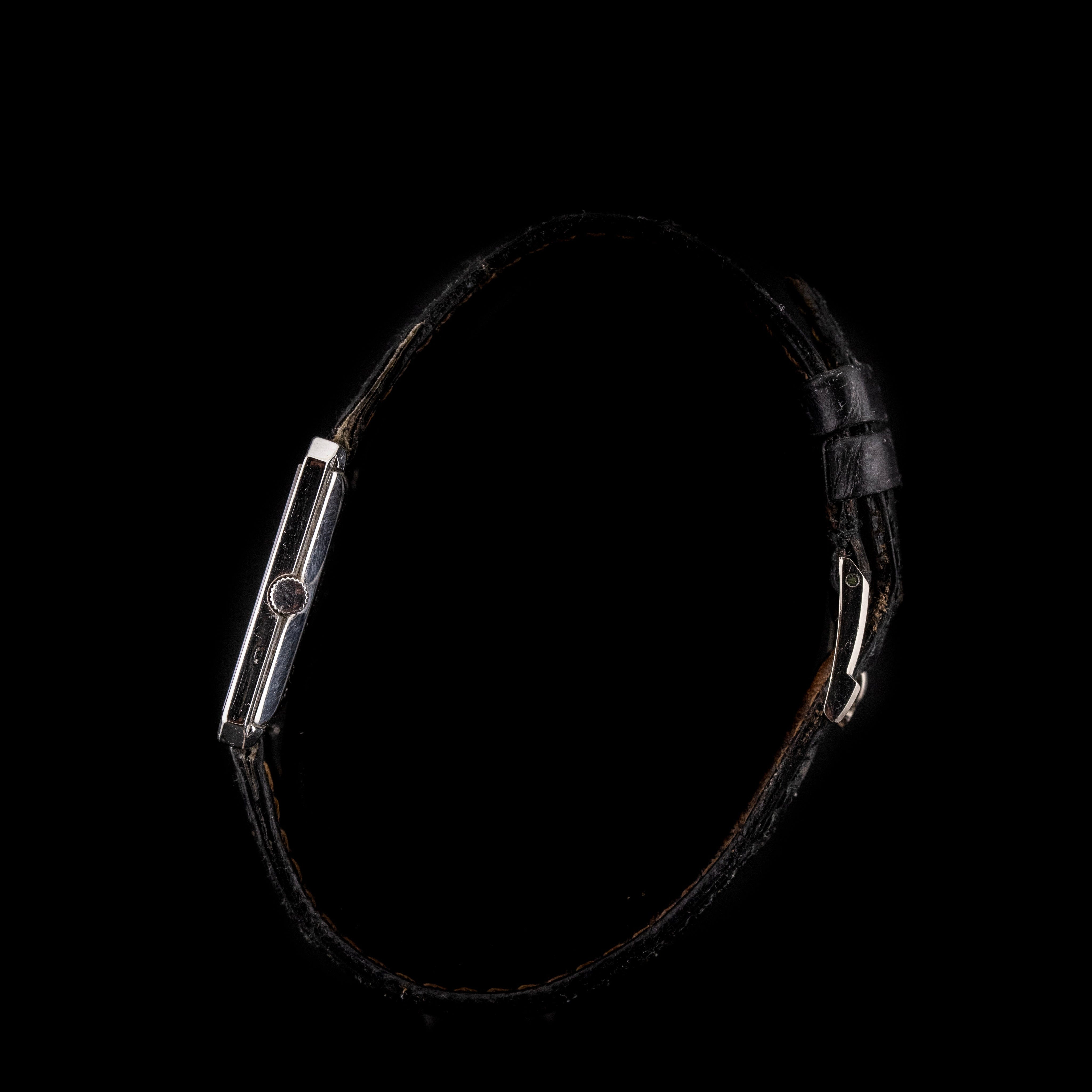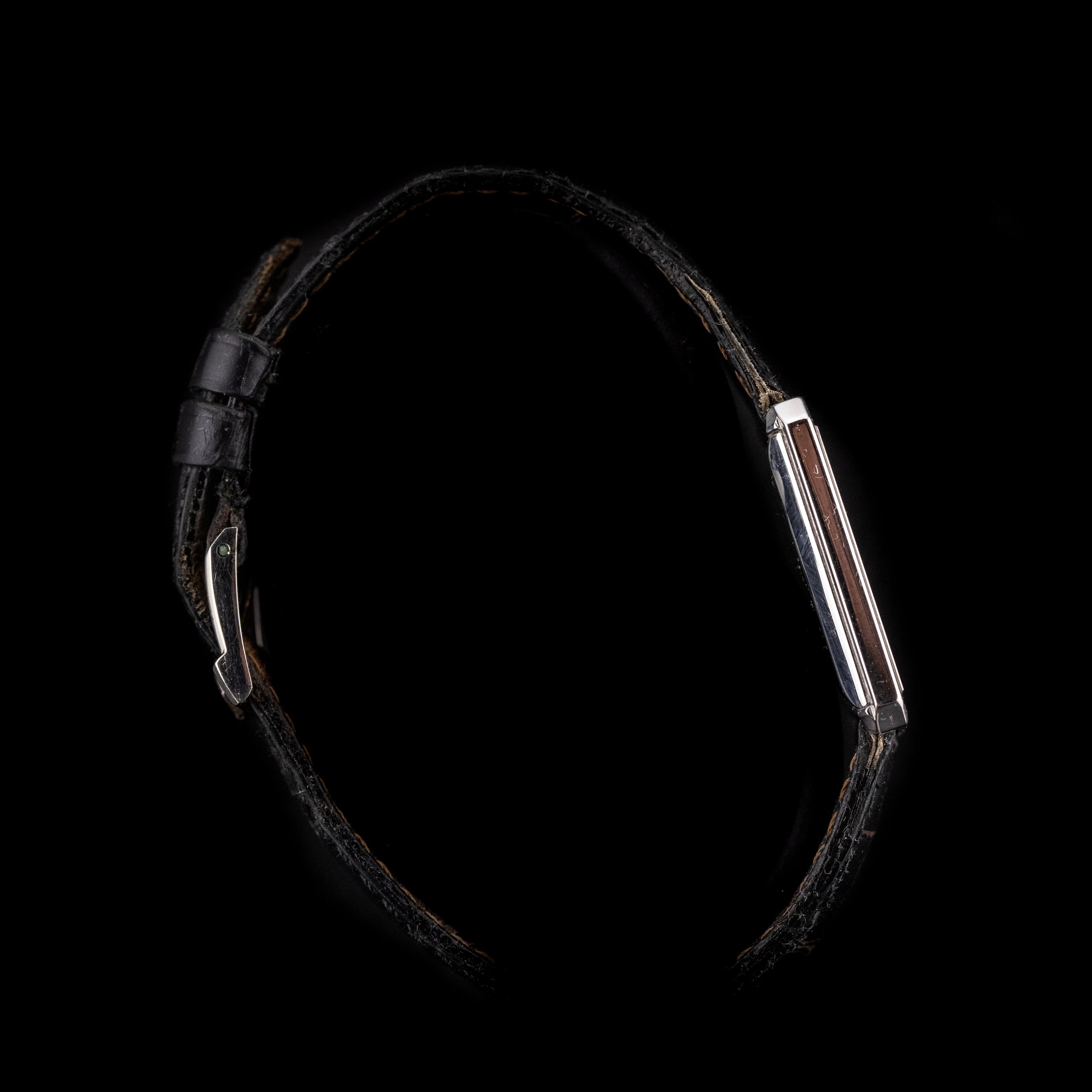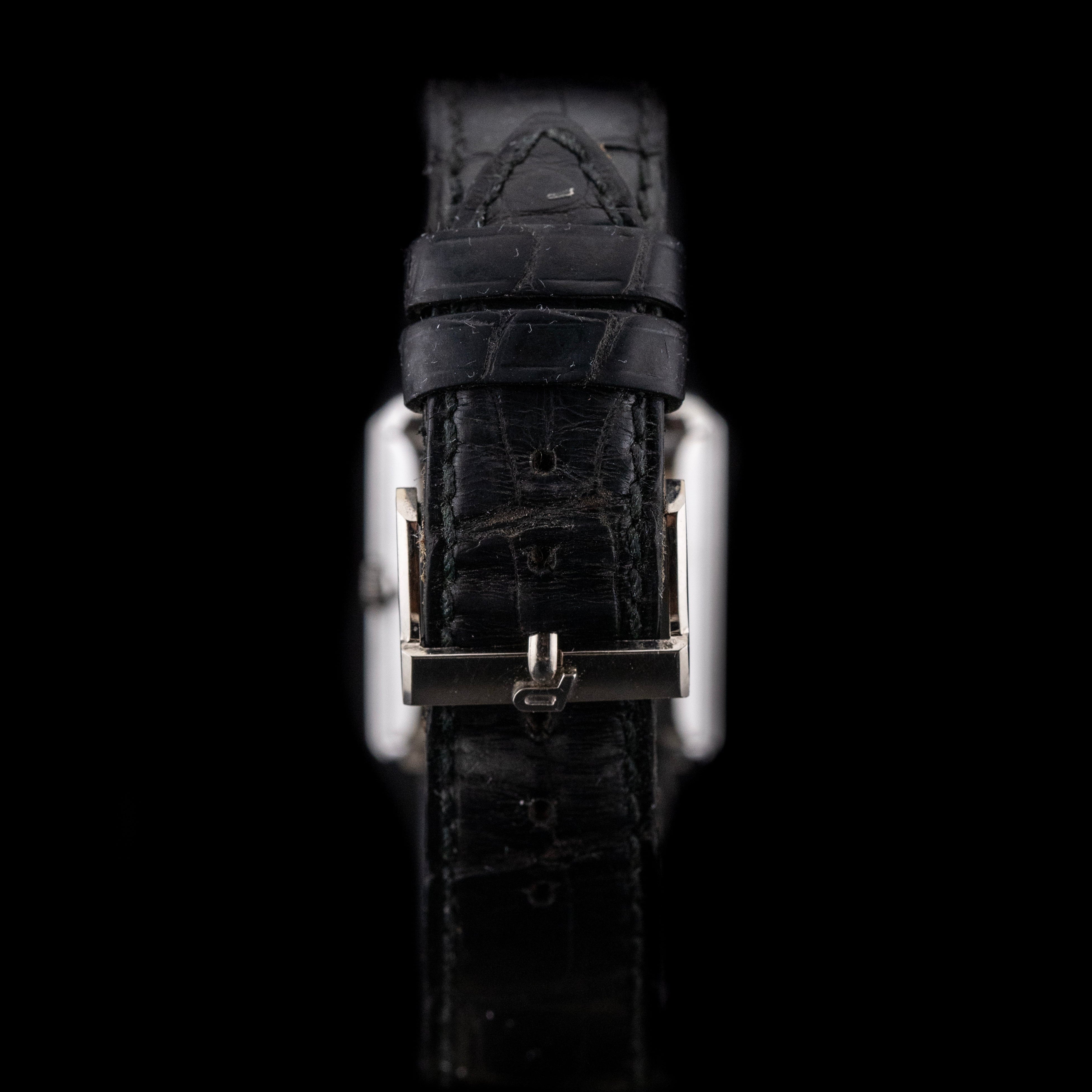 Fabriquée en or blanc 18 carats, la montre présente un boîtier rectangulaire aux lignes nettes, parfois avec une finition martelée ou brossée, typique de l’esthétique de l’époque. Les dimensions sont souvent discrètes, mettant en valeur le caractère chic et épuré du modèle. Le cadran est généralement sobre, avec de fins index ou sans index du tout, et peut arborer la mention « Piaget » discrètement positionnée à midi.
