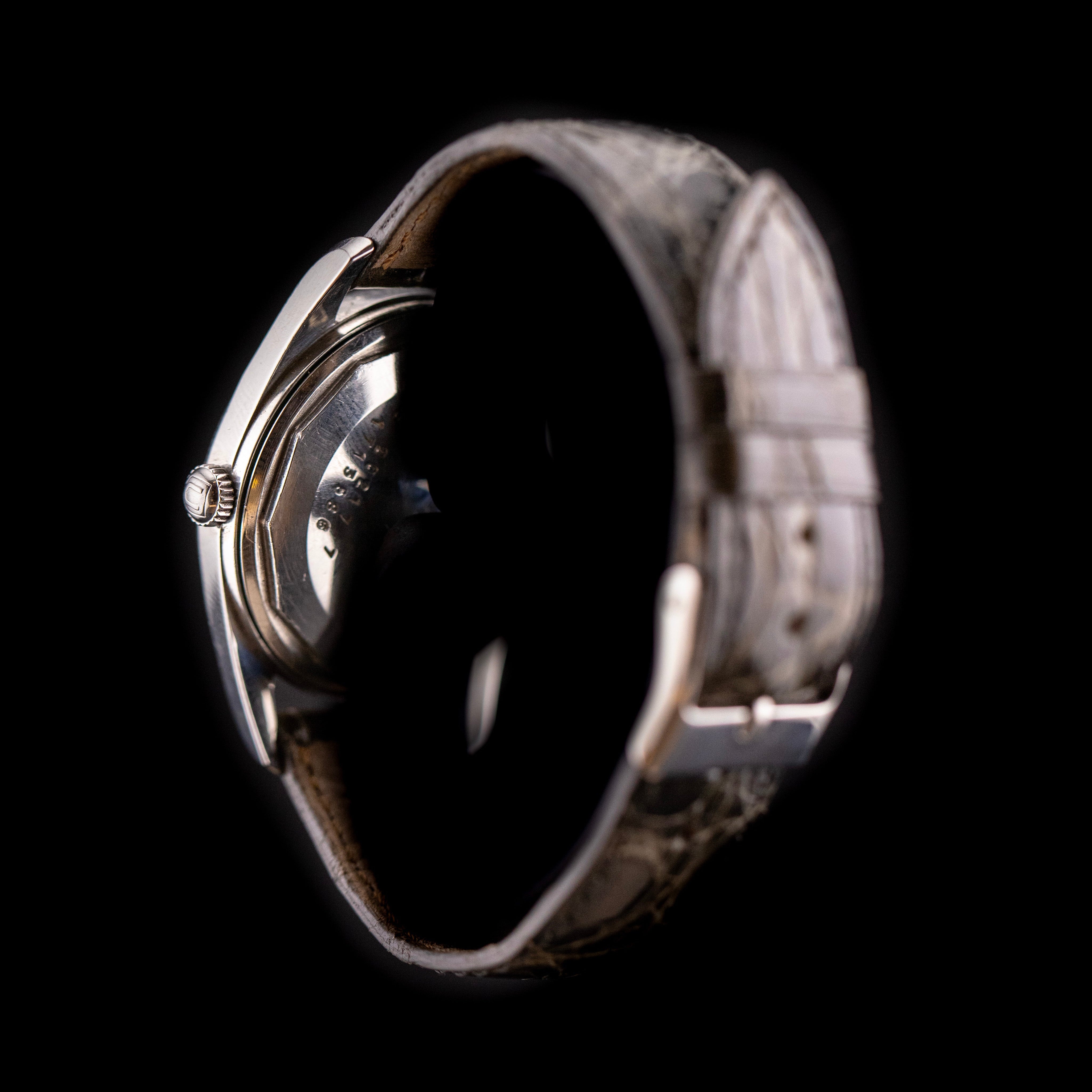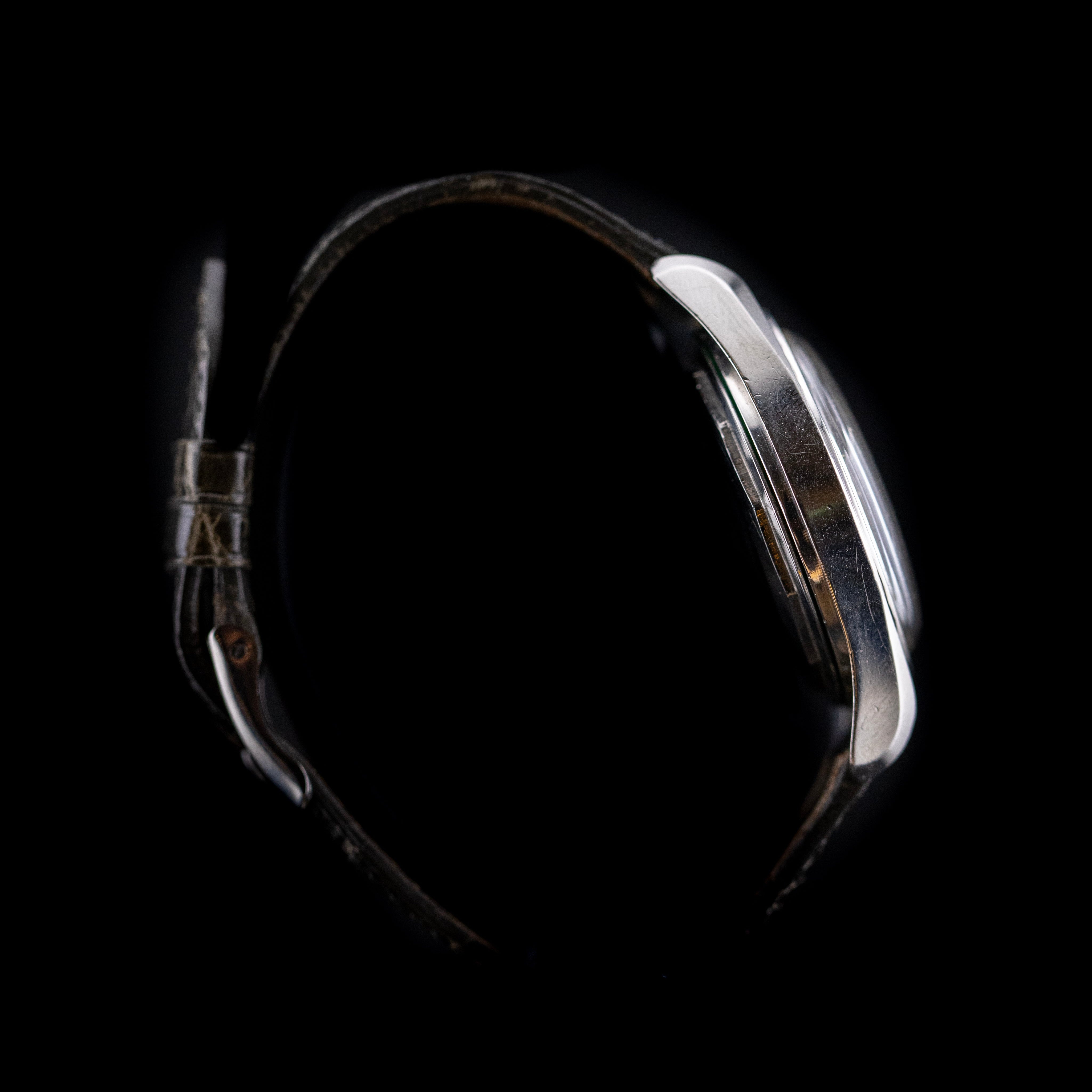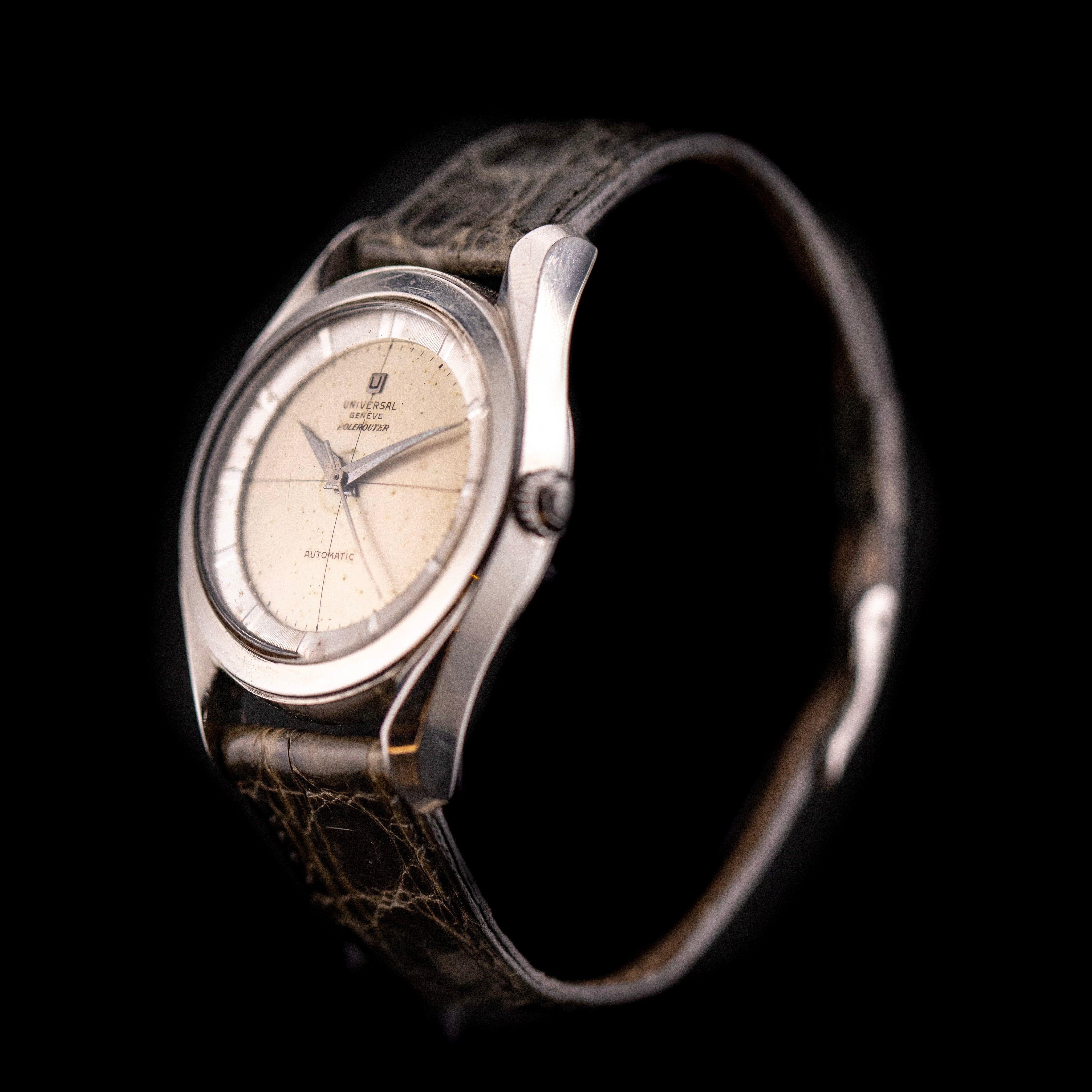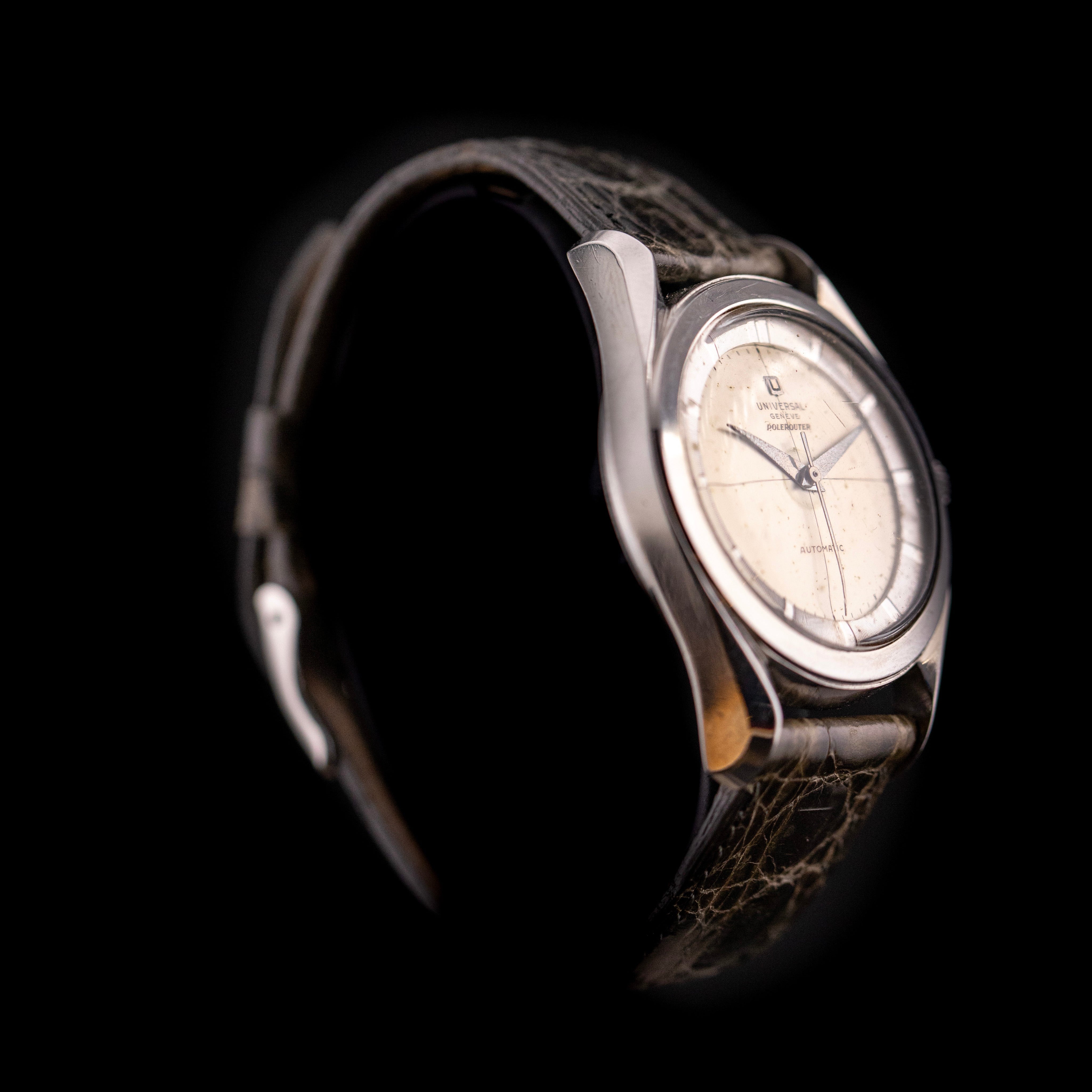 Le cadran argenté, sobre et lisible, présente une finition soleillée qui capte délicatement la lumière. Il est orné d’index appliqués en acier, d’une minuterie périphérique fine, et de subtiles aiguilles dauphine, le tout protégé par un verre plexiglas bombé, fidèle à l’esthétique des années 50–60. La mention "Automatic" à 6h met en valeur le cœur technique de la montre : un mouvement à micro-rotor, innovation marquante d’Universal Genève à l’époque.