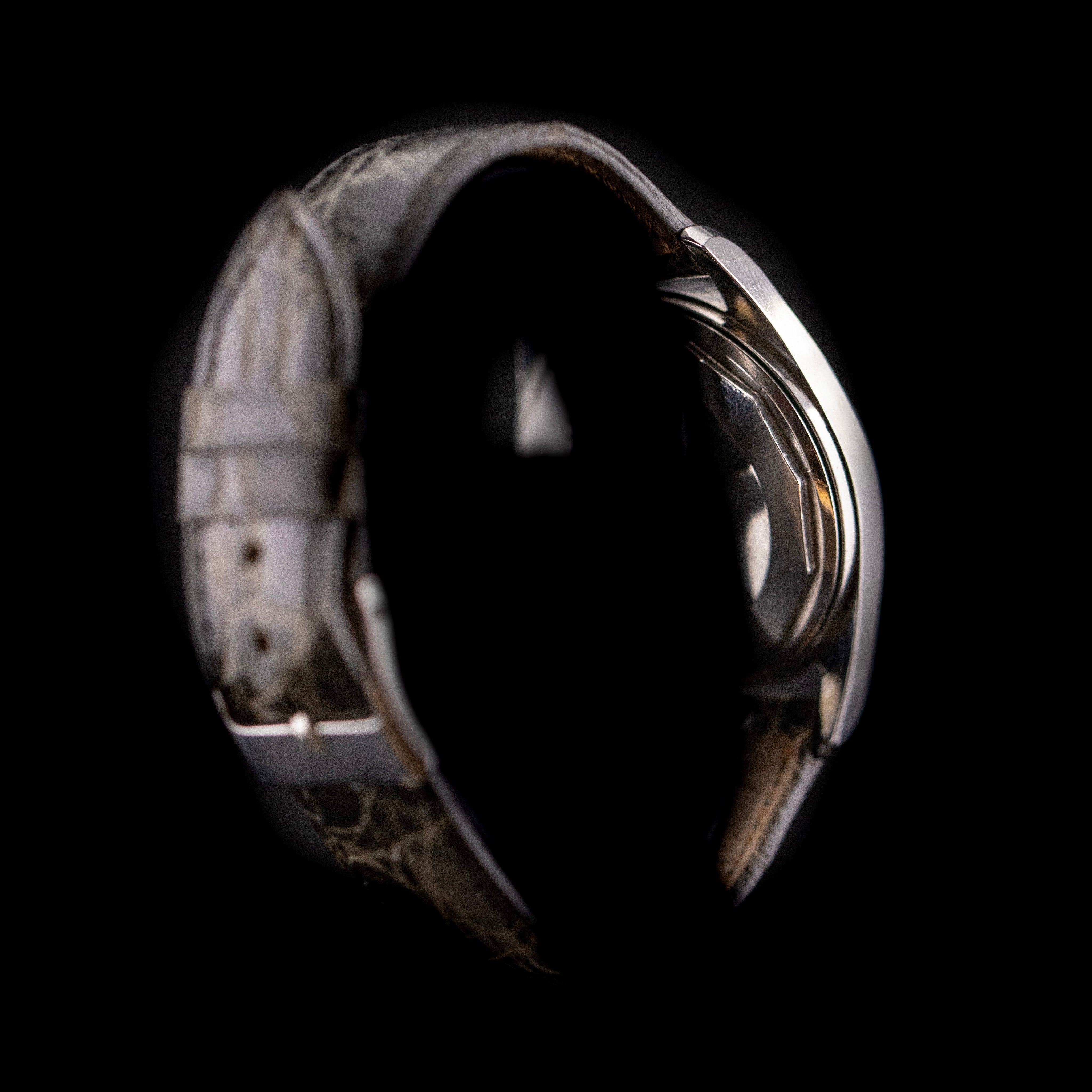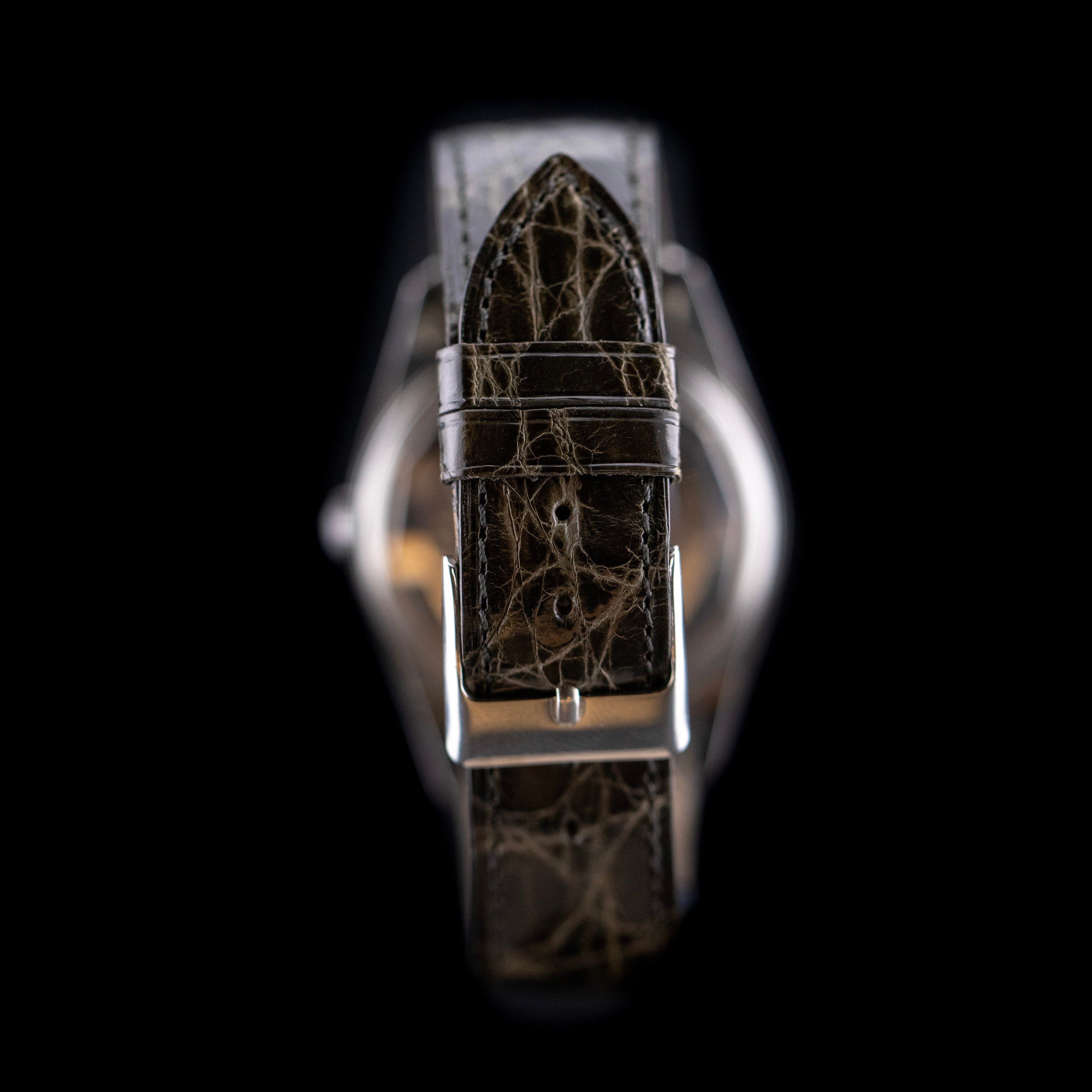 La montre est montée sur un élégant bracelet en cuir de lézard noir, qui souligne son caractère habillé et vintage, tout en offrant un confort souple et naturel au poignet. L’ensemble dégage une harmonie rare entre technicité horlogère, design pur et sophistication discrète.