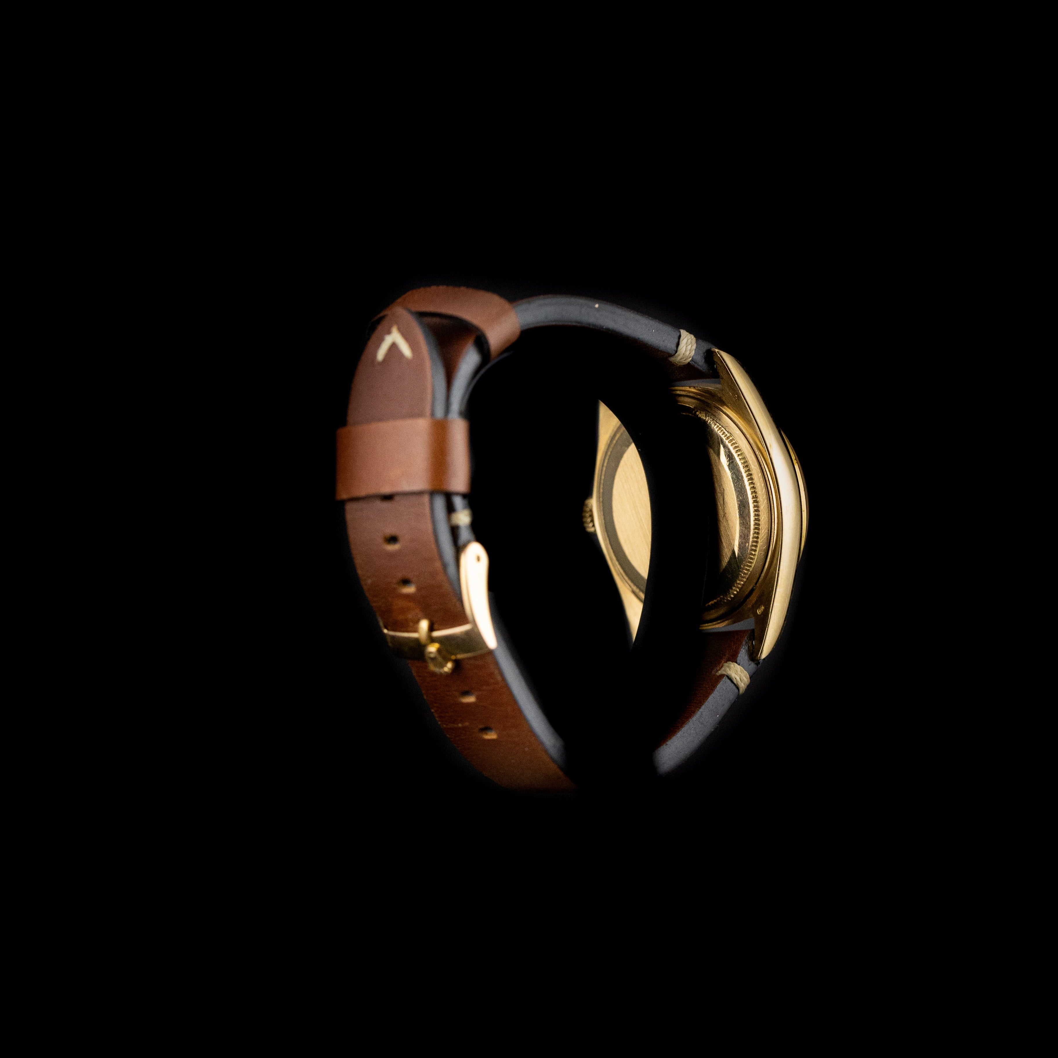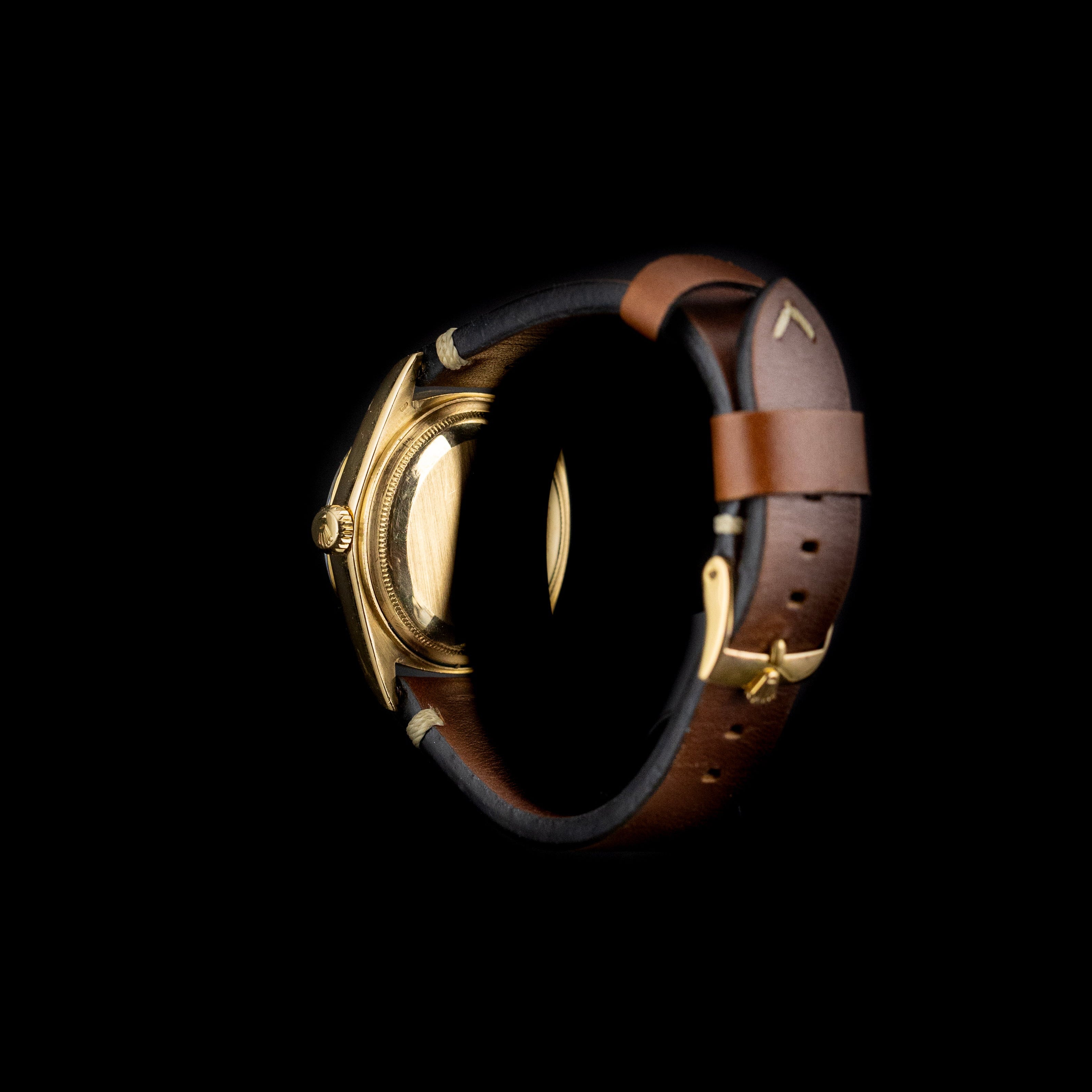 Montée sur un bracelet en cuir marron soigneusement assorti, elle dégage une esthétique vintage chaleureuse. Le cuir apporte une touche de sophistication sobre qui met parfaitement en valeur l’éclat patiné du boîtier en or, tout en assurant un confort irréprochable au poignet.