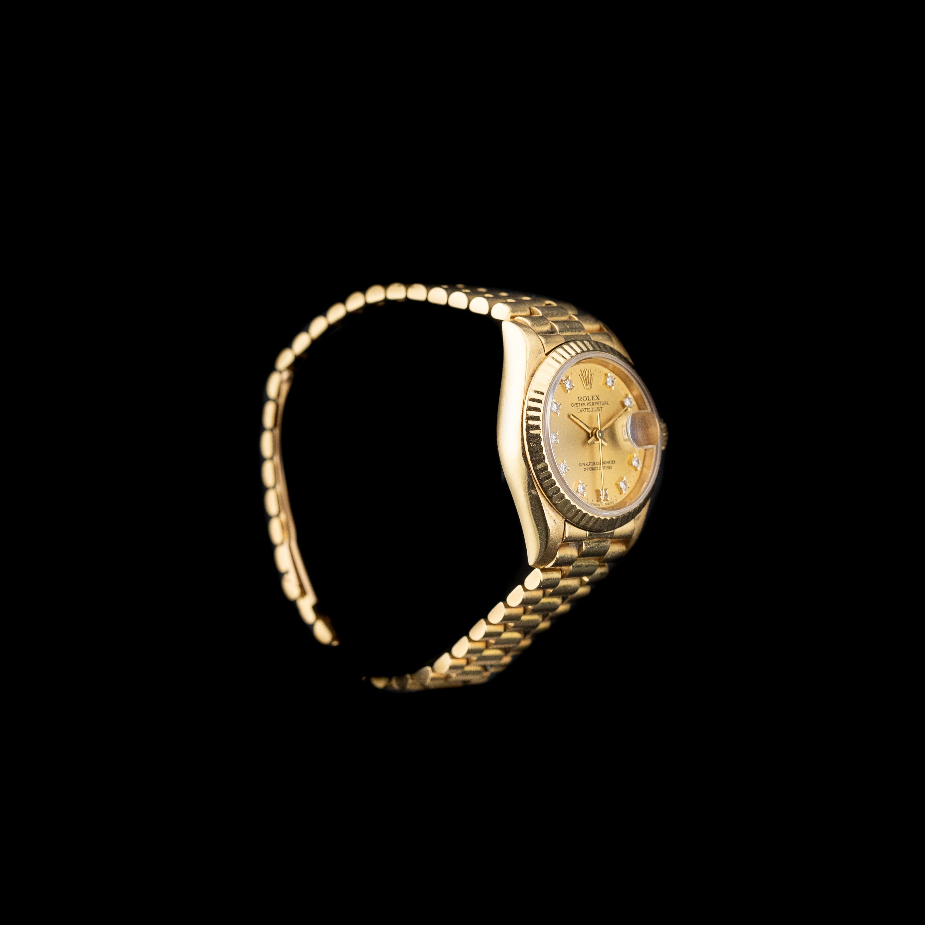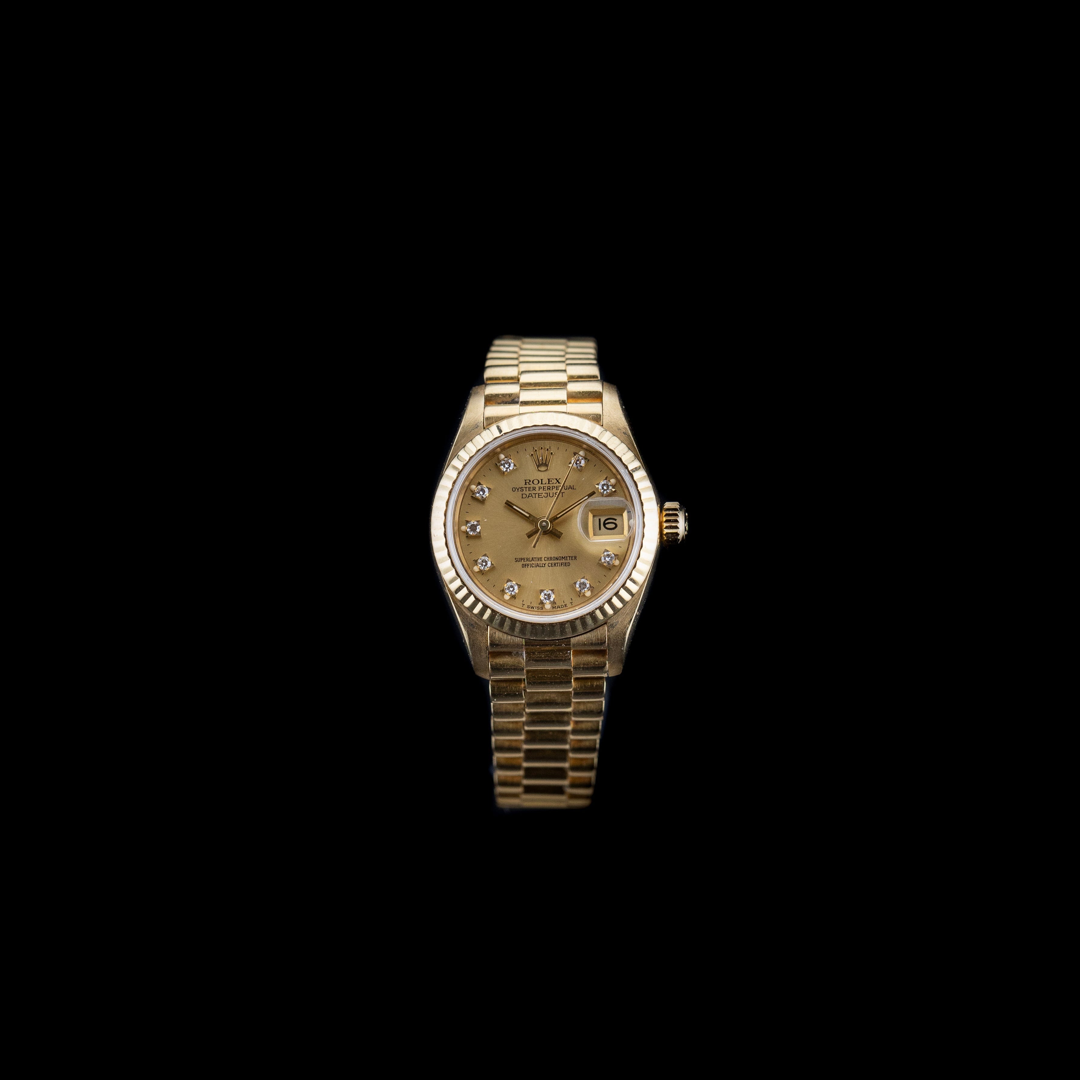 L'Atelier du temps à le plaisir de vous présenter cette rare Rolex Lady Datejust «Diamond index » ("Gold dial") datant de 1989.
