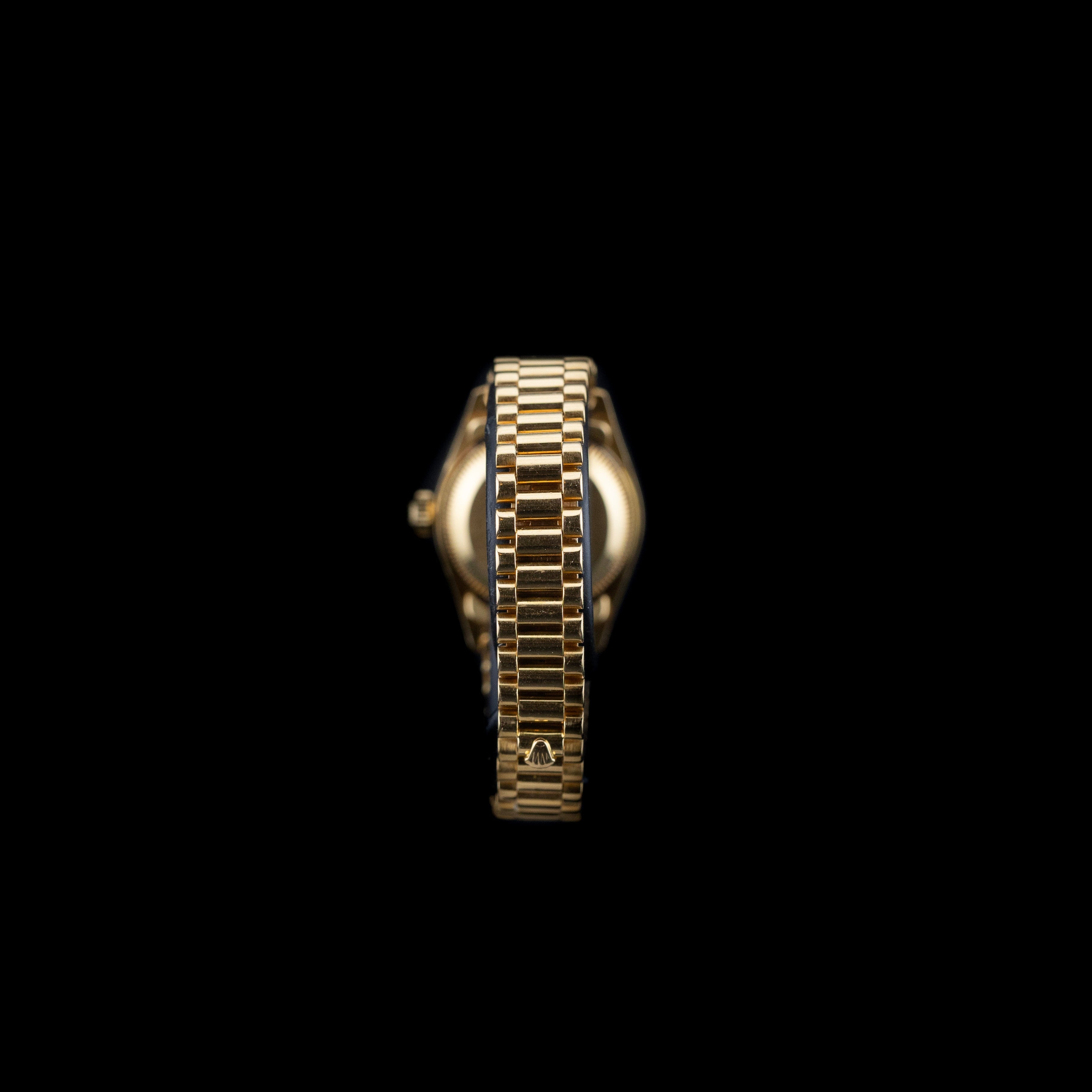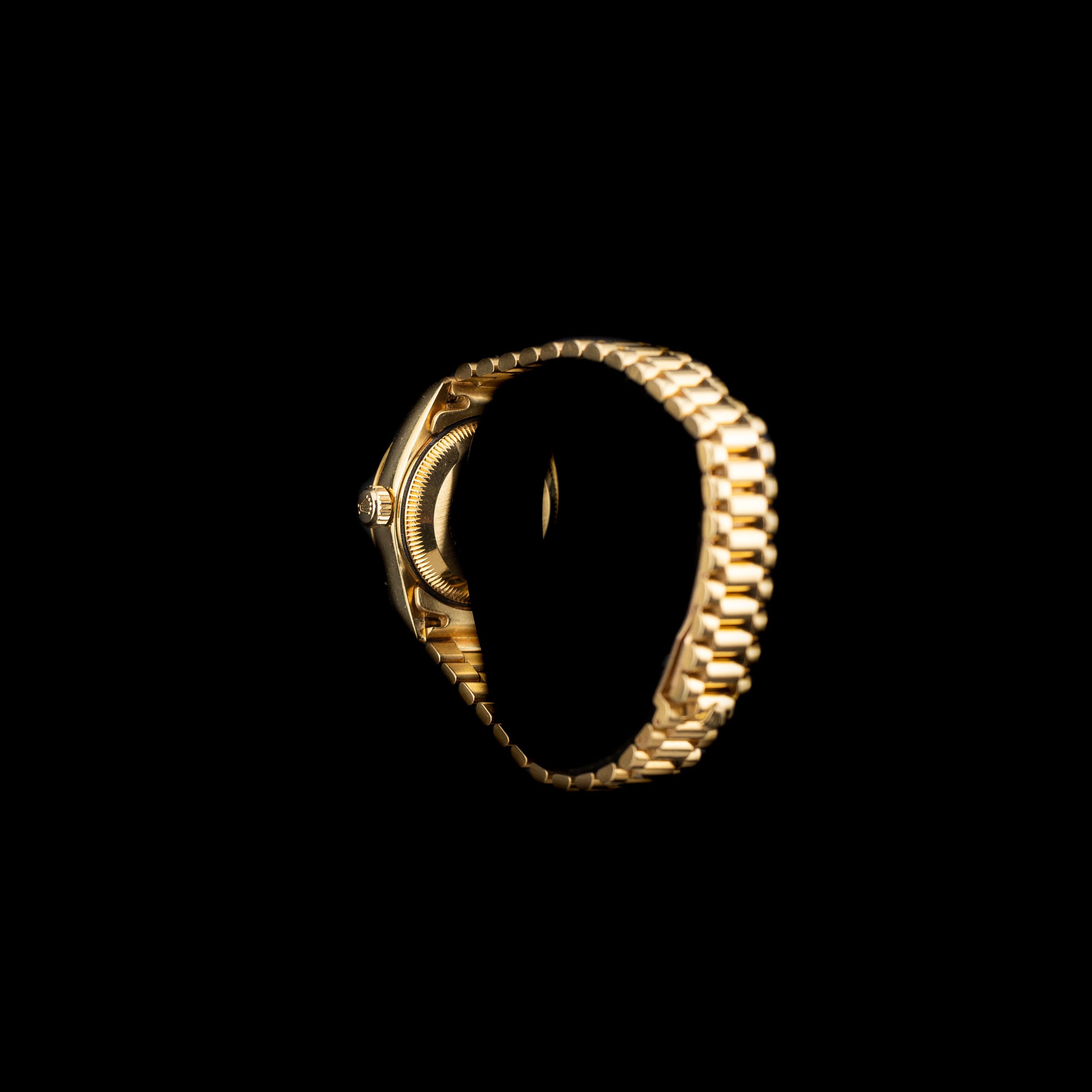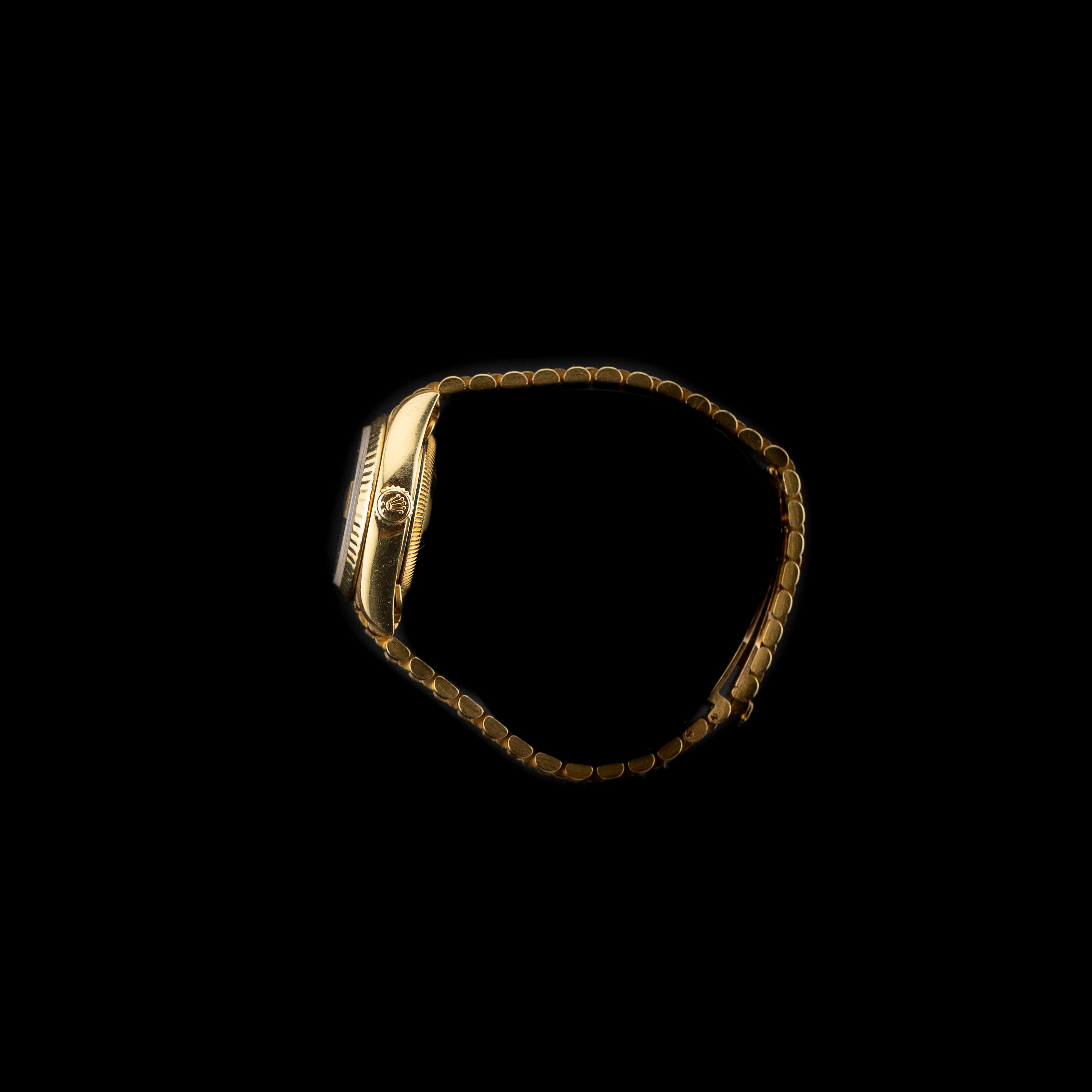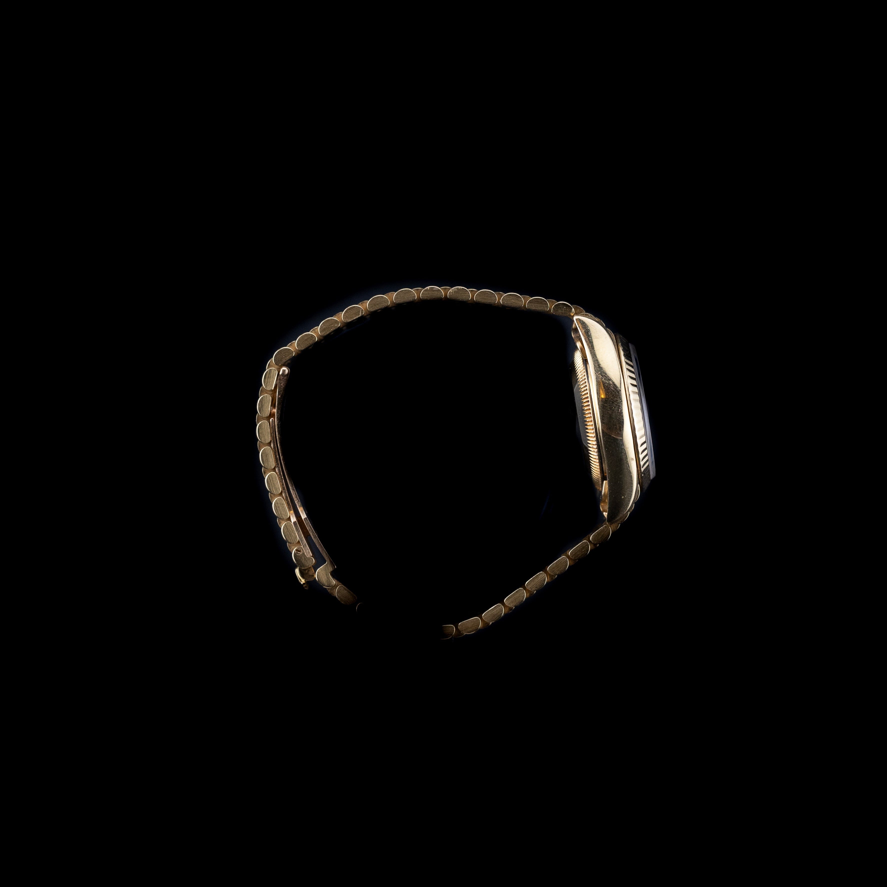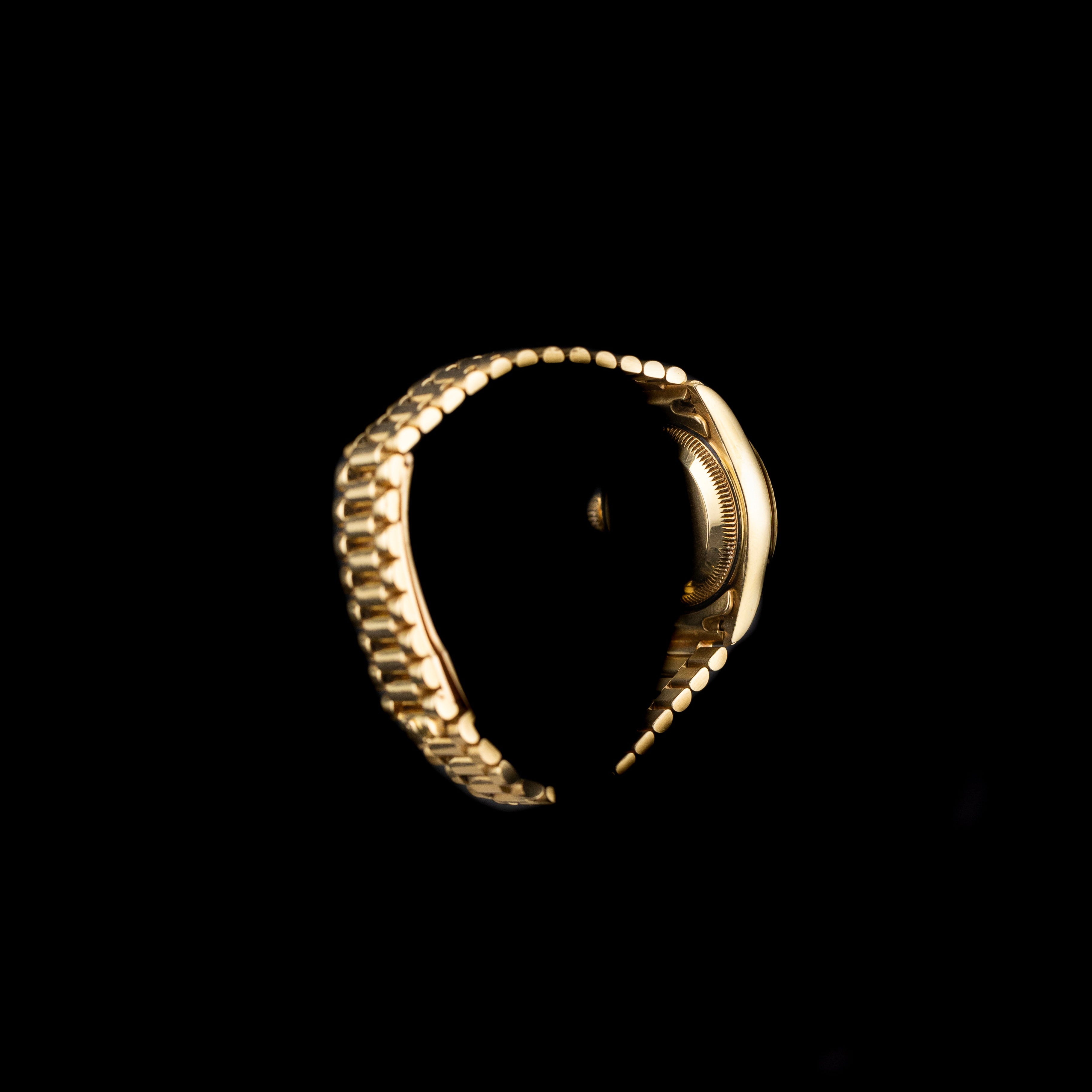 Le regard est immédiatement attiré par son somptueux cadran or, à la fois lumineux et raffiné. Celui-ci est magnifié par de splendides index sertis de diamants, soigneusement sélectionnés et sertis selon les standards d’excellence de Rolex. Chaque diamant apporte une touche de brillance délicate, créant un jeu de lumière subtil et élégant, sans jamais compromettre la lisibilité. L’ensemble dégage une impression de luxe maîtrisé et de sophistication intemporelle.