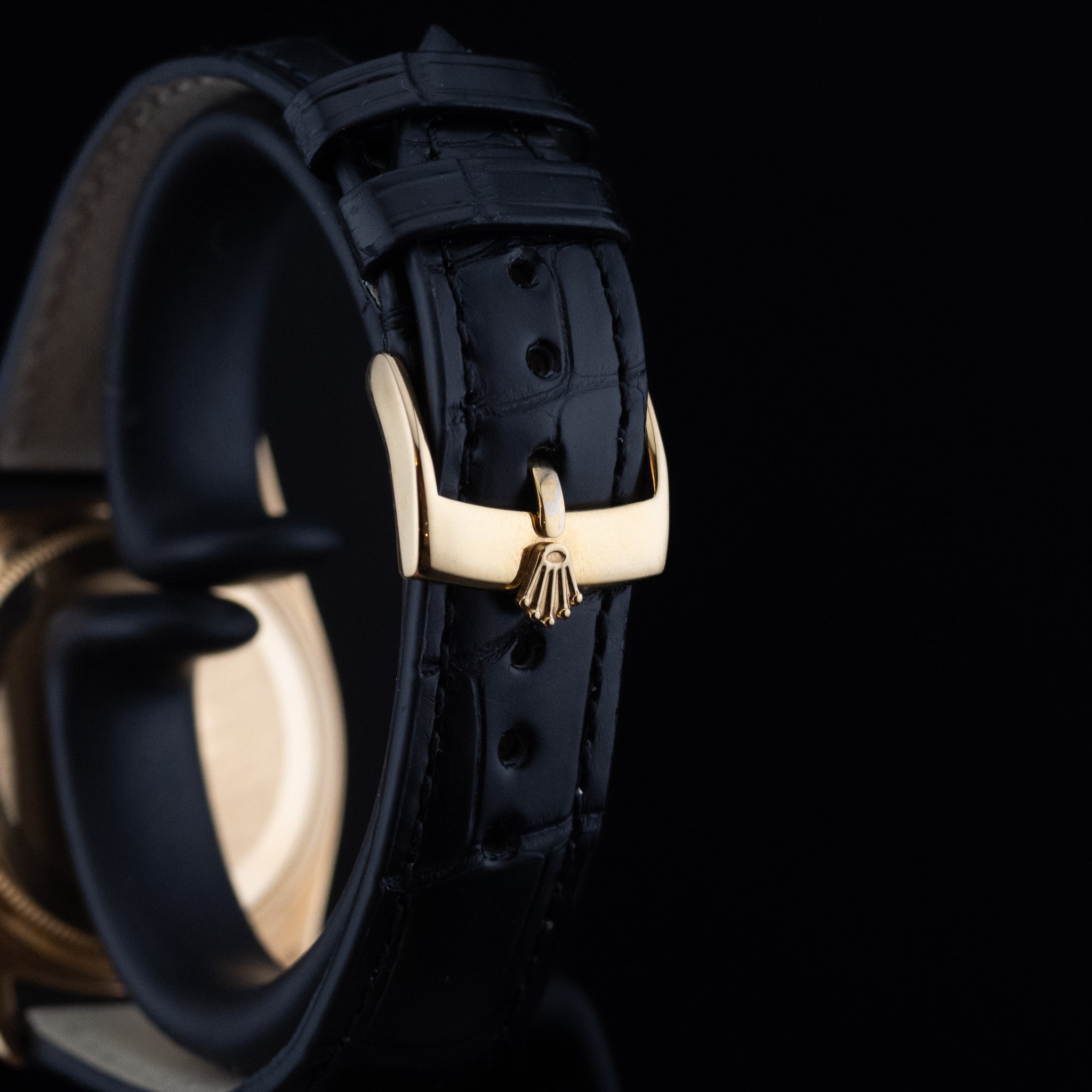 La montre est montée sur un bracelet en cuir d’alligator noir, élégant et raffiné, qui contraste parfaitement avec la chaleur de l’or jaune du boîtier. Il est complété par une boucle ardillon Rolex d’origine, garantissant cohérence, authenticité et confort au porter.