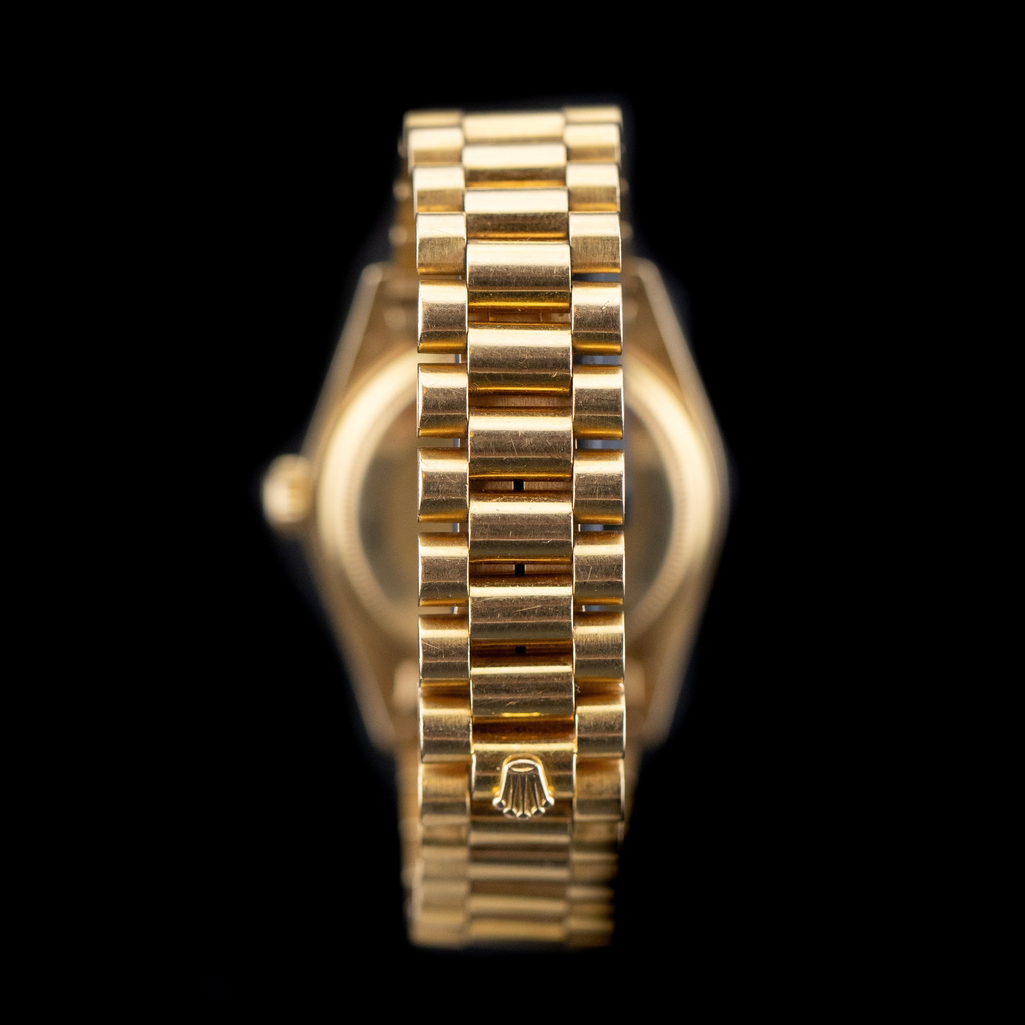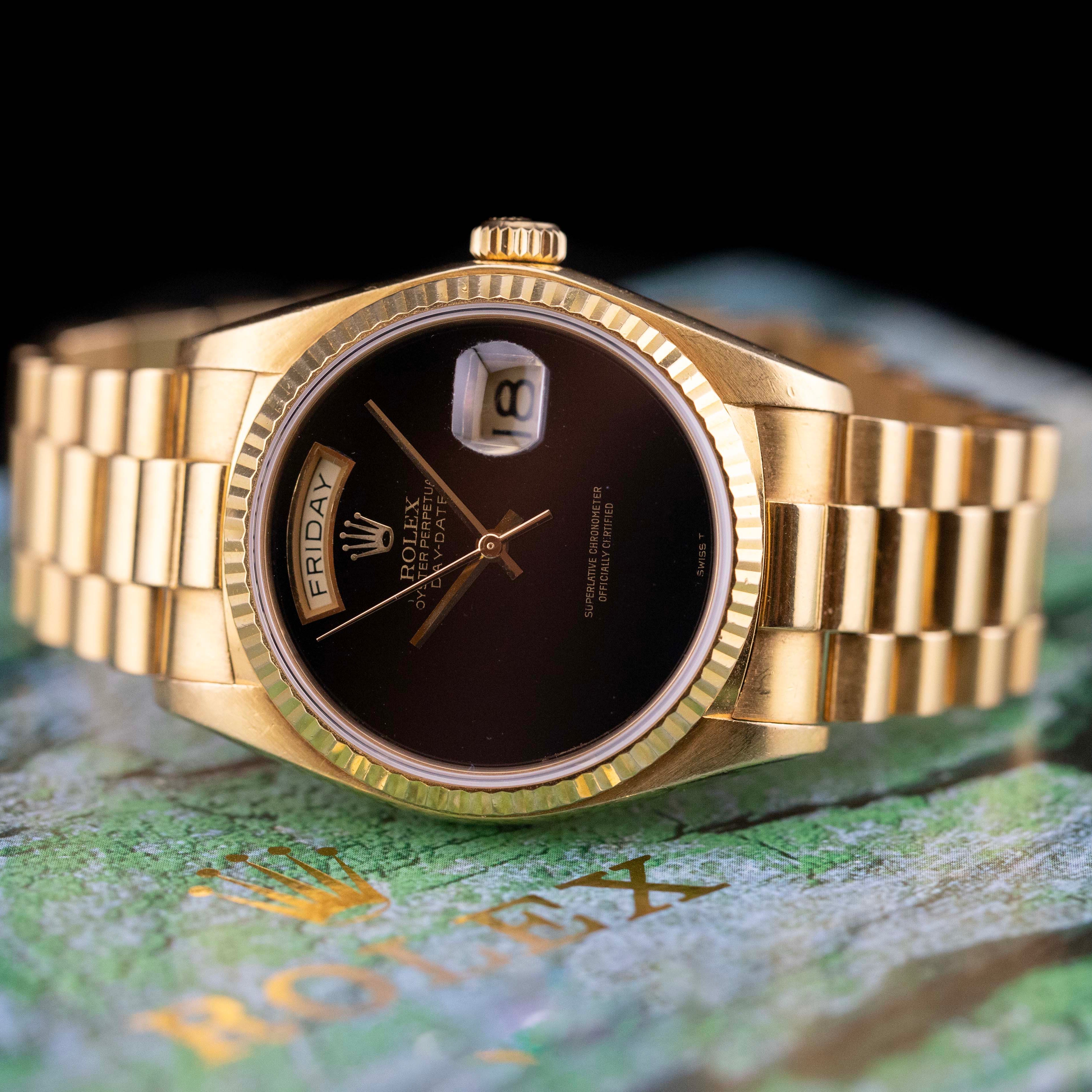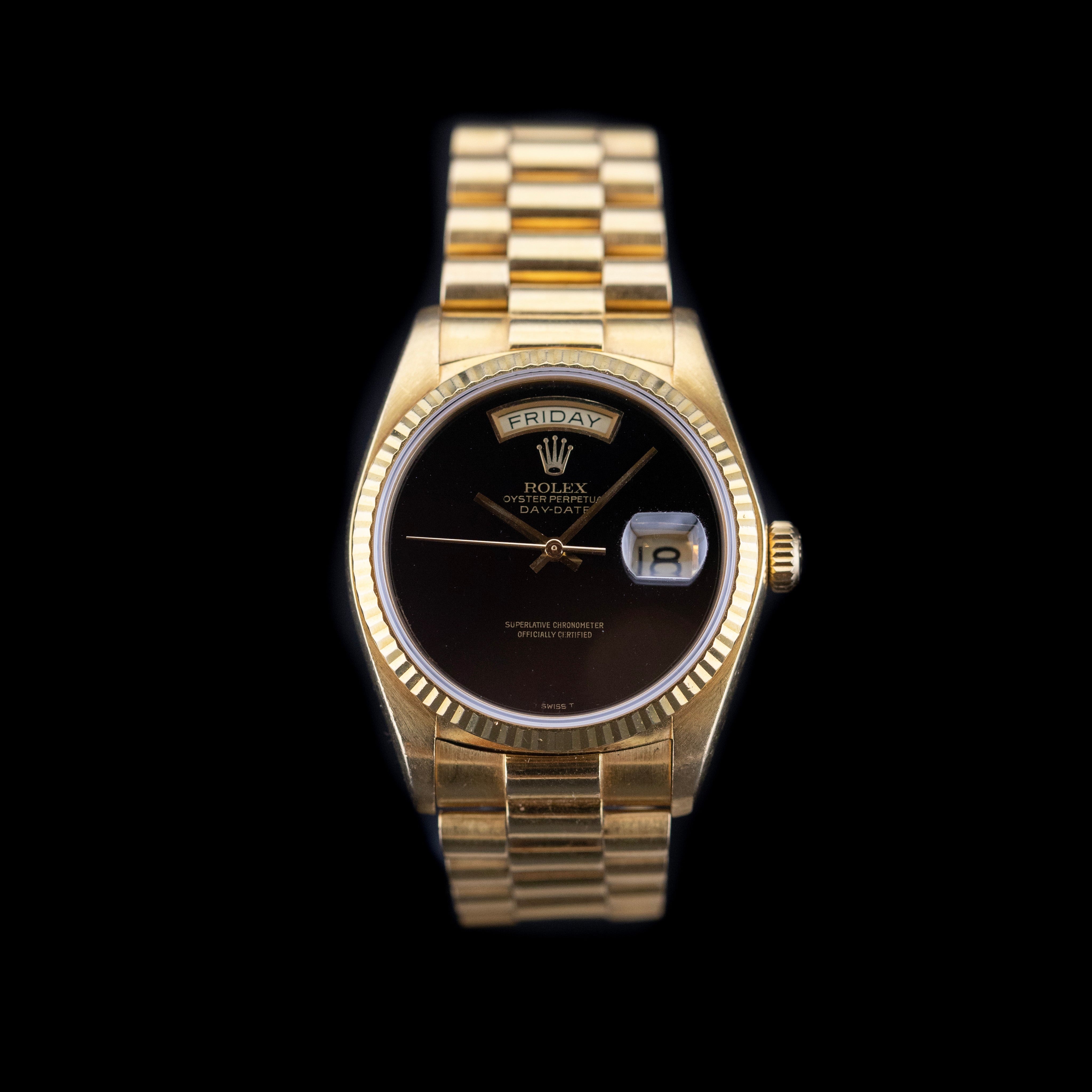 L'Atelier du temps à le plaisir de vous présenter cette luxueuse Rolex Day Date « Onyx » ("Black dial") datant de 1980’s.