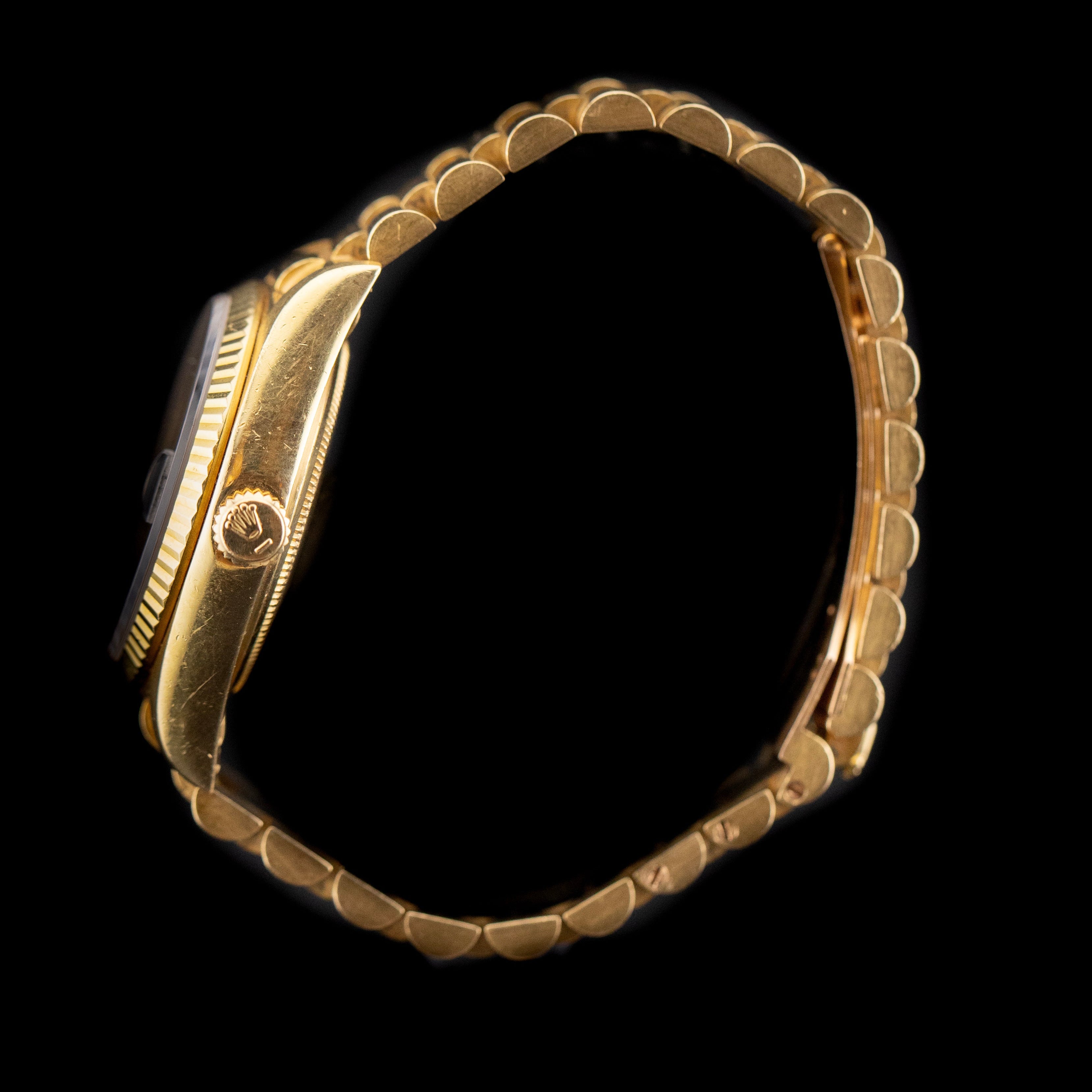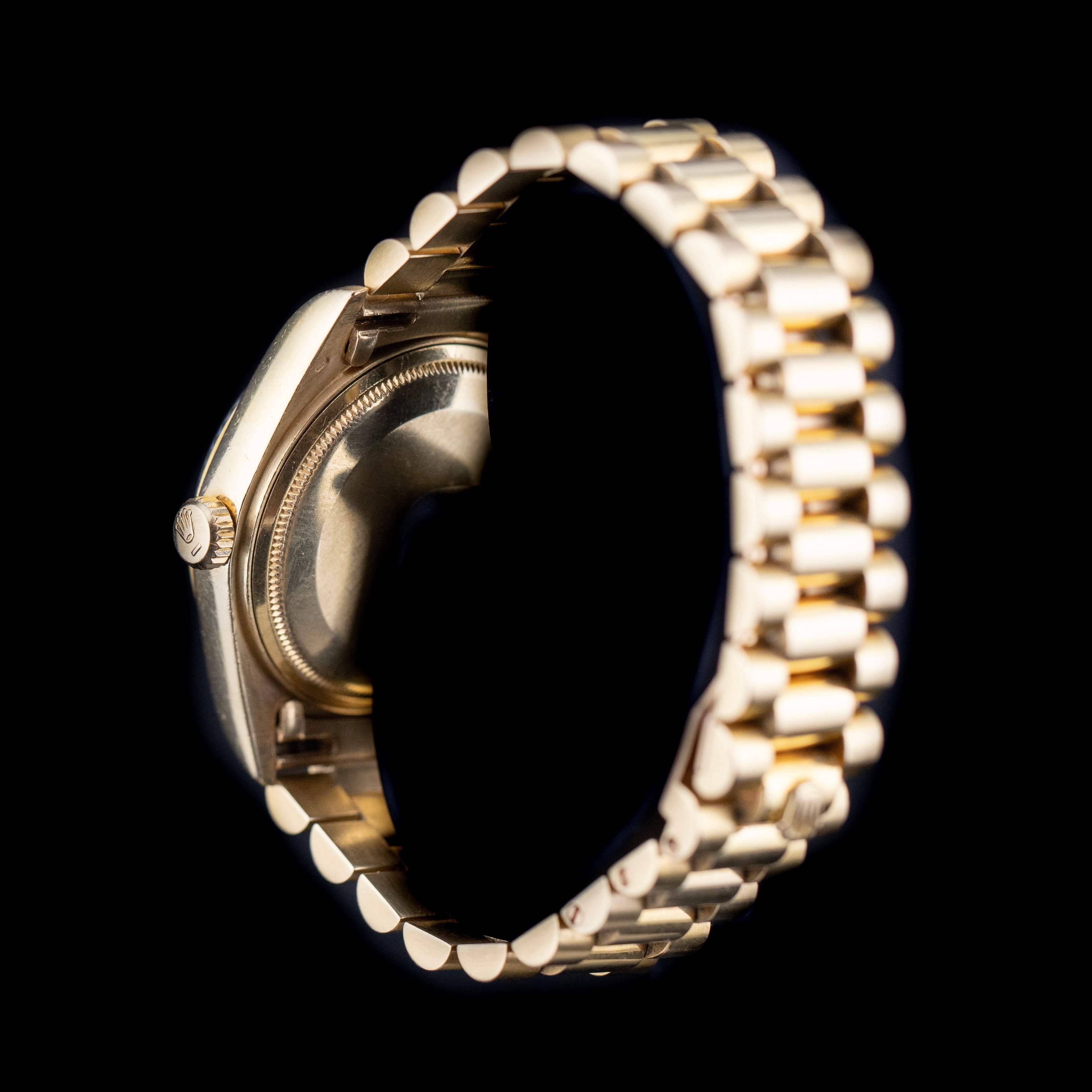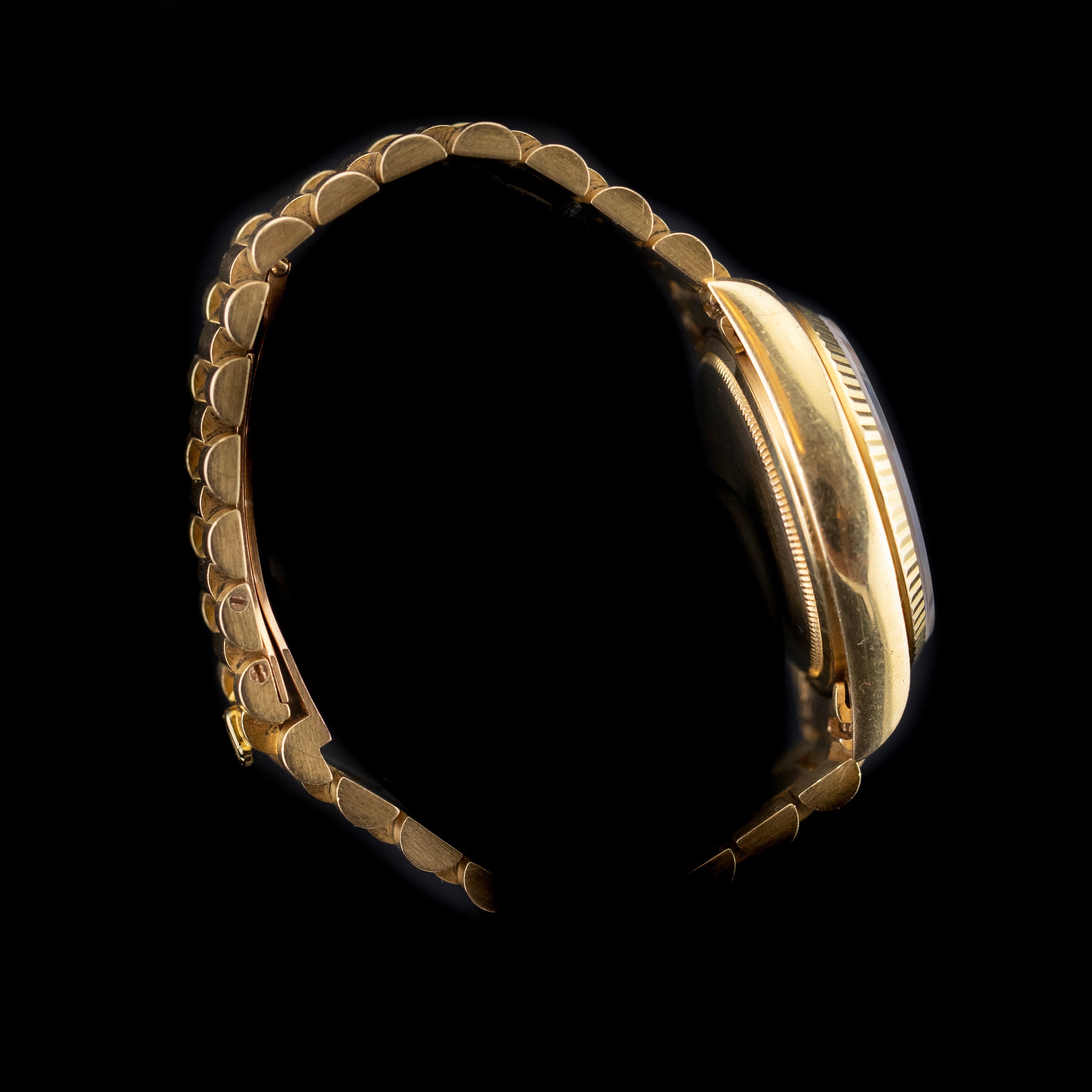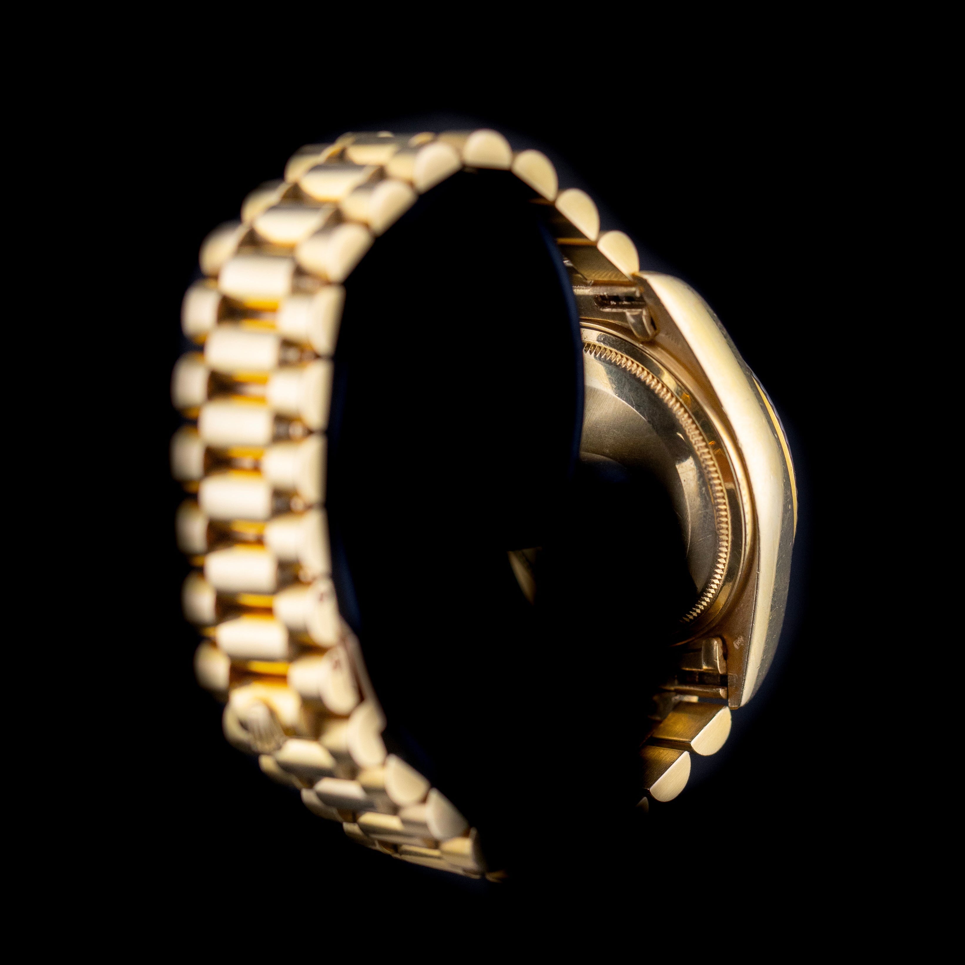 Le bracelet President, également en or jaune 18k, complète l’ensemble avec sa silhouette iconique à trois maillons semi-circulaires, à la fois souple, dense et résolument chic. Il s’ajuste naturellement au poignet et conserve cette signature esthétique qui a traversé les décennies sans jamais perdre de sa noblesse. Le fermoir invisible, siglé Rolex, s’intègre parfaitement dans la ligne du bracelet.