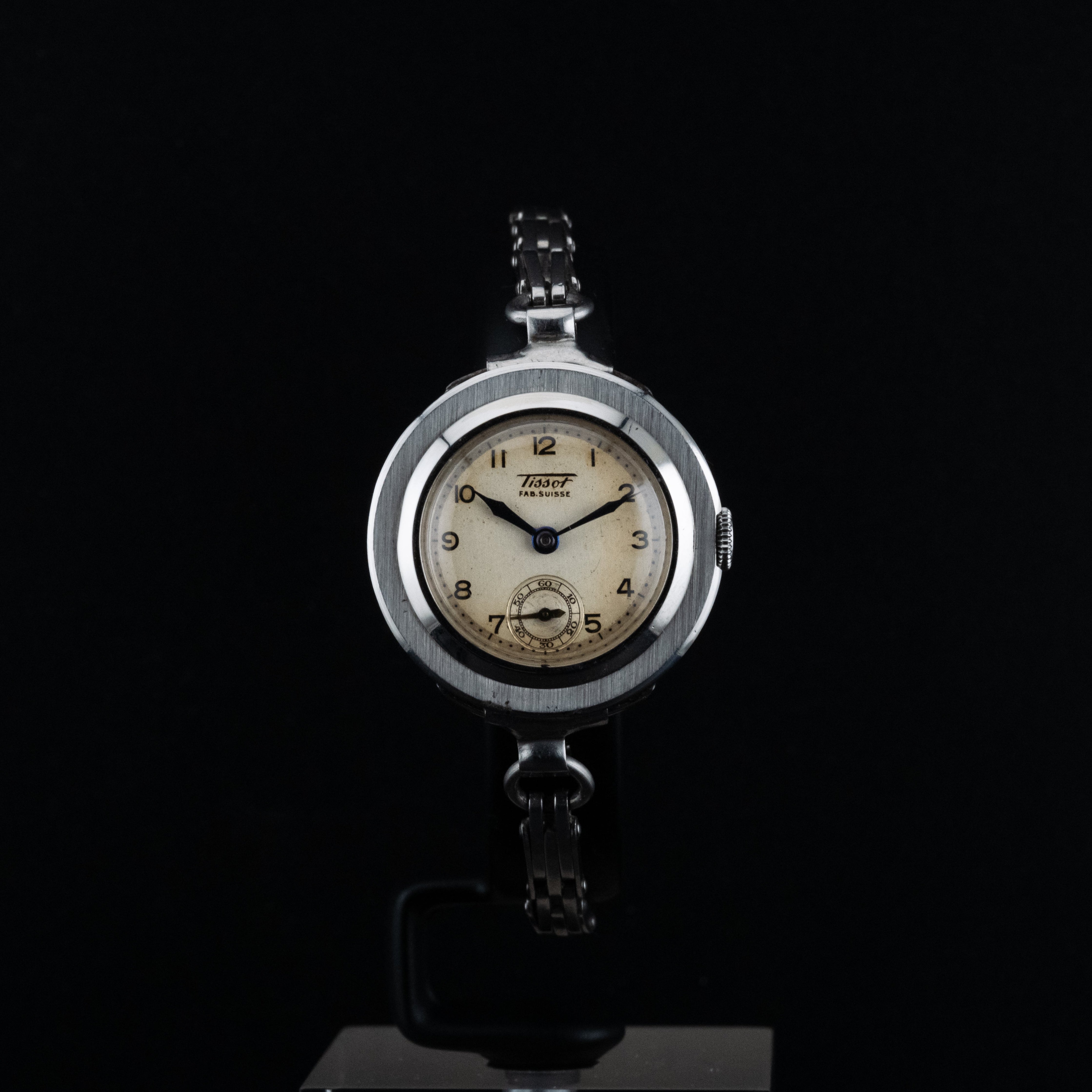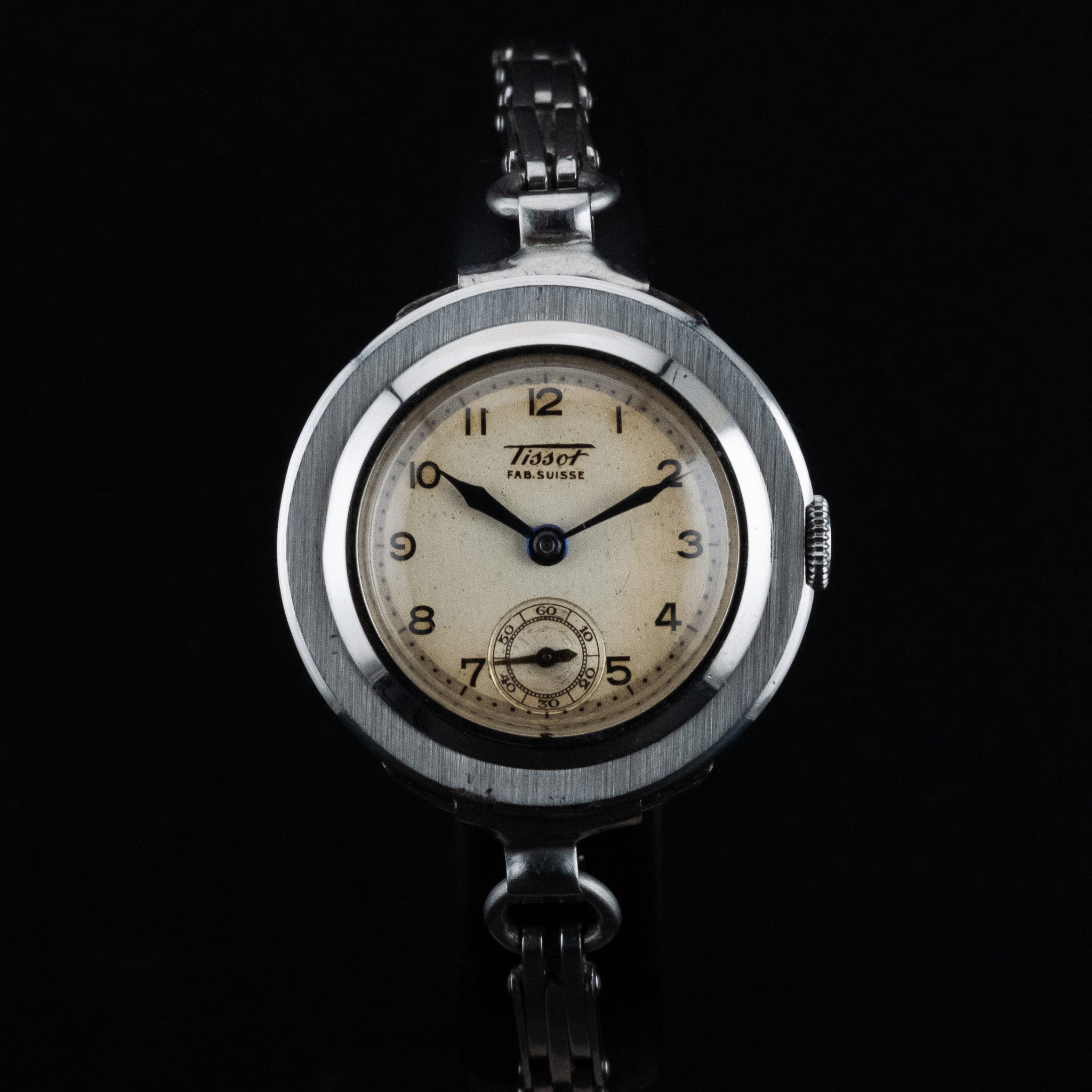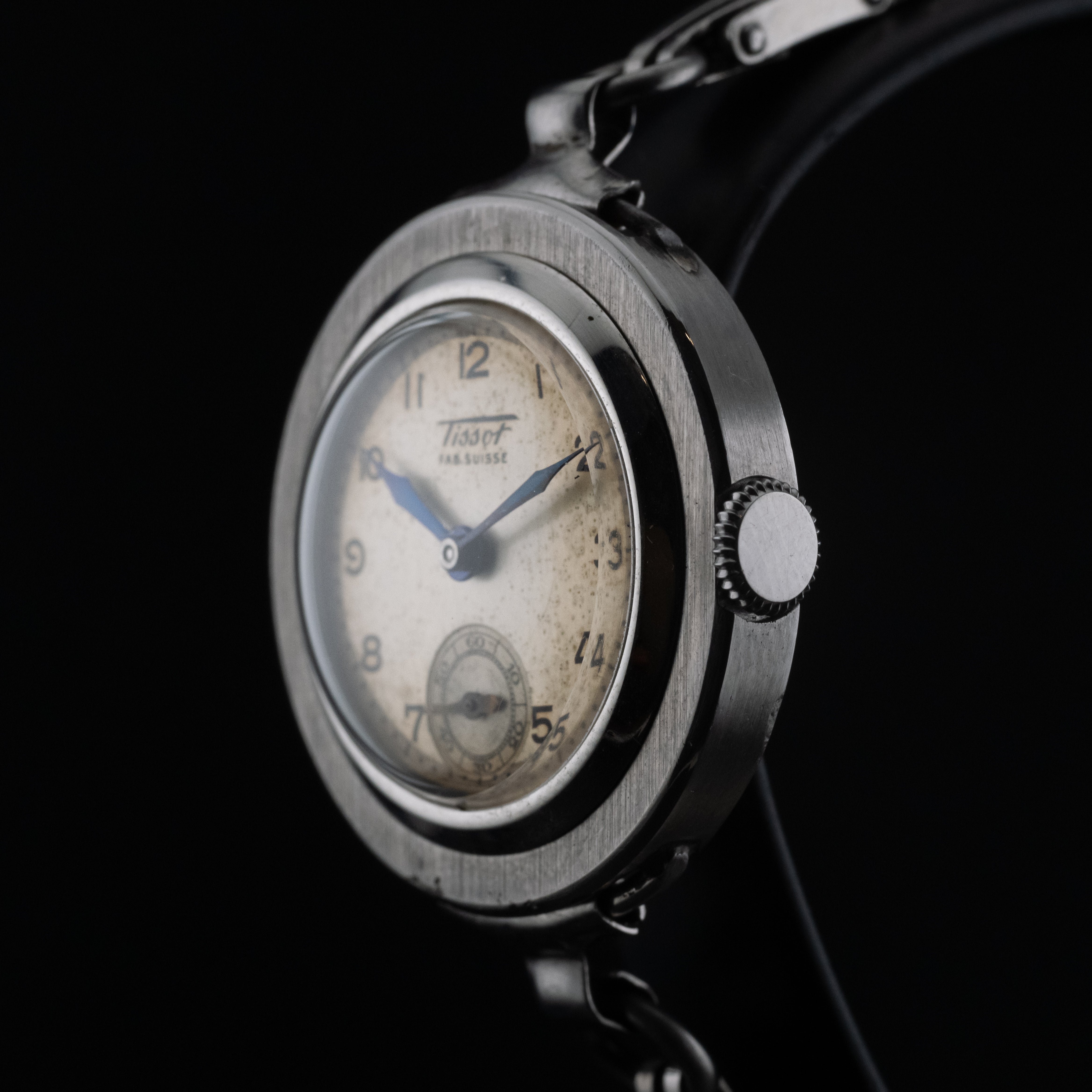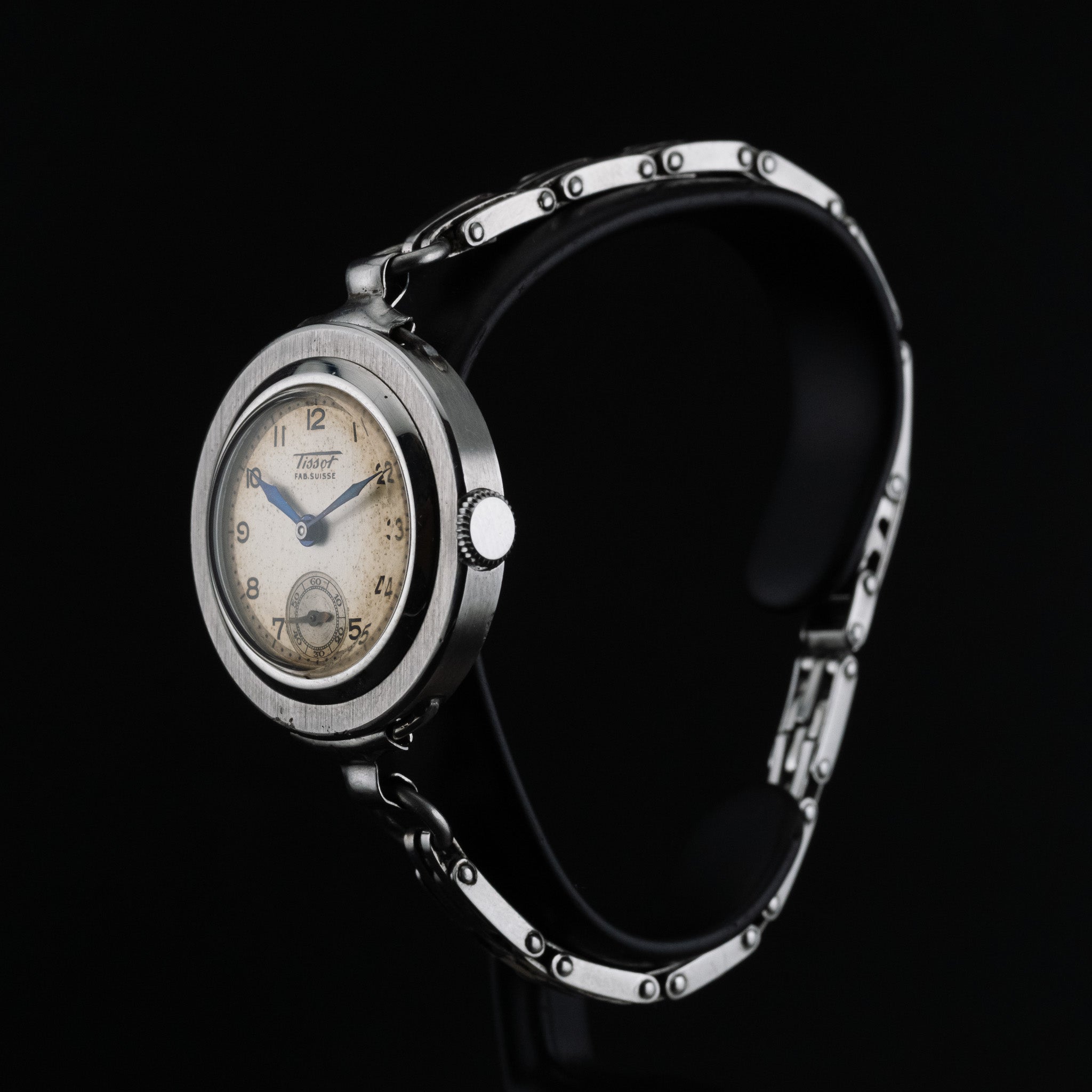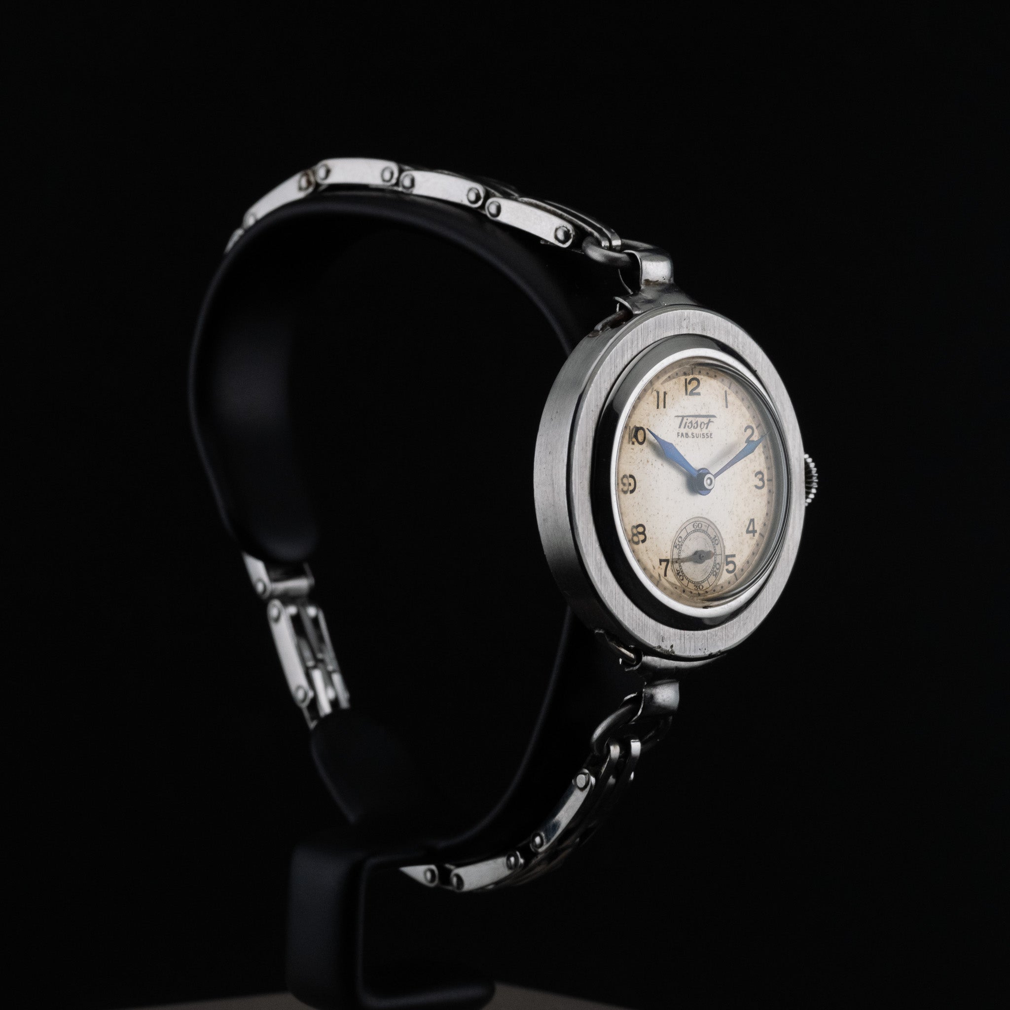 Son boîtier en acier de 20 mm présente des proportions délicates et équilibrées, idéales pour les amateurs de montres vintage au charme discret. Le cadran, sobre et lisible, est animé par une petite seconde positionnée avec élégance, apportant une touche de sophistication classique. L’ensemble reflète parfaitement l’esprit utilitaire et esthétique des montres suisses des années 1940, conçues pour durer tout en restant élégantes.