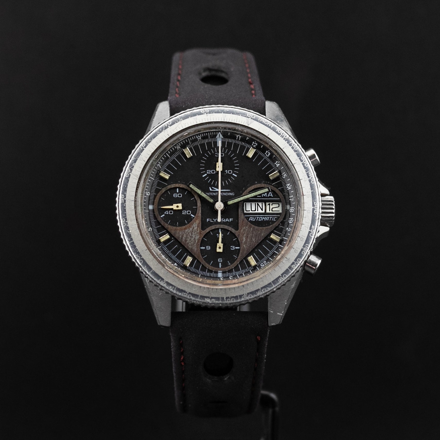 L'Atelier du Temps a le plaisir de vous présenter cette superbe Yéma Flygraf cadran anthracite équipé d'un Valjoux 7750, dans un parfait état d'origine.