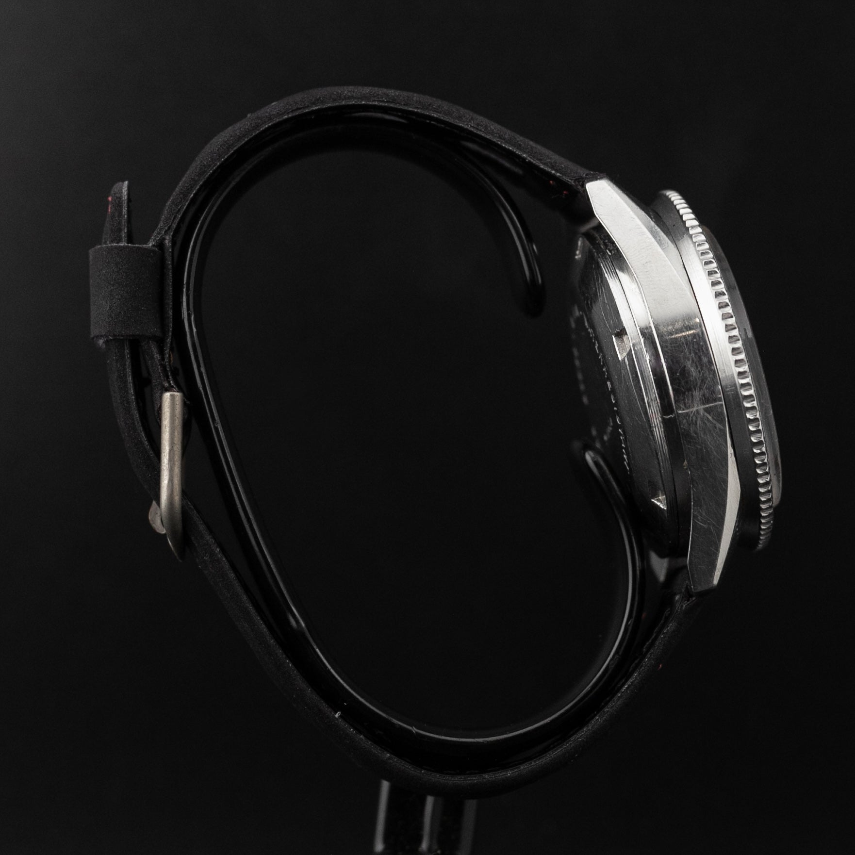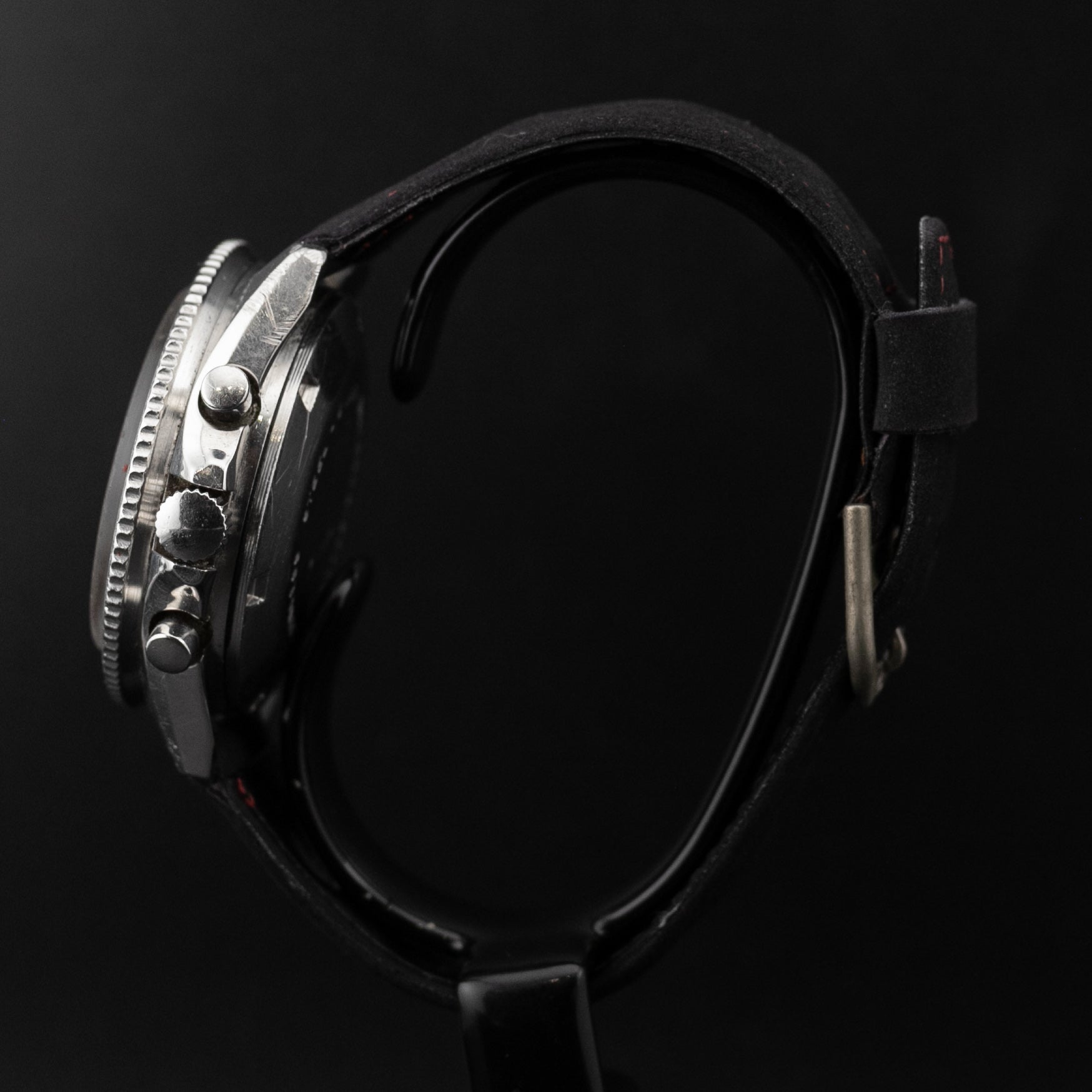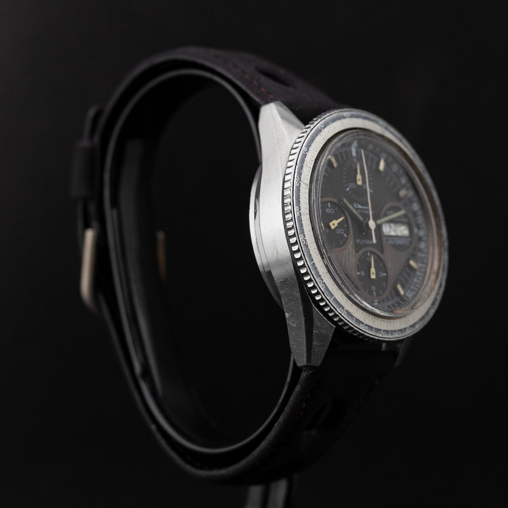 Son boitier en acier de 40 mm possède une belle patine et n'a pas été repoli. De même, la montre possède ses poussoirs et sa couronne d'origine. La lunette tachymétrique bi-directionnelle à pris une superbe patine de type Faded/Ghost.