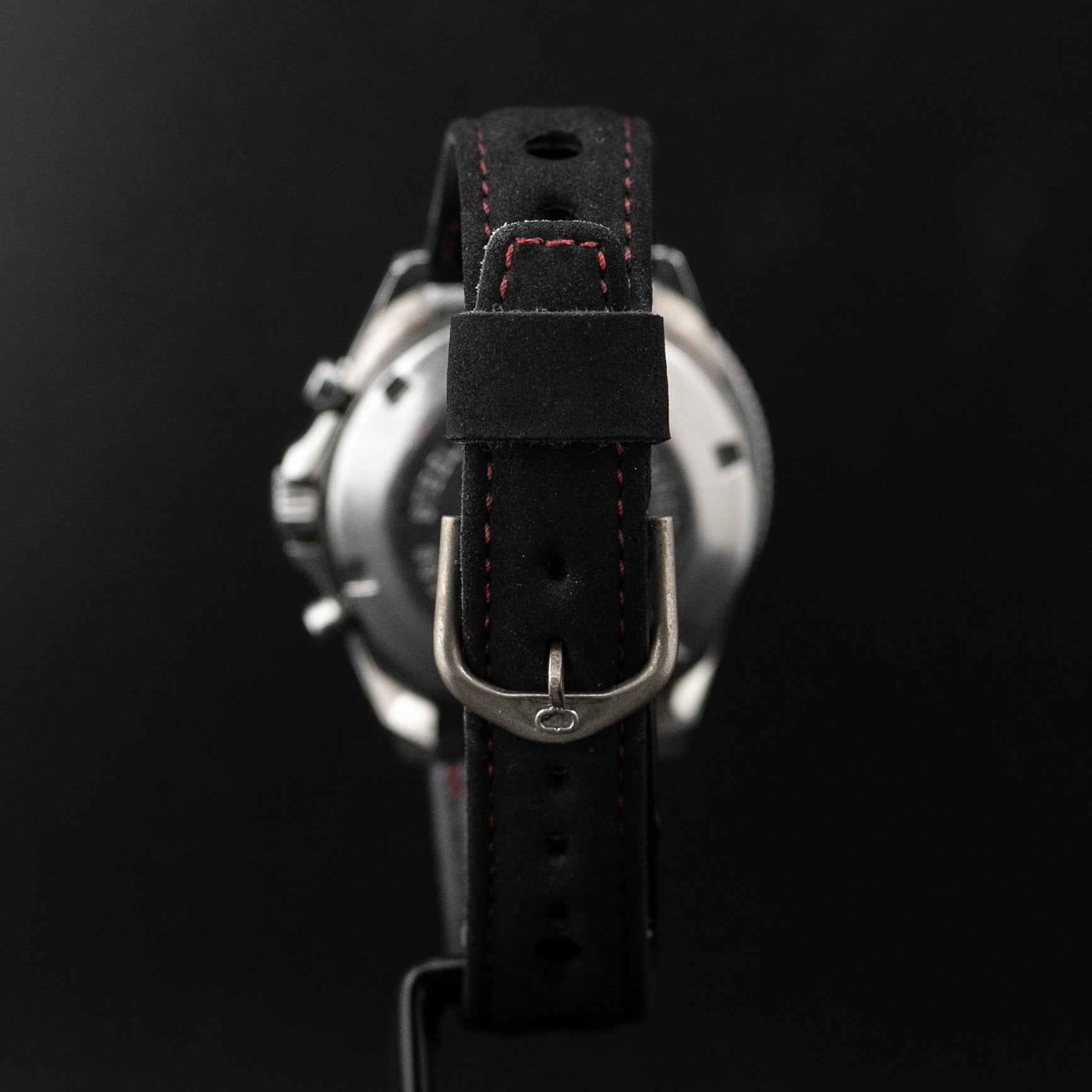 Afin de terminer l'ensemble, un bracelet d'époque type Rally de marque Corfam neuf d'époque à la montre, de couleur Violine surpiqué pourpre vient sublimer l'ensemble.