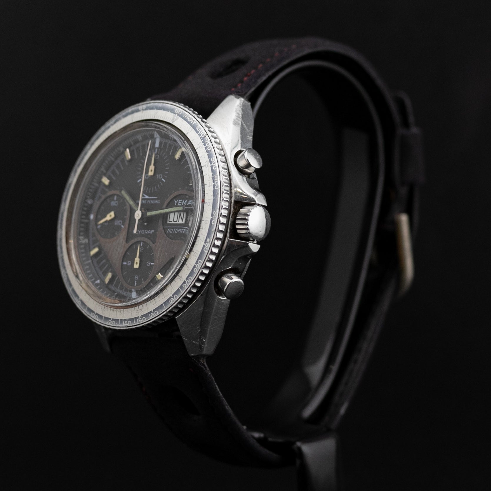 Son cadran anthracite a pris une patine homogène violette, de même que ses indexes passés crème. Ses superbes aiguilles ont toutes prise une patine venant sublimés la patine de chaque éléments du cadran.