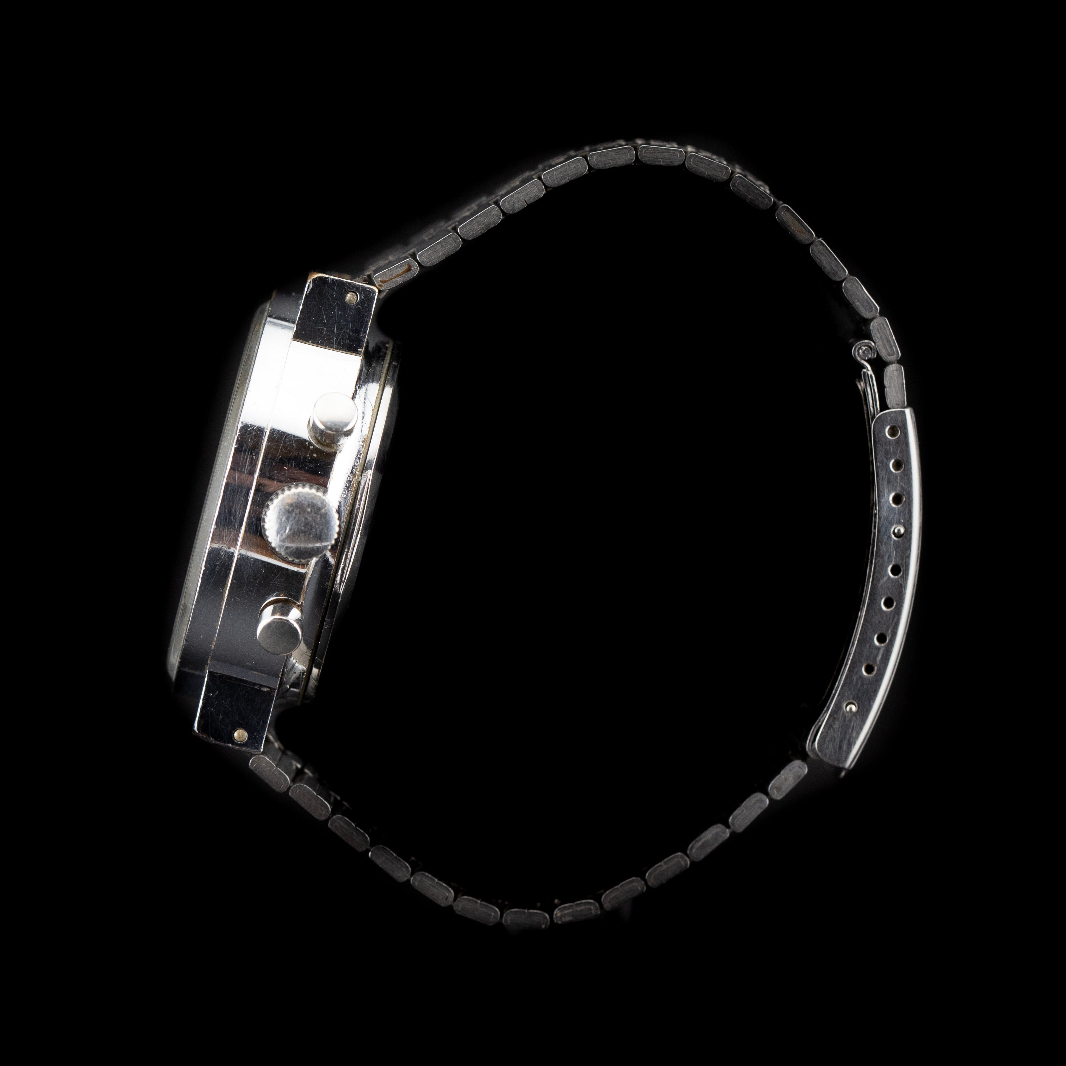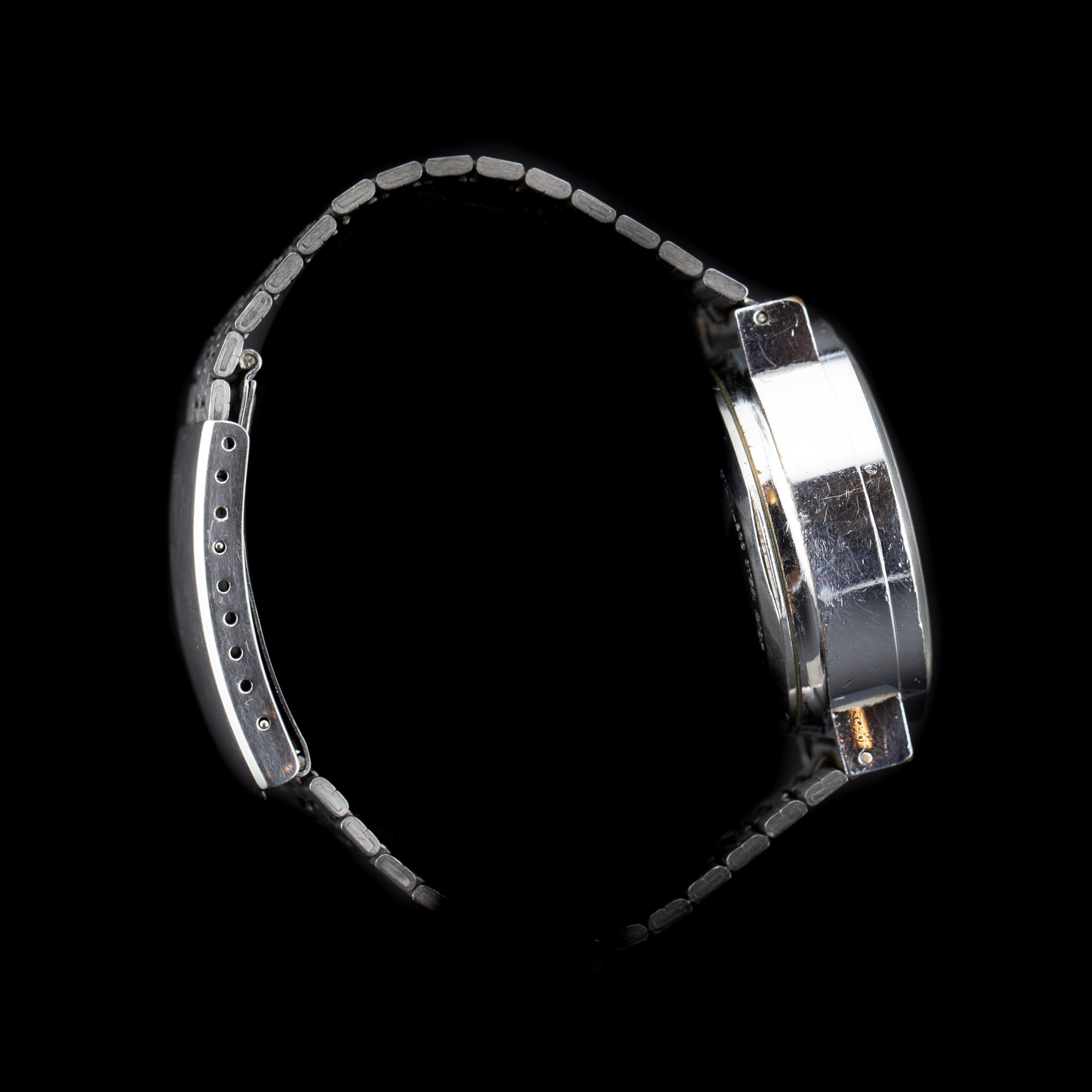 Mais c’est sans doute le boîtier en acier inoxydable, reconnaissable entre mille, qui confère à cette Yema tout son caractère. Compact, anguleux, typiquement seventies, il incarne l’identité visuelle de la marque à son apogée. Avec ses cornes courtes et son brossage horizontal, il offre une présence au poignet à la fois affirmée et confortable. La lunette tournante bidirectionnelle, en bakélite noire ou aluminium selon les versions, permet de mesurer avec précision les temps de plongée – une fonctionnalité essentielle pour les aventuriers des grands fonds comme pour les passionnés d’histoire horlogère.