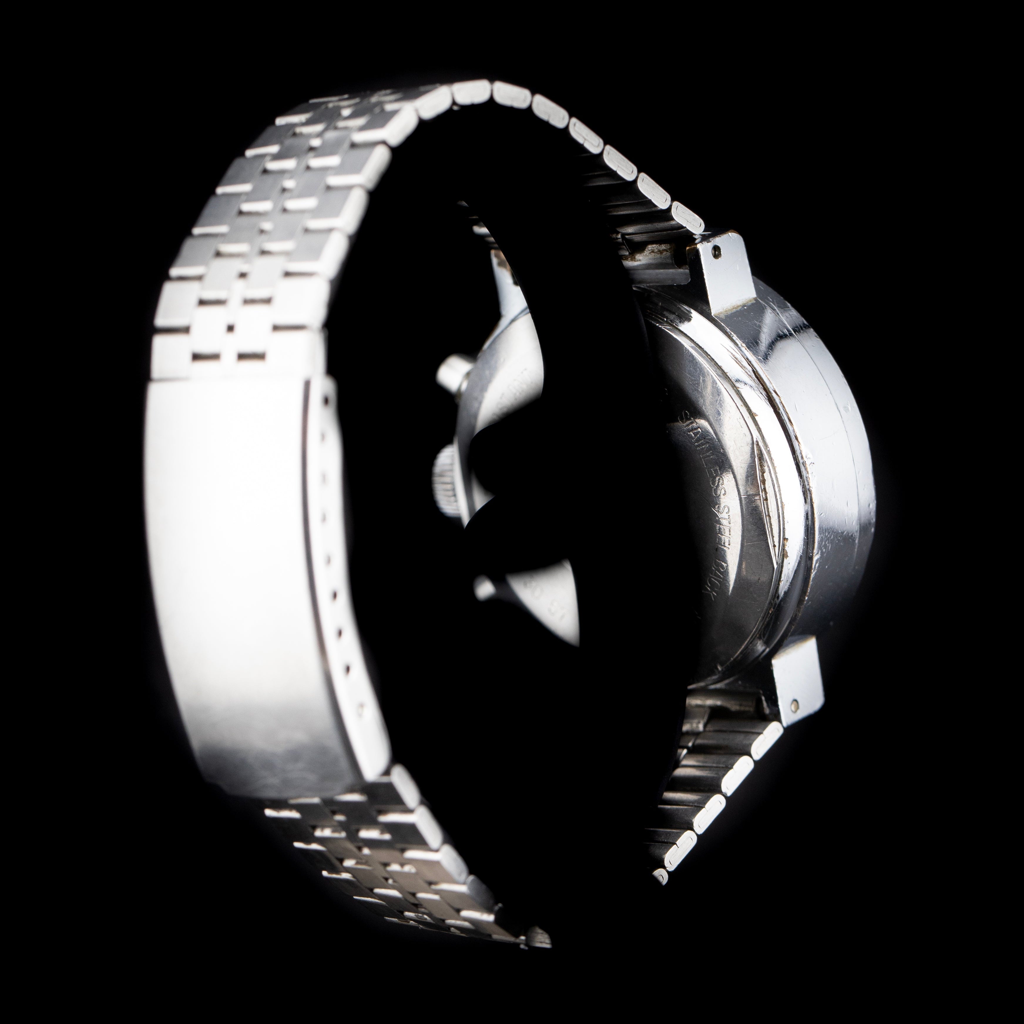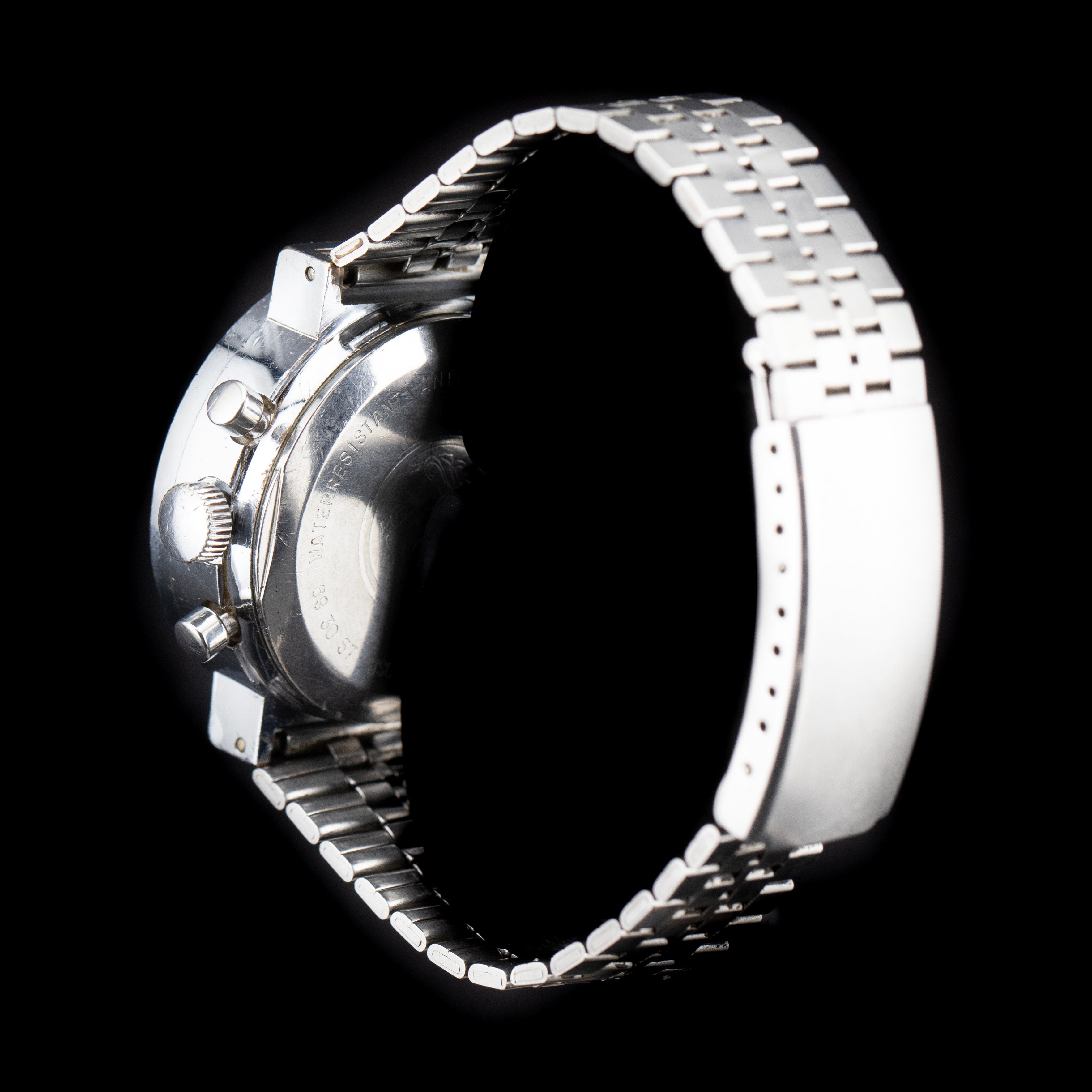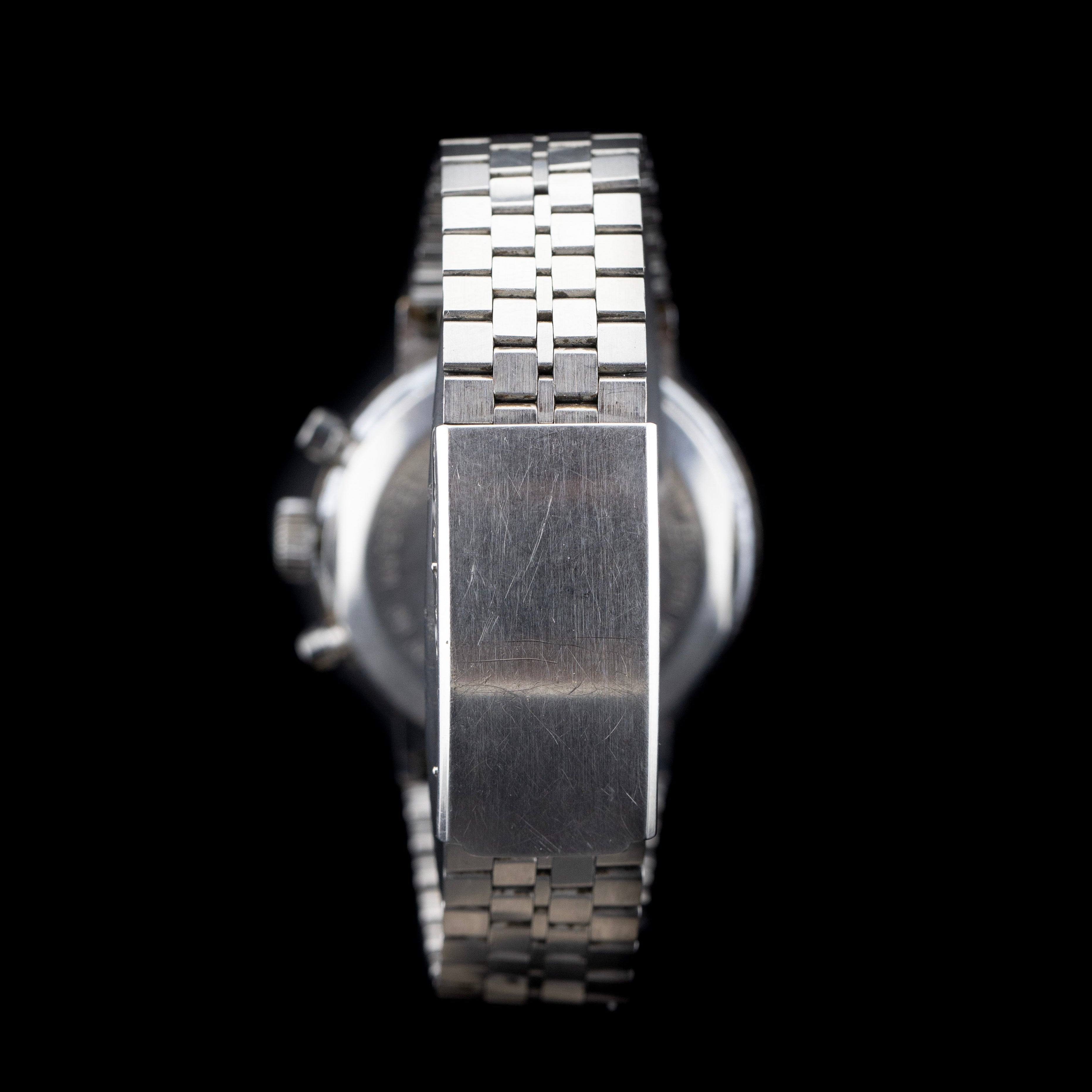 Au centre de cette montre bat l’un des calibres les plus légendaires de l’horlogerie mécanique : le Valjoux 7734. Mécanisme à remontage manuel réputé pour sa robustesse et sa fiabilité, il est également prisé pour son charme vintage incomparable, avec sa fonction chronographe 30 minutes et sa complication date à 6h. Le déclenchement ferme du poussoir, la fluidité de la trotteuse du chrono, et le « clic » net à la remise à zéro rappellent immédiatement le savoir-faire d’une époque révolue – une époque où chaque composant était pensé pour durer.